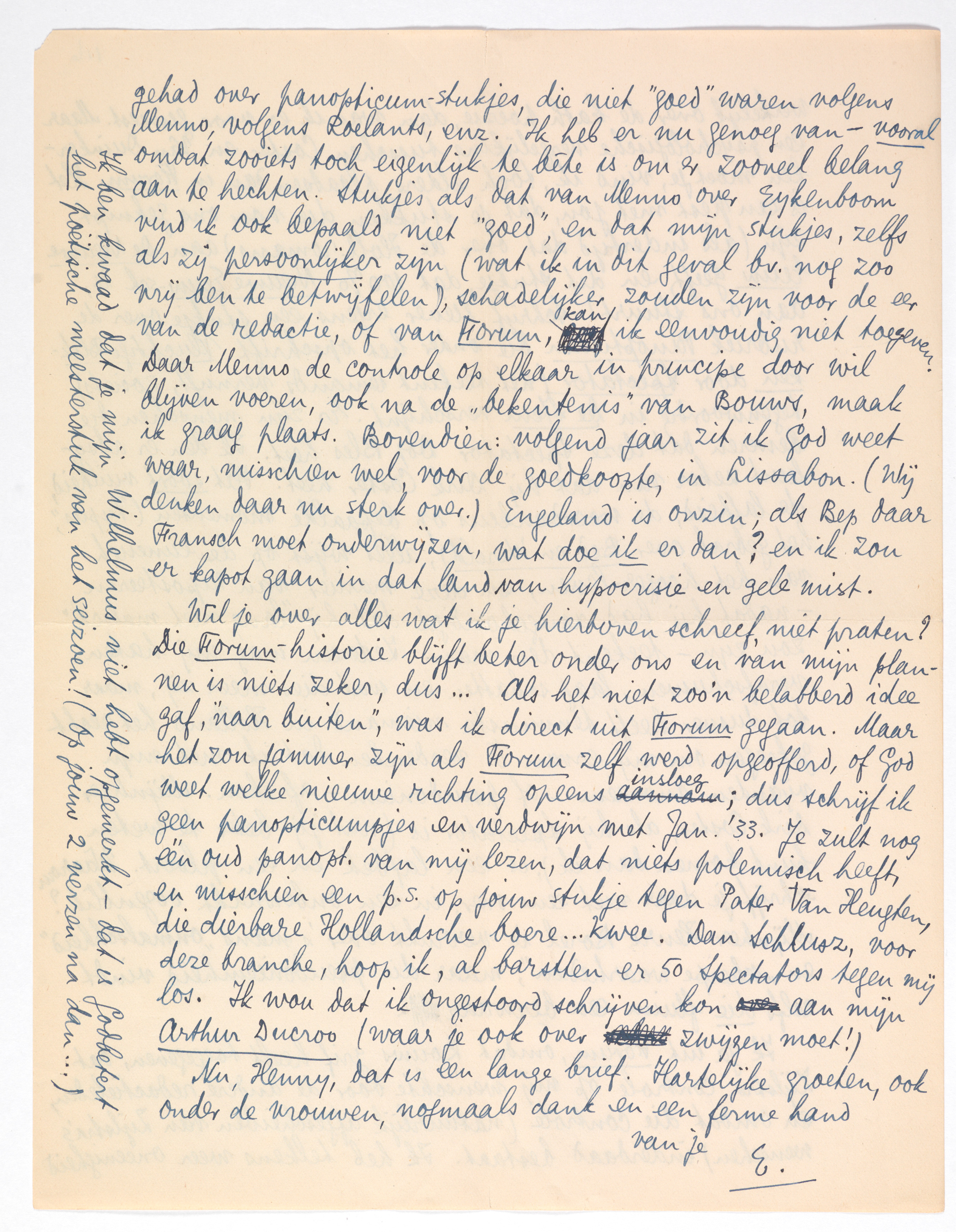 Ik ga uit Forum, omdat Bouws grif heeft toegegeven, dat Zijlstra controle op mij wenschte door de andere redactieleden, en omdat die controle (natuurlijk afgescheiden van Zijlstra's wenschen) inderdaad bestaat. Ik heb telkens weer oneenigheid gehad over panopticum-stukjes, die niet ‘goed’ waren volgens Menno, volgens Roelants, enz. Ik heb er nu genoeg van - vooral omdat zooiets toch eigenlijk te bête is om er zooveel belang aan te hechten. Stukjes als dat van Menno over Eykenboom2588 vind ik ook bepaald niet ‘goed’, en dat mijn stukjes, zelfs als zij persoonlijker zijn (wat ik in dit geval bv. nog zoo vrij ben te betwijfelen), schadelijker zouden zijn voor de eer van de redactie, of van Forum, kan ik eenvoudig niet toegeven. Daar Menno de controle op elkaar in principe door wil blijven voeren, ook na de ‘bekentenis’ van Bouws, maak ik graag plaats. Bovendien: volgend jaar zit ik God weet waar, misschien wel, voor de goedkoopte, in Lissabon. (Wij denken daar nu sterk over.) Engeland is onzin; als Bep daar Fransch moet onderwijzen, wat doe ik er dan? en ik zou er kapot gaan in dat land van hypocrisie en gele mist.