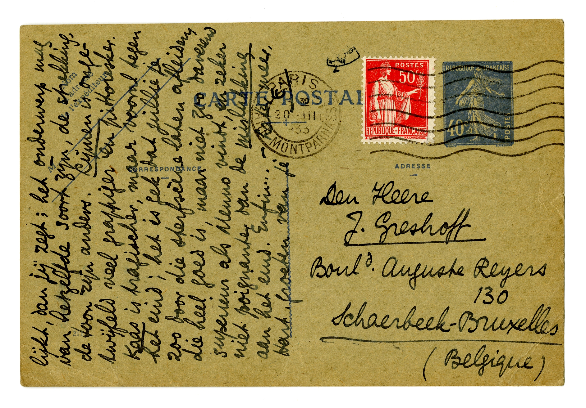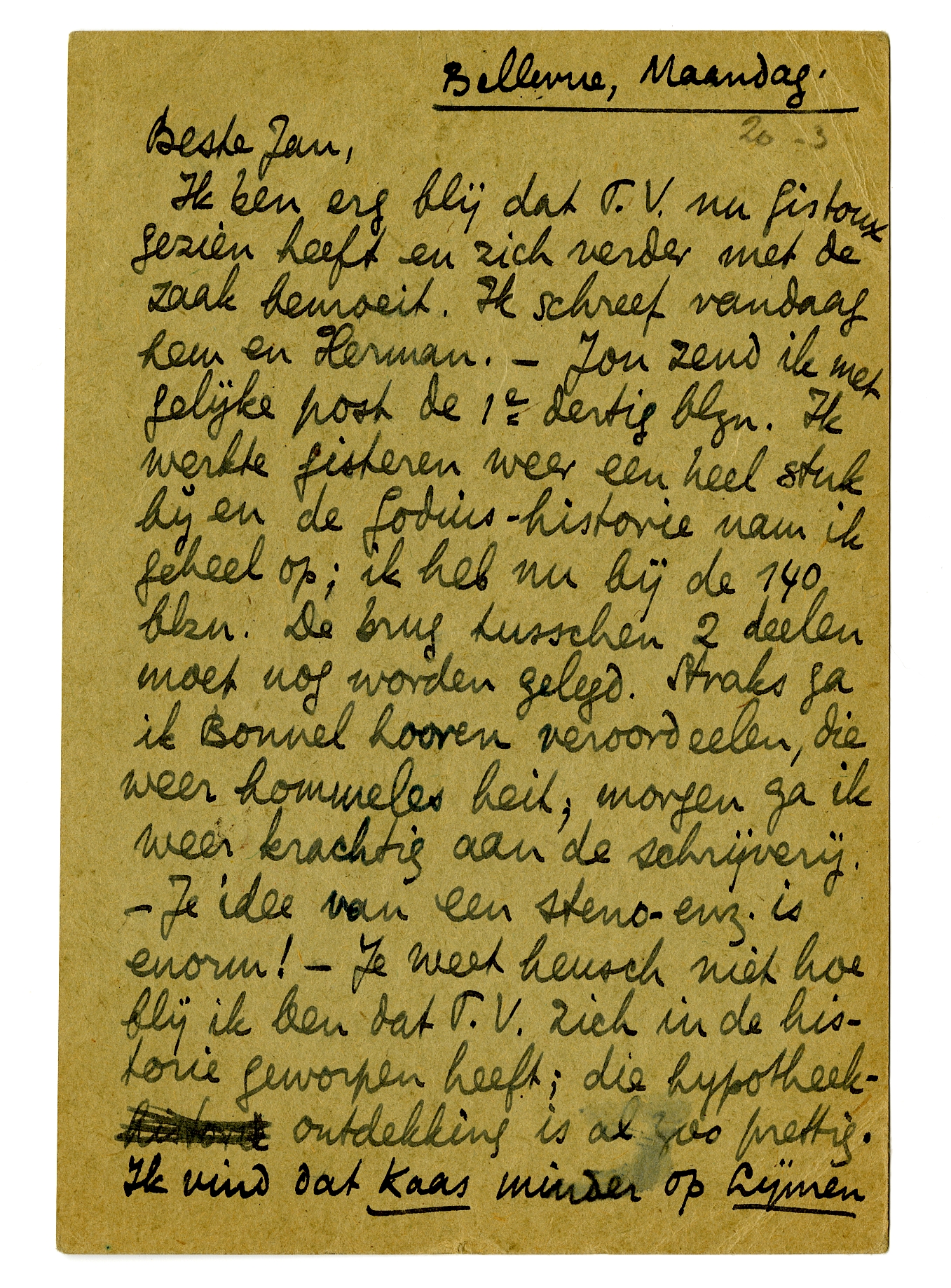 Ik ben erg blij dat T.V. nu Gistoux gezien heeft en zich verder met de zaak bemoeit. Ik schreef vandaag hem en Herman. - Jou zend ik met gelijke post de 1e dertig blzn. Ik werkte gisteren weer een heel stuk bij en de Godius-historie nam ik geheel op; ik heb nu bij de 140 blzn. De brug tusschen 2 deelen moet nog worden gelegd. Straks ga ik Bonnel hooren veroordeelen,2595 die weer hommeles heit; morgen ga ik weer krachtig aan de schrijverij. - Je idee van een steno-enz. is enorm! - Je weet heusch niet hoe blij ik ben dat T.V. zich in de historie geworpen heeft; die hypotheekontdekking is al zoo prettig. Ik vind dat Kaas minder op Lijmen lijkt, dan jij zegt; het onderwerp mag van hetzelfde soort zijn, de strekking, de toon zijn anders. Lij-men is ongetwijfeld veel grappiger en pittoresker. Kaas is tragischer, maar vooral tegen het eind; het is gek dat jullie je zoo door die sterfscène laten afleiden, die heel goed is, maar niet zoo daverend superieur als Menno vindt, en zeker niet poignanter dan de mislukking aan het eind. Enfin... - Later meer. Hart. groeten van je
