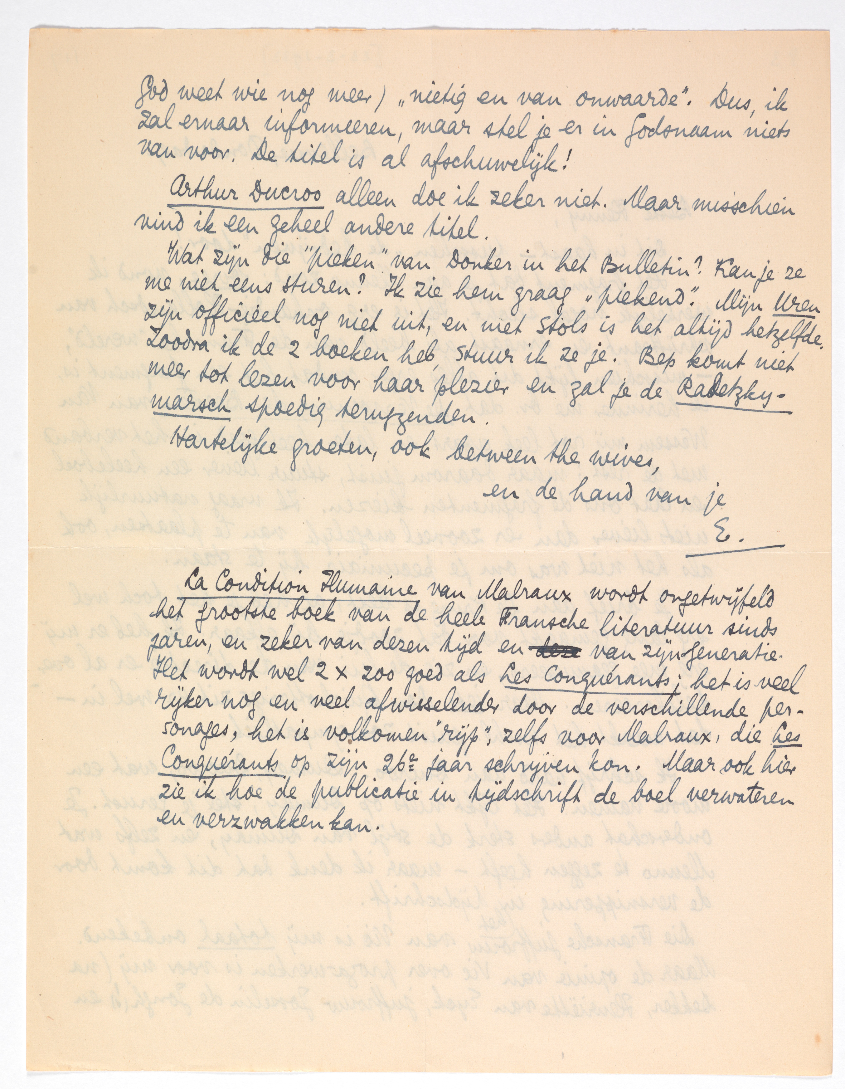 La Condition Humaine van Malraux wordt ongetwijfeld het grootste boek van de heele Fransche literatuur sinds jaren, en zeker van dezen tijd en van zijn generatie. Het wordt wel 2 × zoo goed als Les Conquérants; het is veel rijker nog en veel afwisselender door de verschillende personages, het is volkomen ‘rijp’, zelfs voor Malraux, die Les Conquérants op zijn 26e jaar schrijven kon. Maar ook hier zie ik hoe de publicatie in tijdschrift de boel verwateren en verzwakken kan.