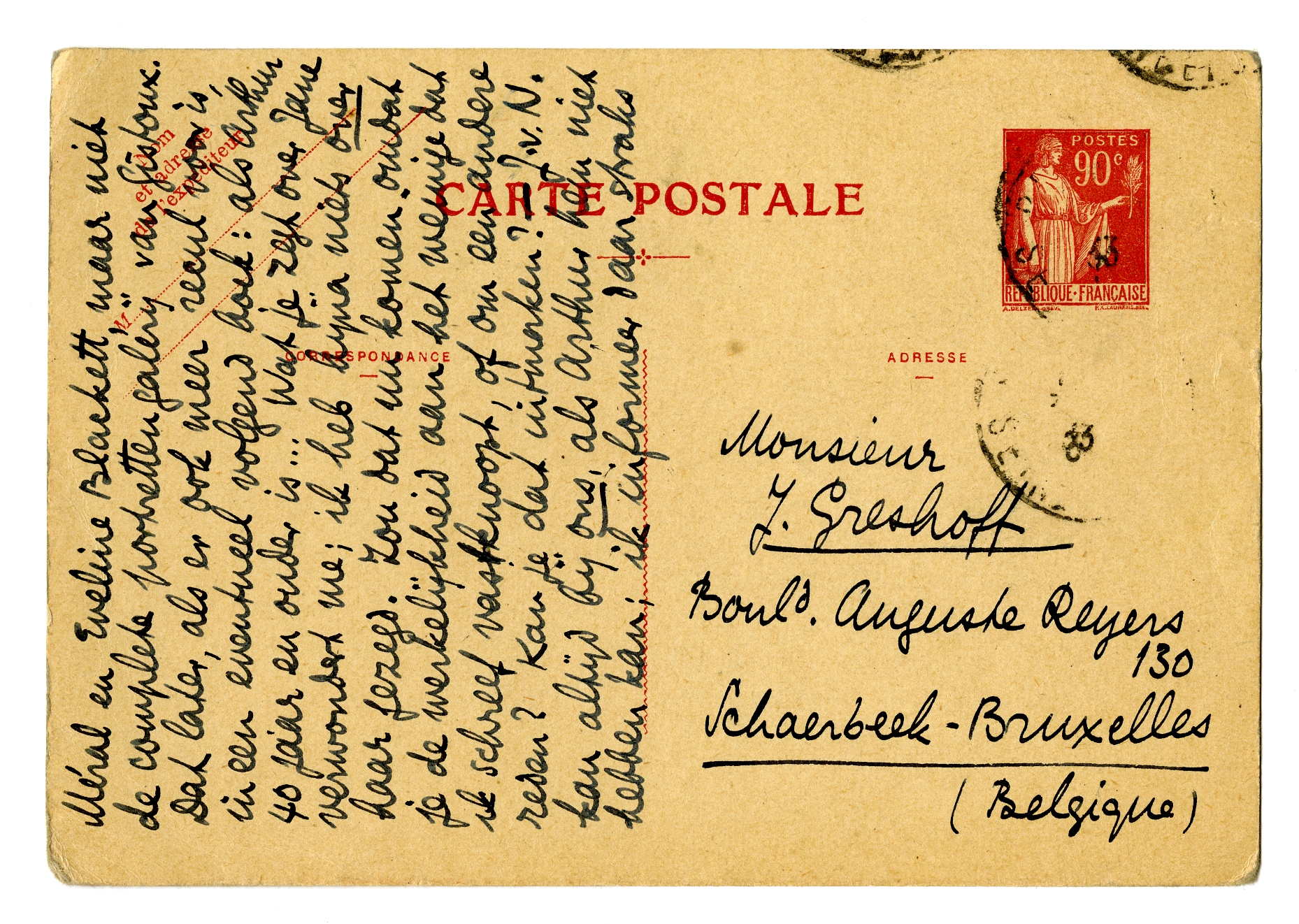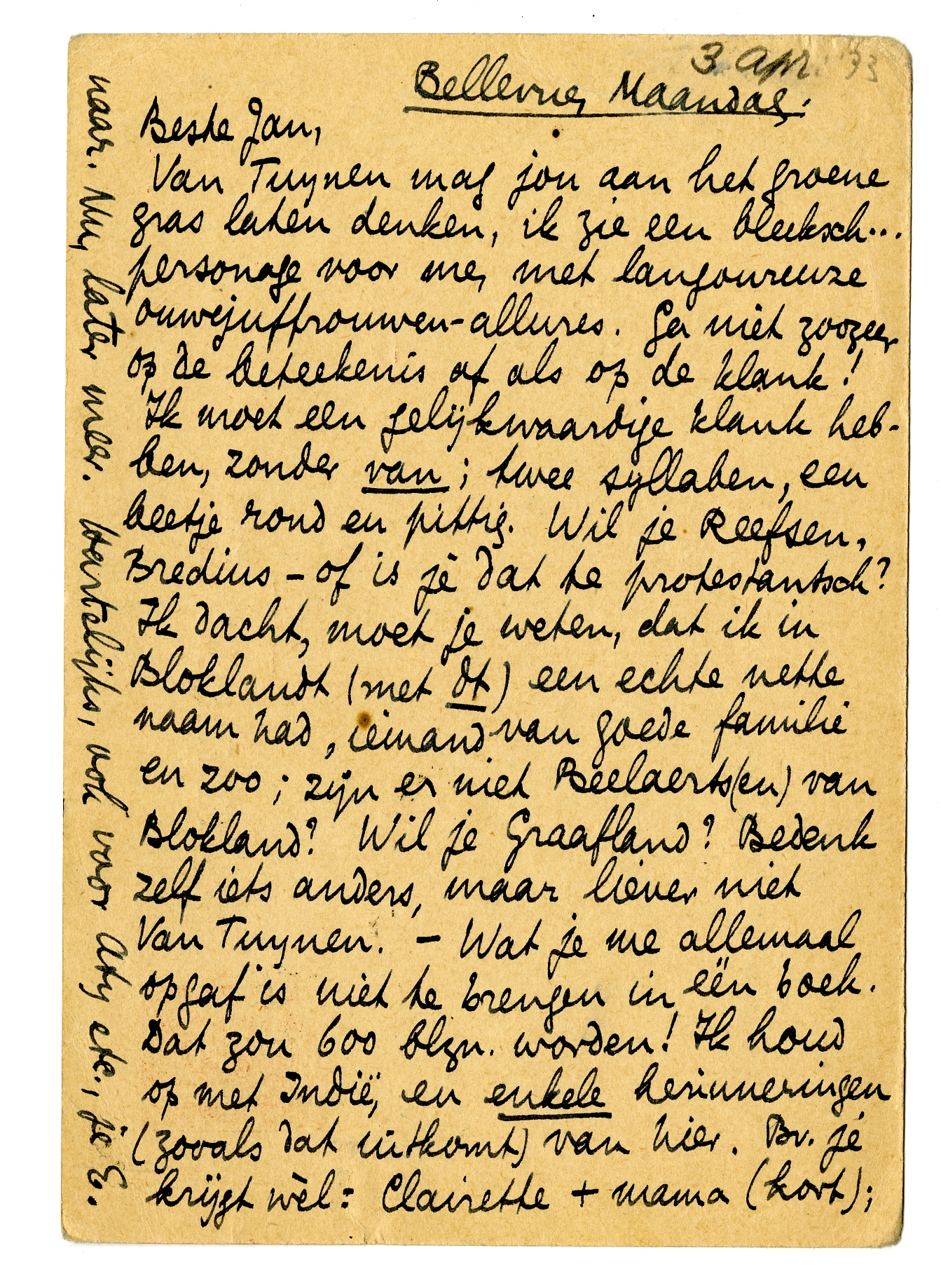 Van Tuynen2637 mag jou aan het groene gras laten denken, ik zie een bleeksch... personage voor me, met langoureuze ouwejuffrouwenallures. Ga niet zoozeer op de beteekenis af als op de klank! Ik moet een gelijkwaardige klank hebben, zonder van; twee syllaben, een beetje rond en pittig. Wil je Reefsen, Bredius - of is je dat te protestantsch? Ik dacht, moet je weten, dat ik in Bloklandt (met dt) een echte nette naam had, iemand van goede familie en zoo; zijn er niet Beelaerts(en) van Blokland? Wil je Graafland? Bedenk zelf iets anders, maar liever niet Van Tuynen. - Wat je me allemaal opgaf is niet te brengen in één boek. Dat zou 600 blzn. worden! Ik houd op met Indië, en enkele herinneringen (zooals dat uitkomt) van hier. Bv. je krijgt wèl: Clairette + mama (kort); Méral en Eveline Blackett, maar niet de complete portrettengalerij van Gistoux. Dat later, als er ook meer recul voor is, in een eventueel volgend boek: als Arthur 40 jaar en ouder is... Wat je zegt over Jane verwondert me; ik heb bijna niets over haar gezegd. Zou dat nu komen omdat je de werkelijkheid aan het weinige dat ik schreef vastknoopt, of om een andere reden? Kan je dat uitmaken? - J.v.N. kan altijd bij ons, als Arthur hem niet hebben kan; ik informeer daar straks naar. Nu, later meer. Hartelijks, ook voor Aty etc., je
