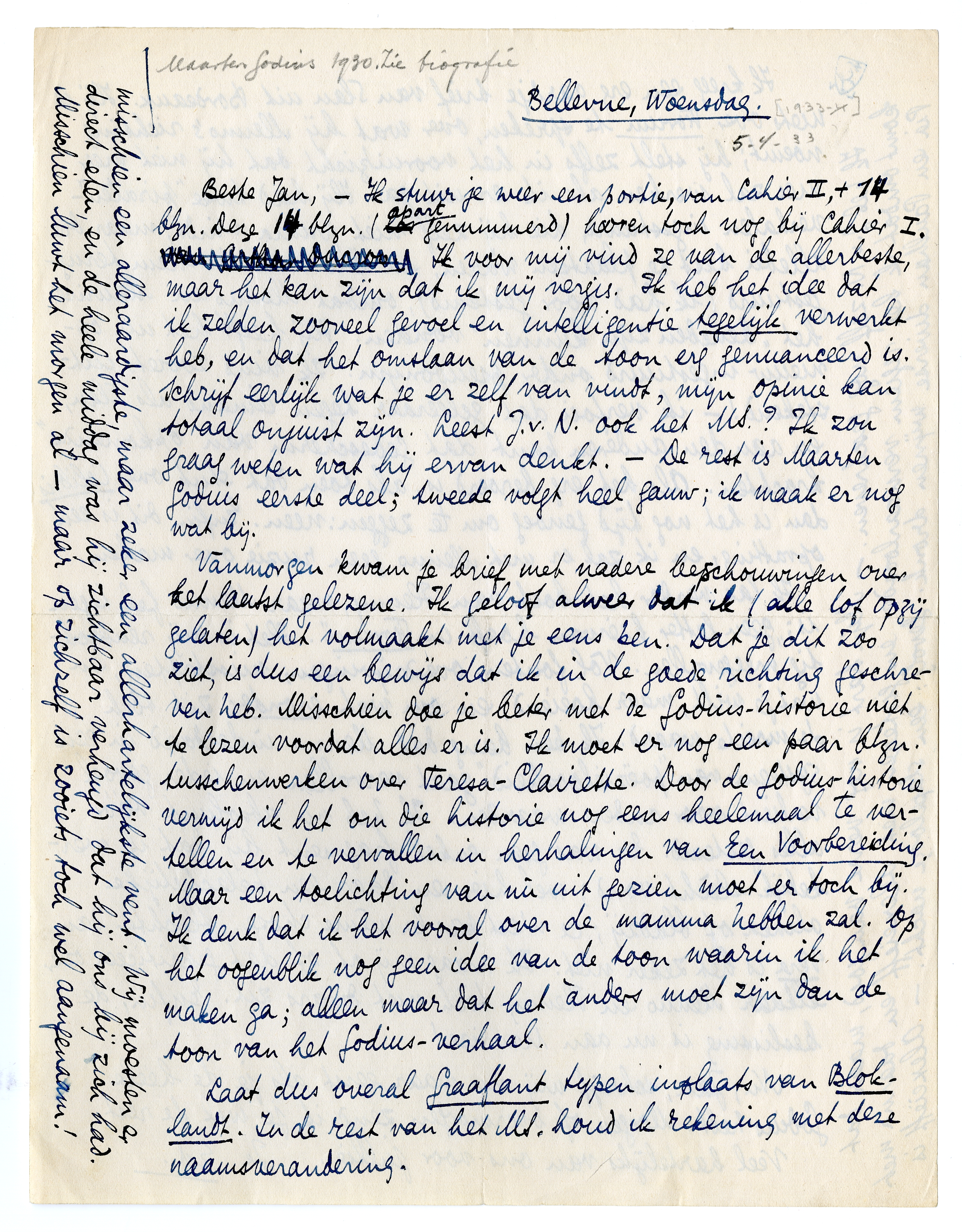 Vanmorgen kwam je brief met nadere beschouwingen over het laatst gelezene. Ik geloof alweer dat ik (alle lof opzij gelaten) het volmaakt met je eens ben. Dat je dit zoo ziet, is dus een bewijs dat ik in de goede richting geschreven heb. Misschien doe je beter met de Godius-historie niet te lezen voordat alles er is. Ik moet er nog een paar blzn. tusschenwerken over Teresa-Clairette. Door de Godius-historie vermijd ik het om die historie nog eens heelemaal te vertellen en te vervallen in herhalingen van Een Voorbereiding. Maar een toelichting van nù uit gezien moet er toch bij. Ik denk dat ik het vooral over de mamma hebben zal. Op het oogenblik nog geen idee van de toon waarin ik het maken ga; alleen maar dat het ànders moet zijn dan de toon van het Godius-verhaal.