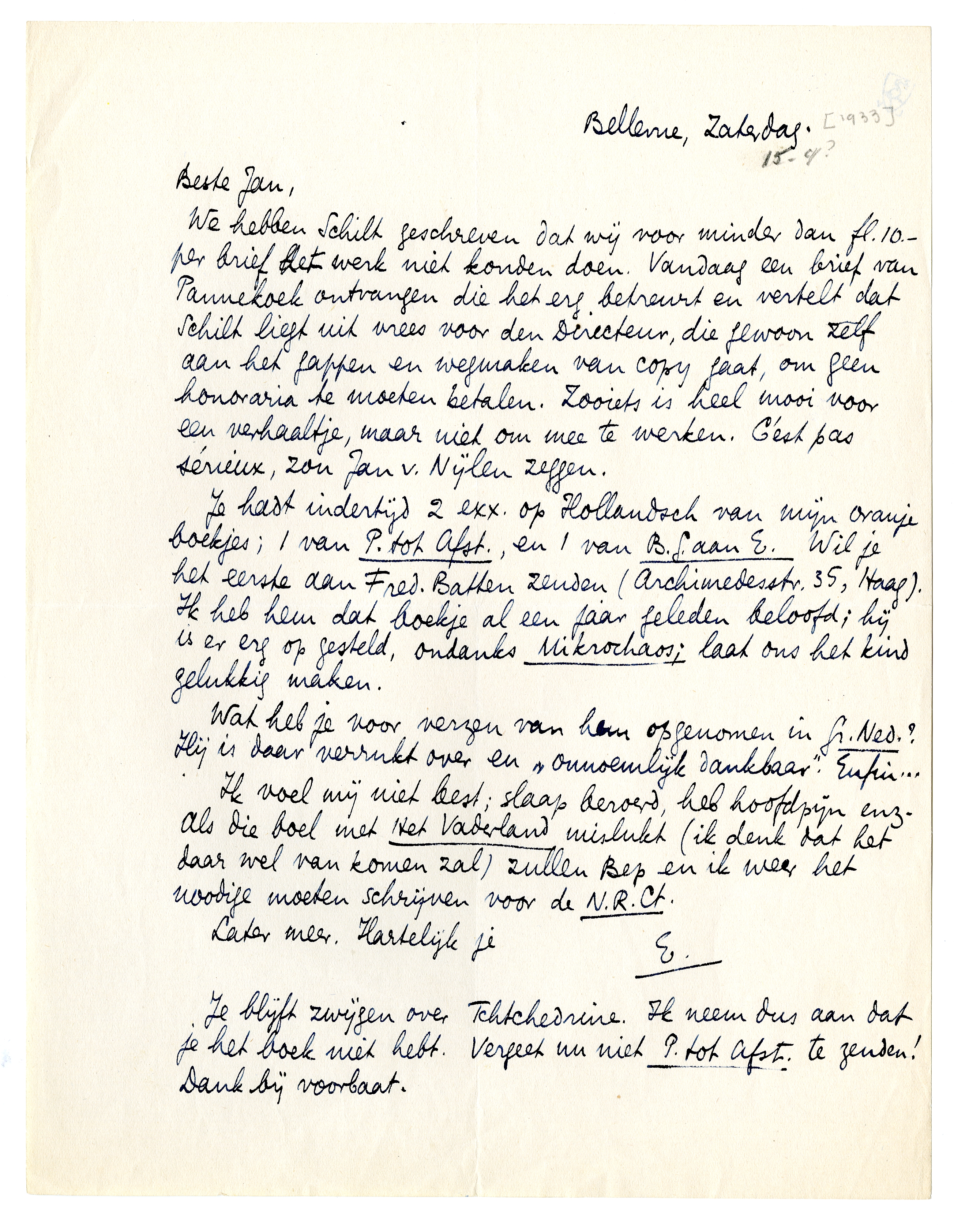 We hebben Schilt geschreven dat wij voor minder dan fl. 10.- per brief het werk niet konden doen. Vandaag een brief van Pannekoek ontvangen die het erg betreurt en vertelt dat Schilt liegt uit vrees voor den Directeur, die gewoon zelf aan het gappen en wegmaken van copy gaat, om geen honoraria te moeten betalen. Zooiets is heel mooi voor een verhaaltje, maar niet om mee te werken. C'est pas sérieux, zou Jan v. Nijlen zeggen.