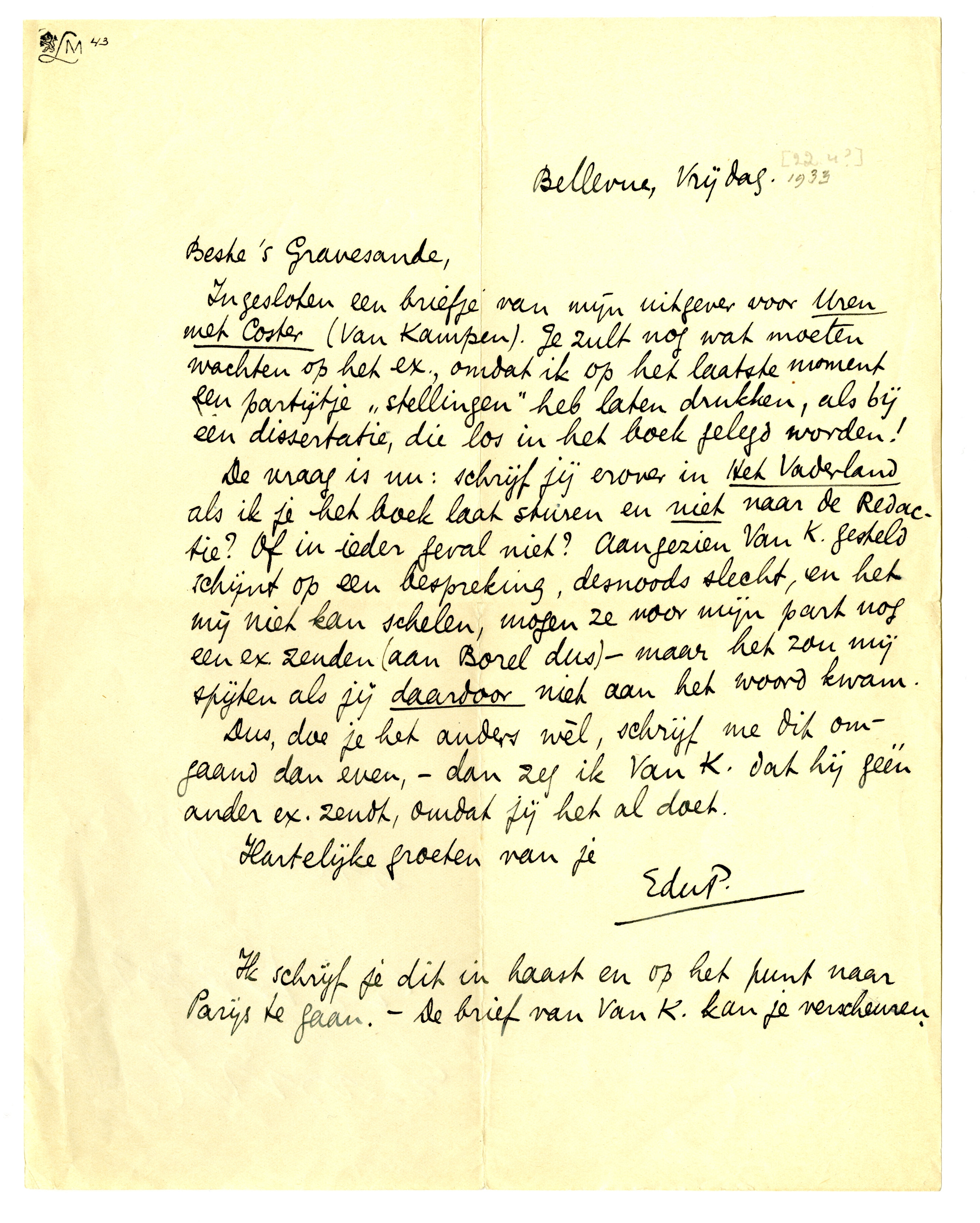 De vraag is nu: schrijf jij erover in Het Vaderland als ik je het boek laat sturen en niet naar de Redactie? Of in ieder geval niet? Aangezien Van K. gesteld schijnt op een bespreking, desnoods slecht, en het mij niet kan schelen, mogen ze voor mijn part nog een ex. zenden (aan Borel dus) - maar het zou mij spijten als jij daardoor niet aan het woord kwam.