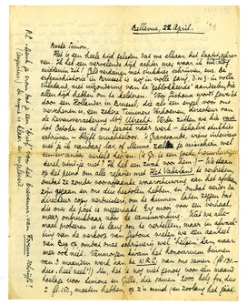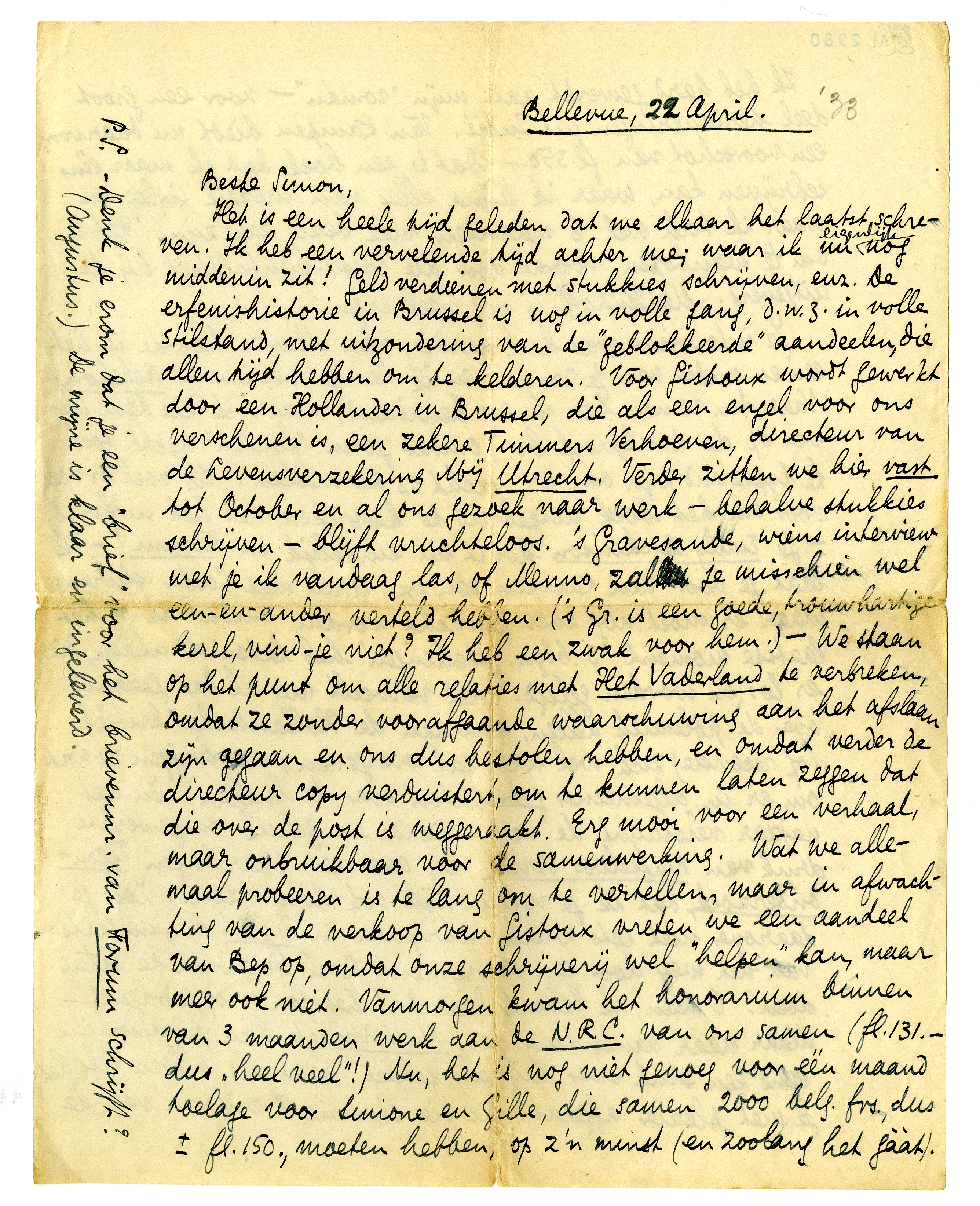 Het is een heele tijd geleden dat we elkaar het laatst schreven. Ik heb een vervelende tijd achter me; waar ik nu eigenlijk nog middenin zit! Geld verdienen met stukkies schrijven, enz. De erfenishistorie in Brussel is nog in volle gang, d.w.z. in volle stilstand, met uitzondering van de ‘geblokkeerde’ aandeelen, die allen tijd hebben om te kelderen. Voor Gistoux wordt gewerkt door een Hollander in Brussel, die als een engel voor ons verschenen is, een zekere Timmers Verhoeven, directeur van de Levensverzekering Mij Utrecht. Verder zitten we hier vast tot October en al ons gezoek naar werk - behalve stukkies schrijven - blijft vruchteloos. 's Gravesande, wiens interview met je ik vandaag las,2692 of Menno zal je misschien wel een-en-ander verteld hebben, ('s Gr. is een goede, trouwhartige kerel, vindje niet? Ik heb een zwak voor hem.) - We staan op het punt om alle relaties met Het Vaderland te verbreken, omdat ze zonder voorafgaande waarschuwing aan het afslaan zijn gegaan en ons dus bestolen hebben, en omdat verder de directeur copy verduistert, om te kunnen laten zeggen dat die over de post is weggeraakt. Erg mooi voor een verhaal, maar onbruikbaar voor samenwerking. Wat we allemaal probeeren is te lang om te vertellen, maar in afwachting van de verkoop van Gistoux vreten we een aandeel van Bep op, omdat onze schrijverij wel ‘helpen’ kan, maar meer ook niet. Vanmorgen kwam het honorarium binnen van 3 maanden werk aan de N.R.C. van ons samen (fl. 131.- dus ‘heel veel’!) Nu, het is nog niet genoeg voor één maand toelage voor Simone en Gille, die samen 2000 belg. frs., dus ± fl. 150., moeten hebben, op z'n minst (en zoolang het gààt).