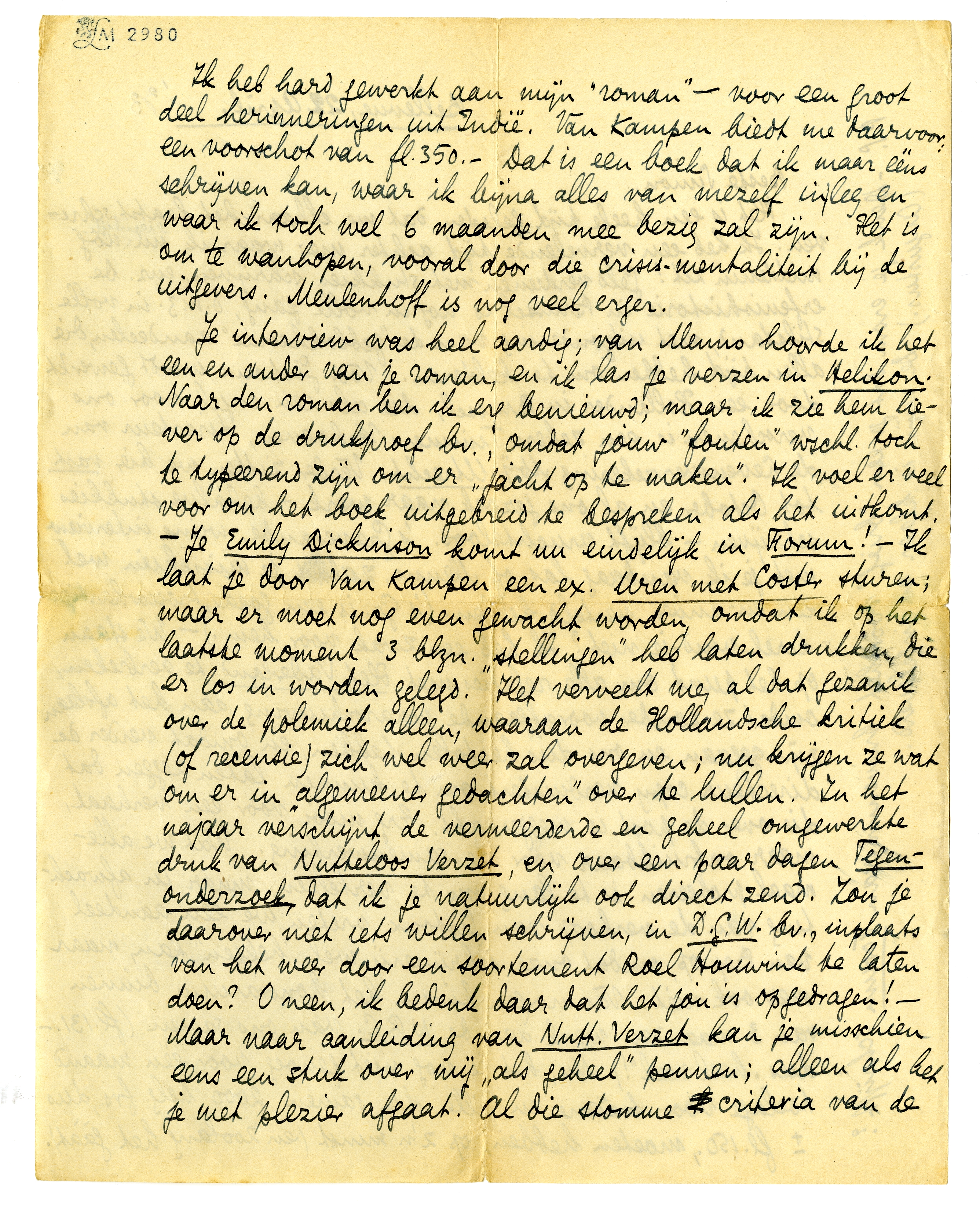 Ik heb hard gewerkt aan mijn ‘roman’ - voor een groot deel herinneringen uit Indië. Van Kampen biedt me daarvoor: een voorschot van fl. 350.- Dat is een boek dat ik maar ééns schrijven kan, waar ik bijna alles van mezelf in leg en waar ik toch wel 6 maanden mee bezig zal zijn. Het is om te wanhopen, vooral door die crisis-mentaliteit bij de uitgevers. Meulenhoff is nog veel erger.