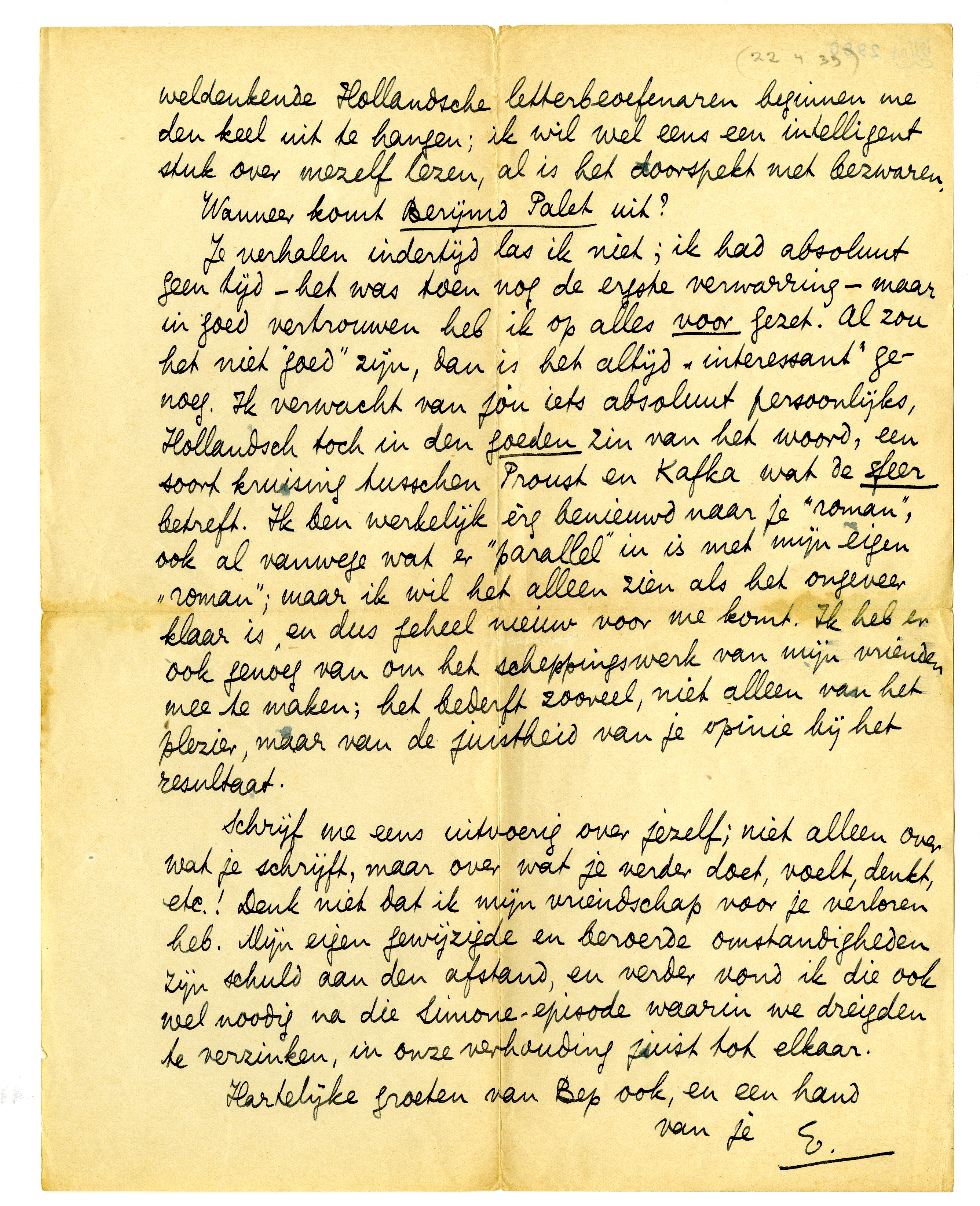 Je verhalen2696 indertijd las ik niet; ik had absoluut geen tijd - het was toen nog de ergste verwarring - maar in goed vertrouwen heb ik op alles voor gezet. Al zou het niet ‘goed’ zijn, dan is het altijd ‘interessant’ genoeg. Ik verwacht van jou iets absoluut persoonlijks, Hollandsch toch in den goeden zin van het woord, een soort kruising tusschen Proust en Kafka wat de sfeer betreft. Ik ben werkelijk èrg benieuwd naar je ‘roman’, ook al vanwege wat er ‘parallel’ in is met mijn eigen ‘roman’; maar ik wil het alleen zien als het ongeveer klaar is, en dus geheel nieuw voor me komt. Ik heb er ook genoeg van om het scheppingswerk van mijn vrienden mee te maken; het bederft zooveel, niet alleen van het plezier, maar van de juistheid van je opinie bij het resultaat.