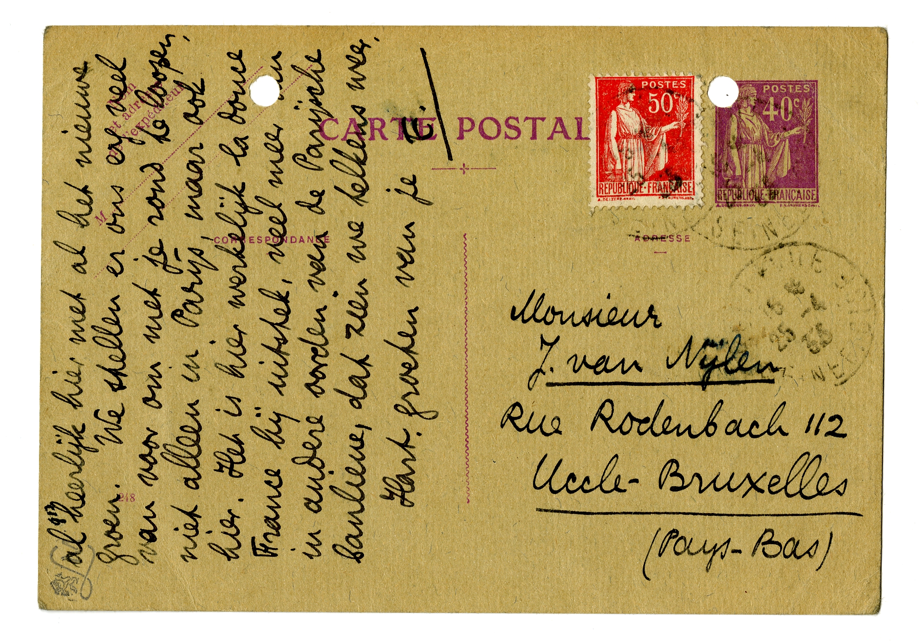 Van Jan Gr. hoor ik dat je Woensdag met Jany bij hem eet. Zou je het nog zoo kunnen schikken dat je hem een portie van het getypte Ducroo-ms. meegeeft? Geef je me dan op wat ik je aan species ervoor zenden moet? Ik merk dat ik steun heb aan het ms. voor de rest, en ik heb nu weer gedaan met allerlei artikelen (ik schreef heel veel in de afgeloopen week) en wou weer voortgaan. God weet hoe mijn omstandigheden zullen zijn als ik met October wegga van hier. Het is nu vooral heerlijk hier met al het nieuwe groen. We stellen er ons erg veel van voor om met je rond te loopen, niet alleen in Parijs, maar ook hier. Het is hier werkelijk la douce France bij uitstek, veel meer dan in andere oorden van de Parijsche banlieue, dat zien we telkens weer.