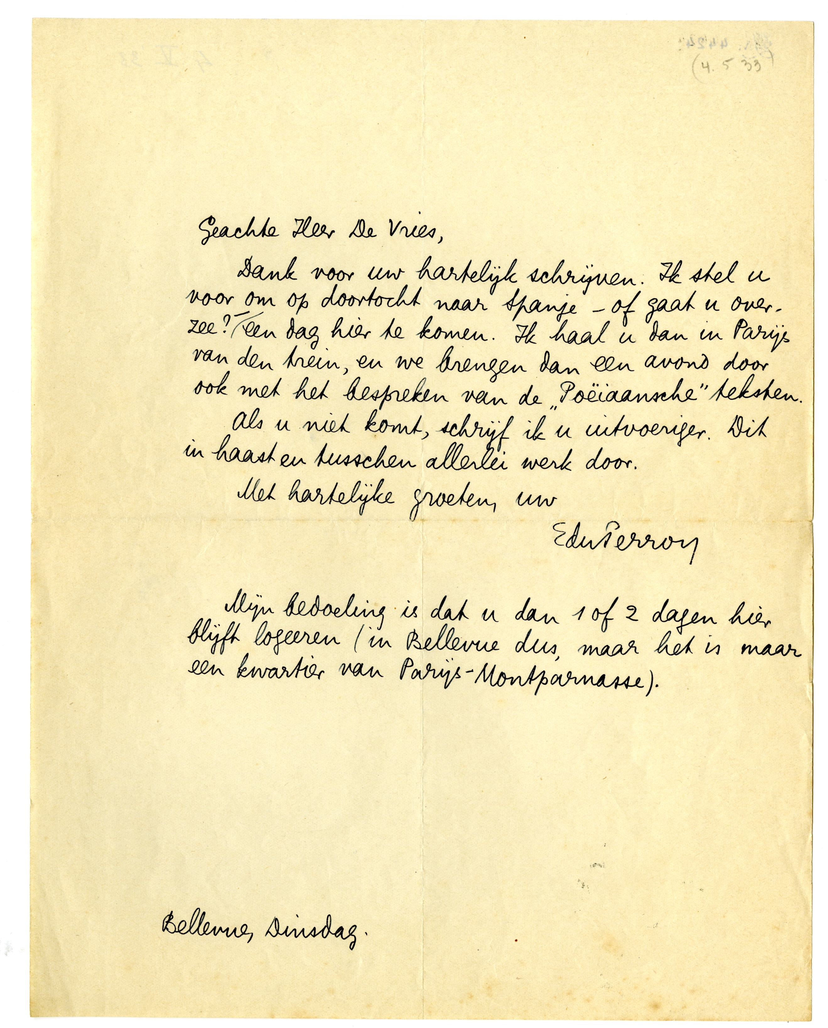 Dank voor uw hartelijk schrijven. Ik stel u voor om op doortocht naar Spanje - of gaat u over zee? - een dag hier te komen. Ik haal u dan in Parijs van den trein, en we brengen dan een avond door ook met het bespreken van de ‘Poëiaansche’ teksten.