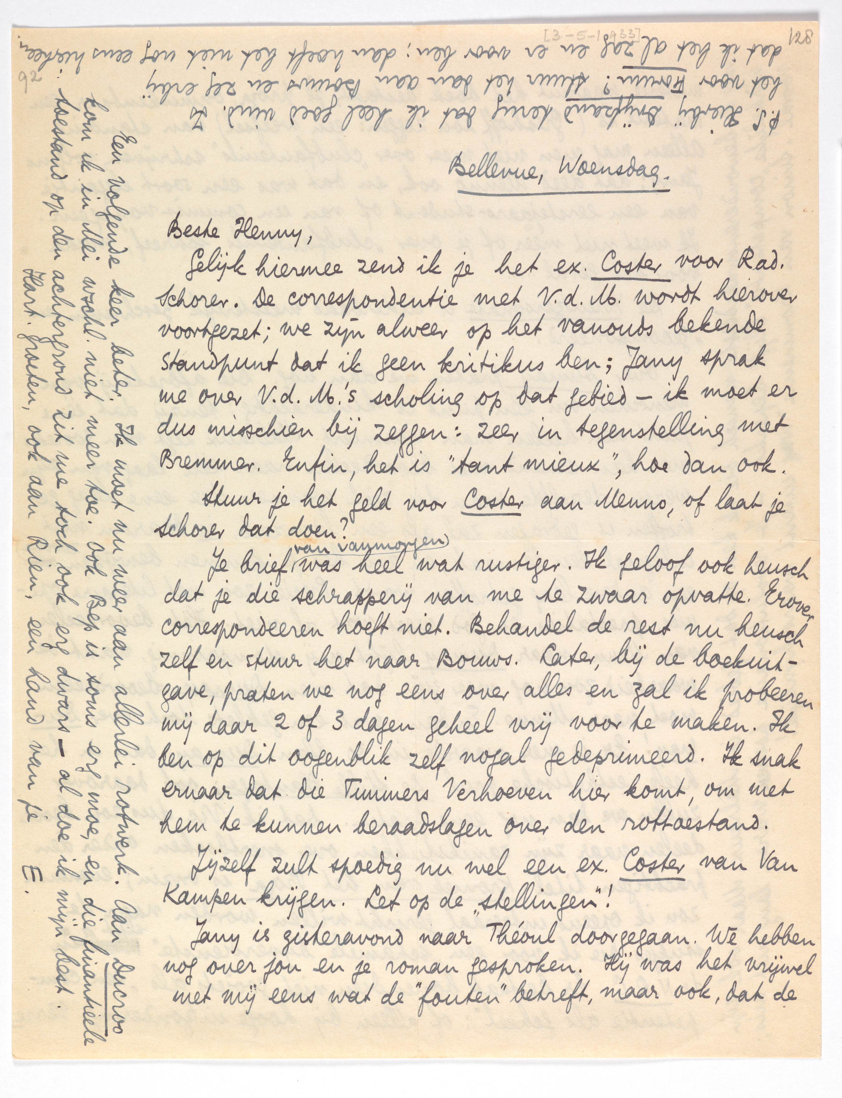 Gelijk hiermee zend ik je het ex. Coster voor Rad. Schorer. De correspondentie met V.d.M. wordt hierover voortgezet; we zijn alweer op het vanouds bekende standpunt dat ik geen kritikus ben; Jany sprak me over V.d.M.'s scholing op dat gebied - ik moet er dus misschien bij zeggen: zeer in tegenstelling met Bremmer. Enfin, het is ‘tant mieux’, hoe dan ook.