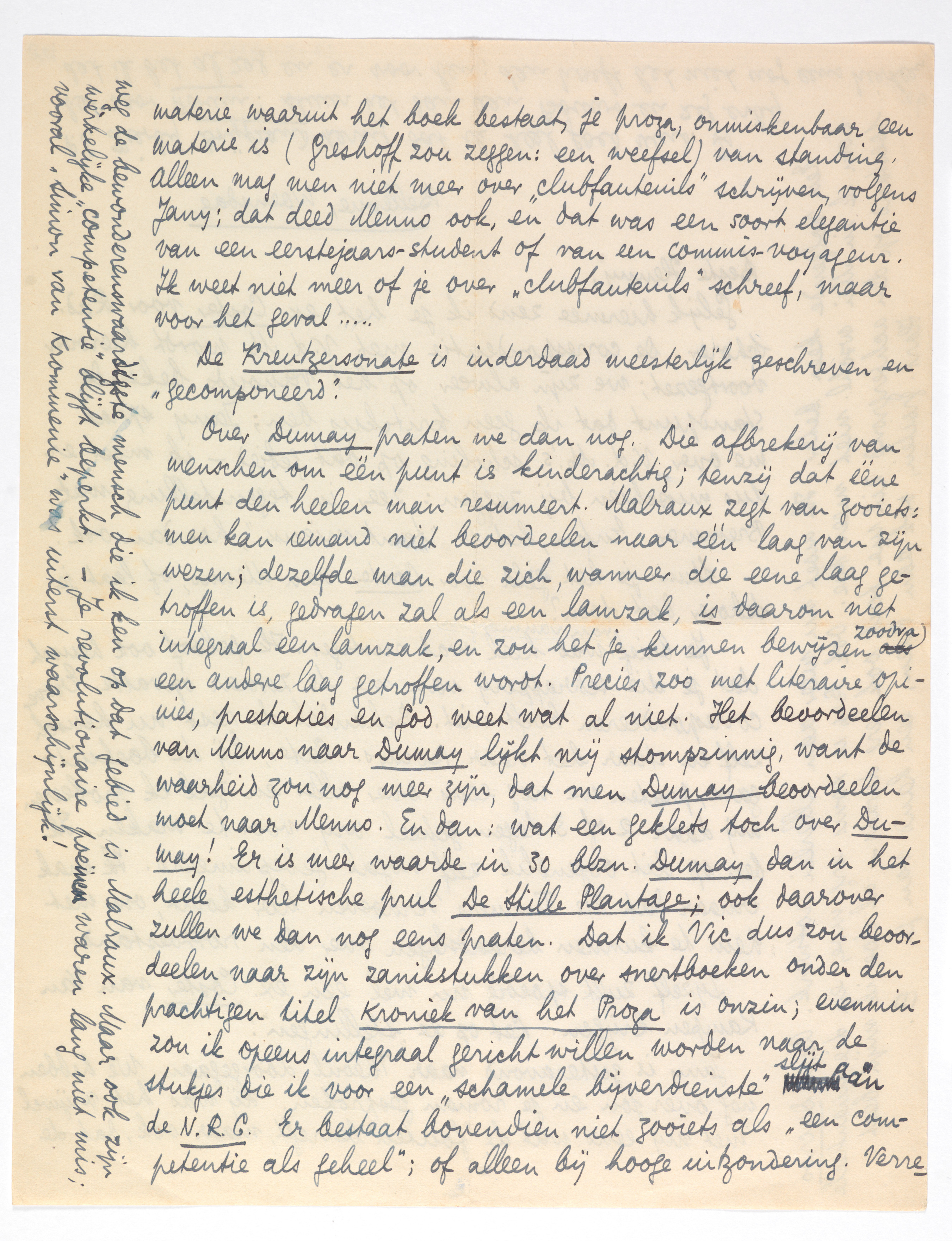 Over Dumay praten we dan nog. Die afbrekerij van menschen om één punt is kinderachtig; tenzij dat ééne punt den heelen man resumeert. Malraux zegt van zooiets: men kan iemand niet beoordeelen naar één laag van zijn wezen; dezelfde man die zich, wanneer die eene laag getroffen is, gedragen zal als een lamzak, is daarom niet integraal een lamzak, en zou het je kunnen bewijzen zoodra een andere laag getroffen wordt. Precies zoo met literaire opinies, prestaties en God weet wat al niet. Het beoordeelen van Menno naar Dumay lijkt mij stompzinnig, want de waarheid zou nog meer zijn, dat men Dumay beoordeelen moet naar Menno. En dan: wat een geklets toch over Dumay! Er is meer waarde in 30 blzn. Dumay dan in het heele esthetische prul De Stille Plantage; ook daarover zullen we dan nog eens praten. Dat ik Vic dus zou beoordeelen naar zijn zanikstukken over snertboeken onder den prachtigen titel Kroniek van het Proza is onzin; evenmin zou ik opeens integraal gericht willen worden naar de stukjes die ik voor een ‘schamele bijverdienste’ slijt aan de N.R.C. Er bestaat bovendien niet zooiets als ‘een competentie als geheel’; of alleen bij hooge uitzondering. Verreweg de bewonderenswaardigste mensch die ik ken op dat gebied is Malraux. Maar ook zijn wèrkelijke ‘competentie’ blijft beperkt. - Je revolutionaire poëmen2704 waren lang niet mis; Vooral ‘Simon van Krommenie’ was uiterst waarschijnlijk!