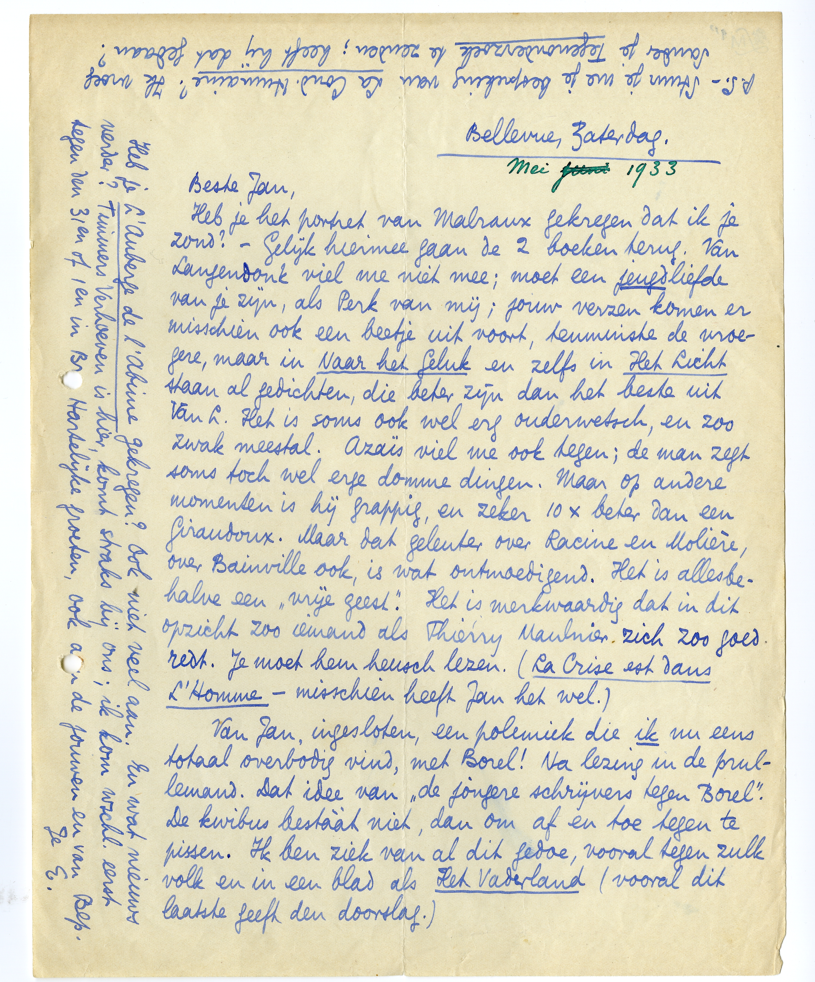 Heb je het portret van Malraux gekregen dat ik je zond? - Gelijk hiermee gaan de 2 boeken terug. Van Langendonk viel me niet mee; moet een jeugdliefde van je zijn, als Perk van mij; jouw verzen komen er misschien ook een beetje uit voort, tenminste de vroegere, maar in Naar het Geluk en zelfs in Het Licht staan al gedichten, die beter zijn dan het beste uit Van L. Het is soms ook wel erg ouderwetsch, en zoo zwak meestal. Azaïs2722 viel me ook tegen; de man zegt soms toch wel erge domme dingen. Maar op andere momenten is hij grappig, en zeker 10 × beter dan een Giraudoux. Maar dat geleuter over Racine en Molière, over Bainville ook, is wat ontmoedigend. Het is allesbehalve een ‘vrije geest’. Het is merkwaardig dat in dit opzicht zoo iemand als Thierry Maulnier zich zoo goed redt. Je moet hem heusch lezen. (La Crise est dans L'Homme - misschien heeft Jan het wel.)