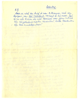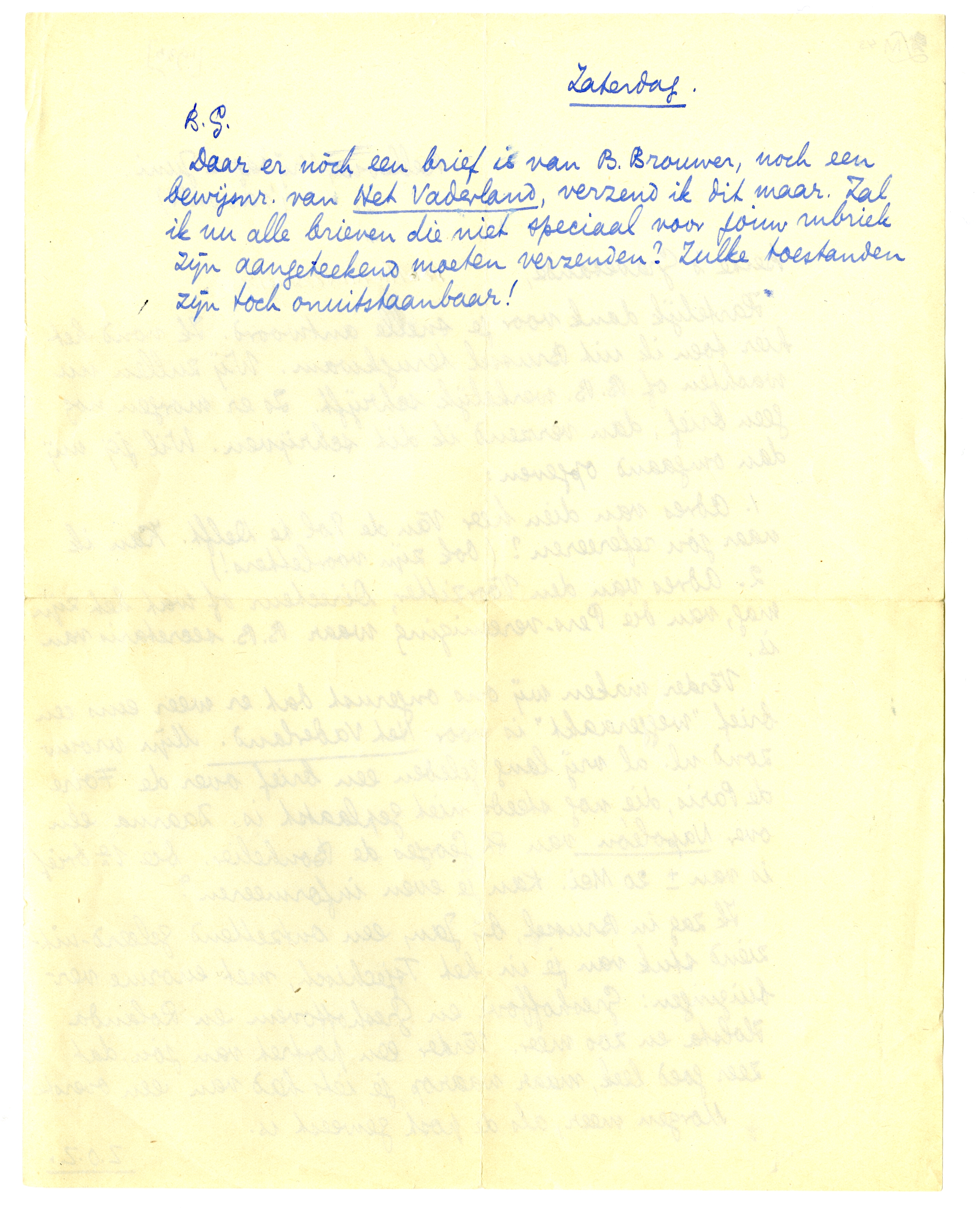 Daar er nòch een brief is van B. Brouwer, noch een bewijsnr. van Het Vaderland, verzend ik dit maar. Zal ik nu alle brieven die niet speciaal voor jouw rubriek zijn aangeteekend moeten verzenden? Zulke toestanden zijn toch onuitstaanbaar!
