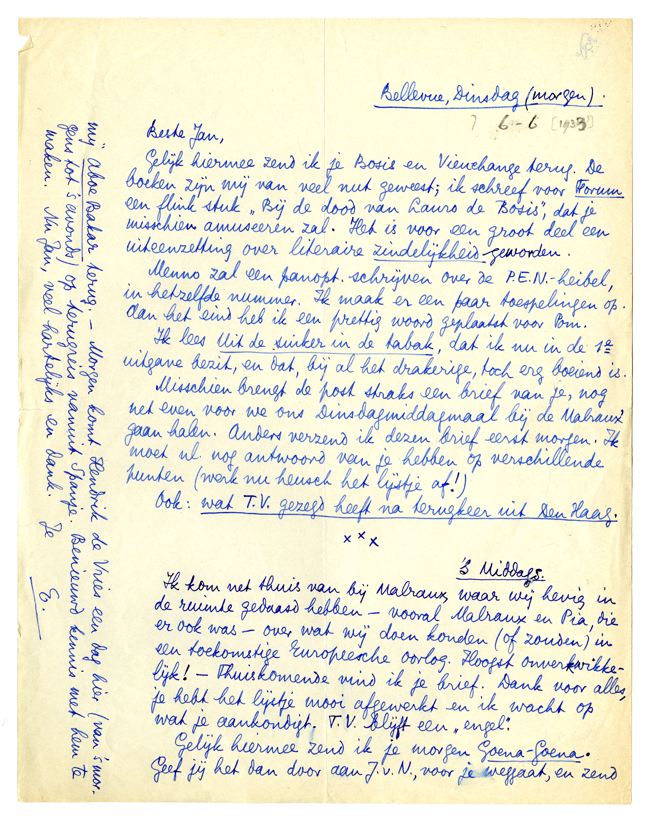 Gelijk hiermee zend ik je Bosis en Vieuchange2744 terug. De boeken zijn mij van veel nut geweest; ik schreef voor Forum een flink stuk ‘Bij de dood van Lauro de Bosis’2745, dat je misschien amuseeren zal. Het is voor een groot deel een uiteenzetting over literaire zindelijkheid geworden.