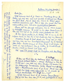 Gelijk hiermee zend ik je morgen Goena-Goena. Geef jij het dan door aan J.v.N., voor je weggaat, en zend mij Aboe Bakar terug. - Morgen komt Hendrik de Vries een dag hier (van 's morgens tot 's avonds) op terugreis vanuit Spanje. Benieuwd kennis met hem te maken. Nu Jan, veel hartelijks en dank. Je