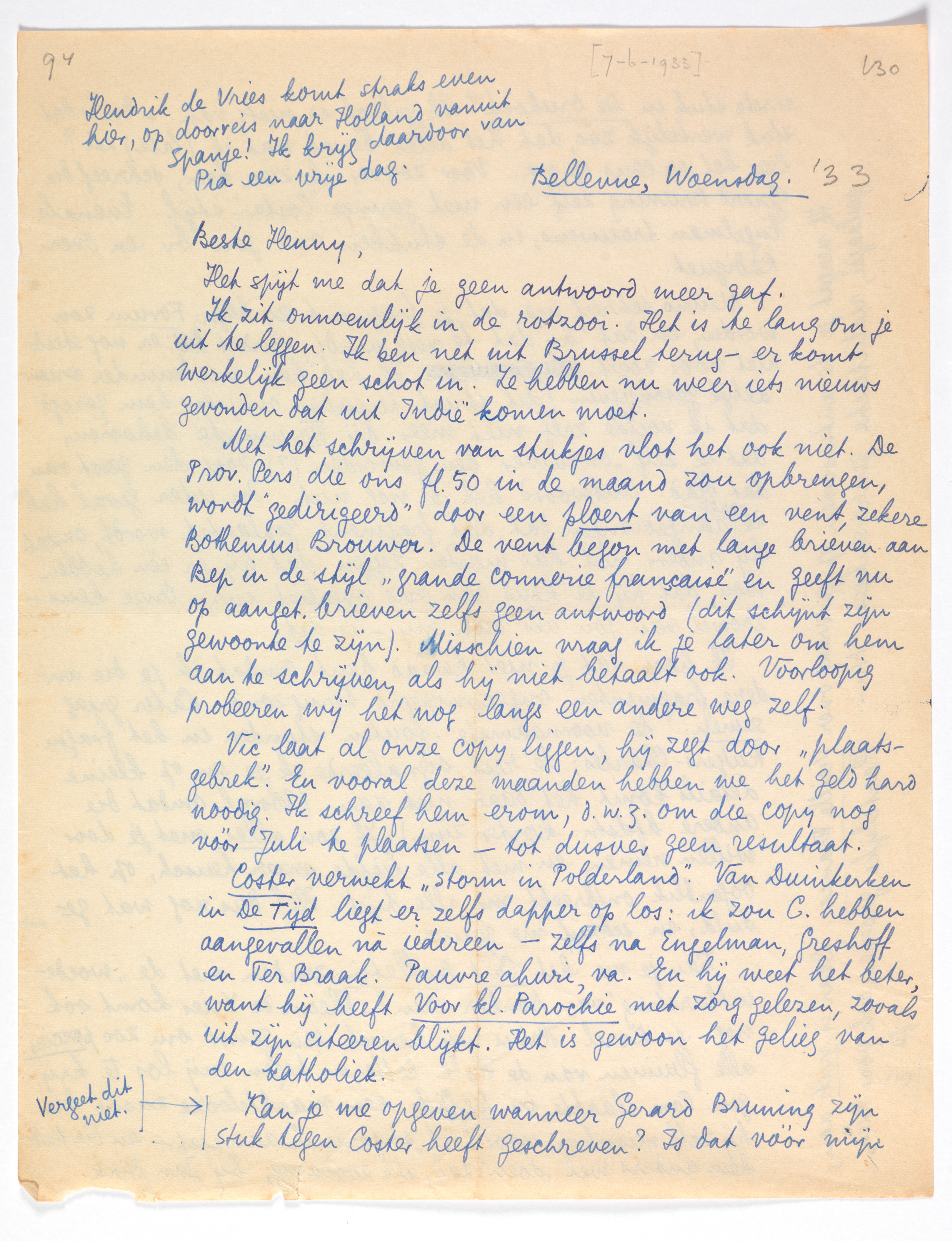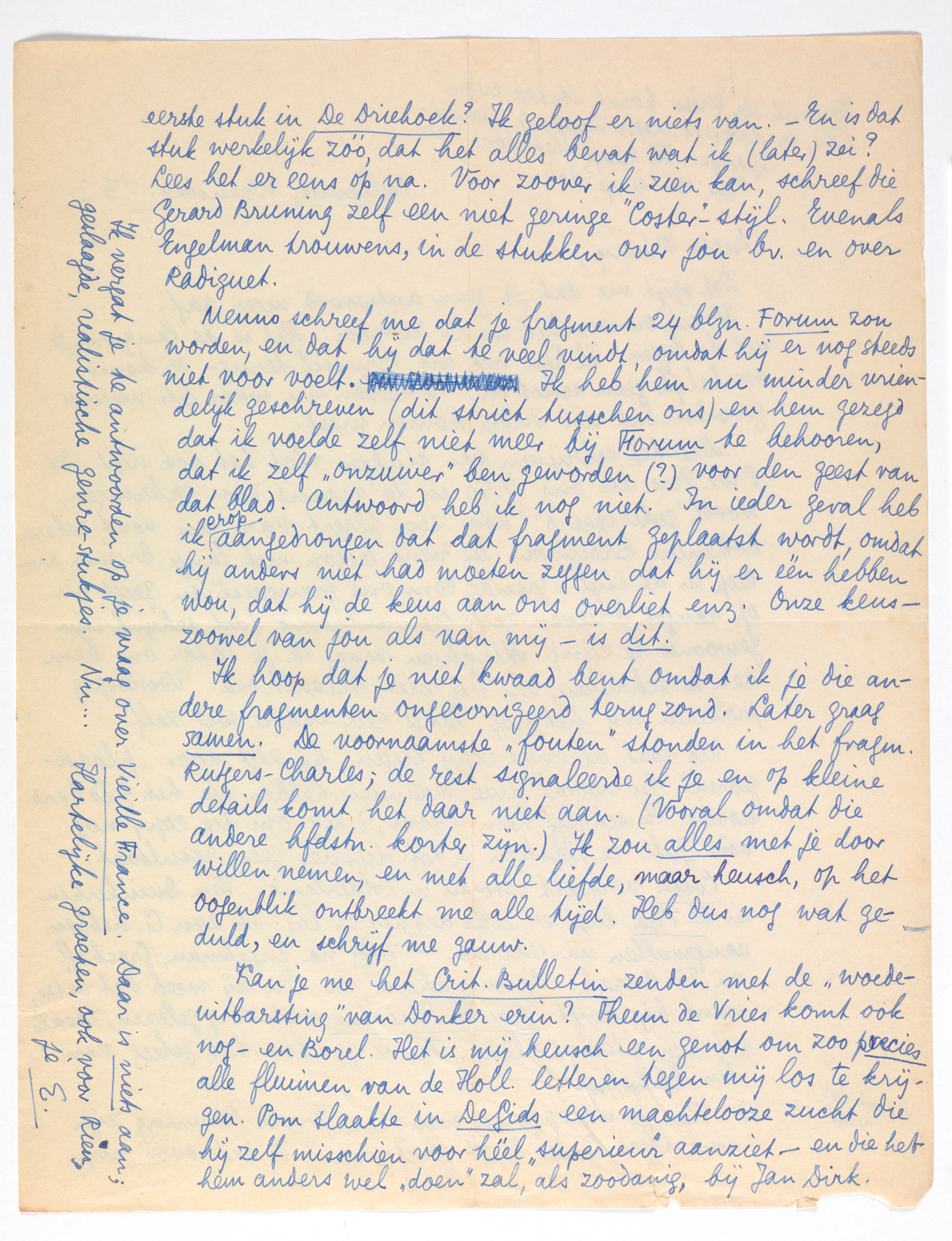 Kan je me opgeven wanneer Gerard Bruning zijn stuk tegen Coster2750 heeft geschreven?* Is dat vóór mijn eerste stuk in De Driehoek?2751 Ik geloof er niets van. - En is dat stuk werkelijk zóó, dat het alles bevat wat ik (later) zei? Lees het er eens op na. Voor zoover ik zien kan, schreef die Gerard Bruning zelf een niet geringe ‘Coster’-stijl. Evenals Engelman trouwens, in de stukken over jou bv. en over Radiguet.2752
