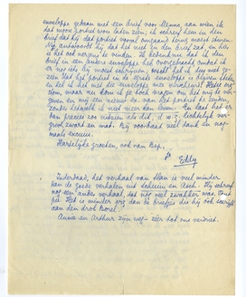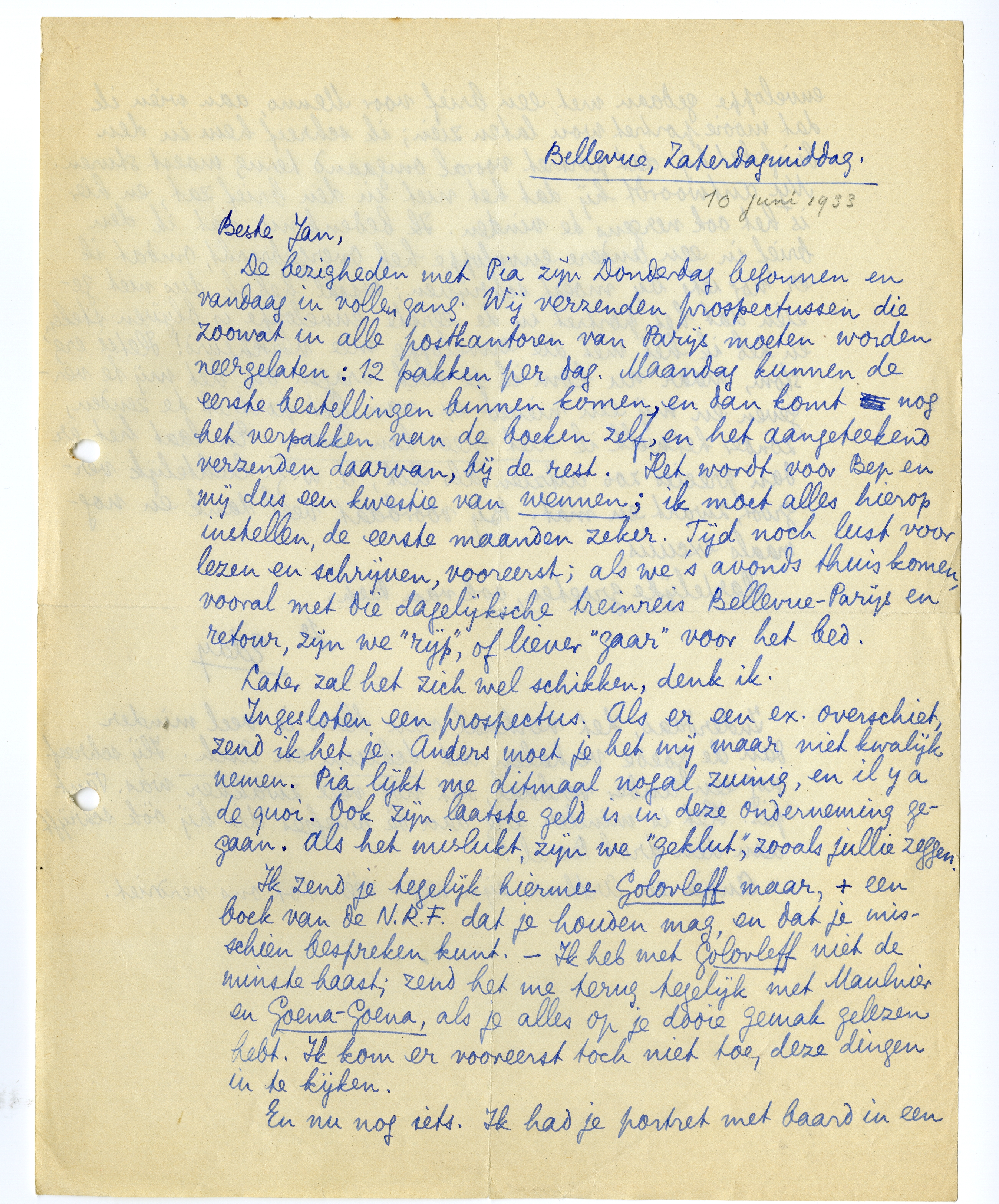 Ingesloten een prospectus. Als er een ex. overschiet, zend ik het je. Anders moet je het mij maar niet kwalijk nemen. Pia lijkt me ditmaal nogal zuinig, en il y a de quoi. Ook zijn laatste geld is in deze onderneming gegaan. Als het mislukt, zijn we ‘geklut’, zooals jullie zeggen.