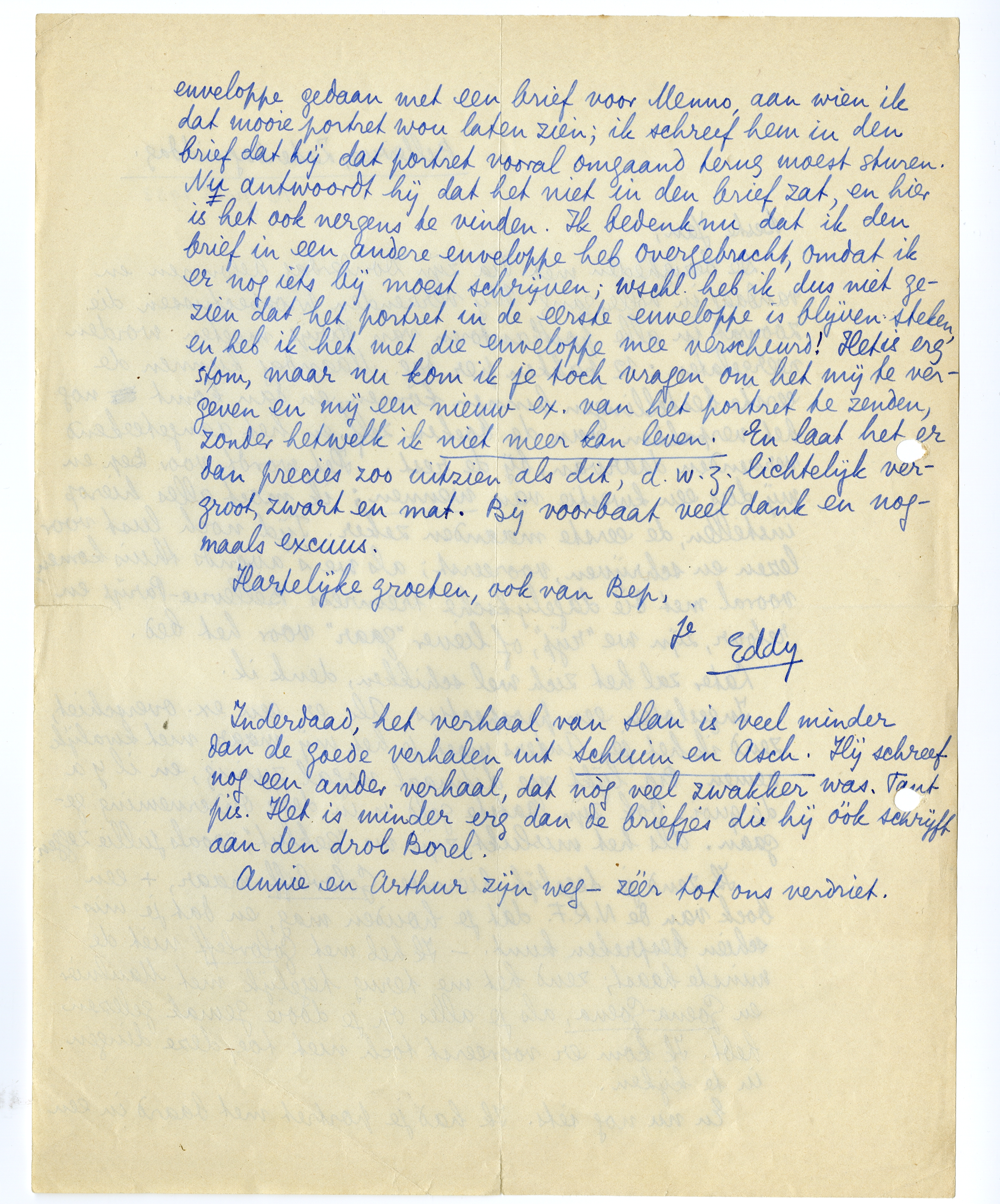 En nu nog iets. Ik had je portret met baard in een enveloppe gedaan met een brief voor Menno, aan wien ik dat mooie portret wou laten zien; ik schreef hem in den brief dat hij dat portret vooral omgaand terug moest sturen. Nu antwoordt hij dat het niet in den brief zat, en hier is het ook nergens te vinden. Ik bedenk nu dat ik den brief in een andere enveloppe heb overgebracht, omdat ik er nog iets bij moest schrijven; wschl. heb ik dus niet gezien dat het portret in de eerste enveloppe is blijven steken, en heb ik het met die enveloppe mee verscheurd! Het is erg stom, maar nu kom ik je toch vragen om het mij te vergeven en mij een nieuw ex. van het portret te zenden, zonder hetwelk ik niet meer kan leven. En laat het er dan precies zoo uitzien als dit, d.w.z. lichtelijk vergroot, zwart en mat. Bij voorbaat veel dank en nogmaals excuus.