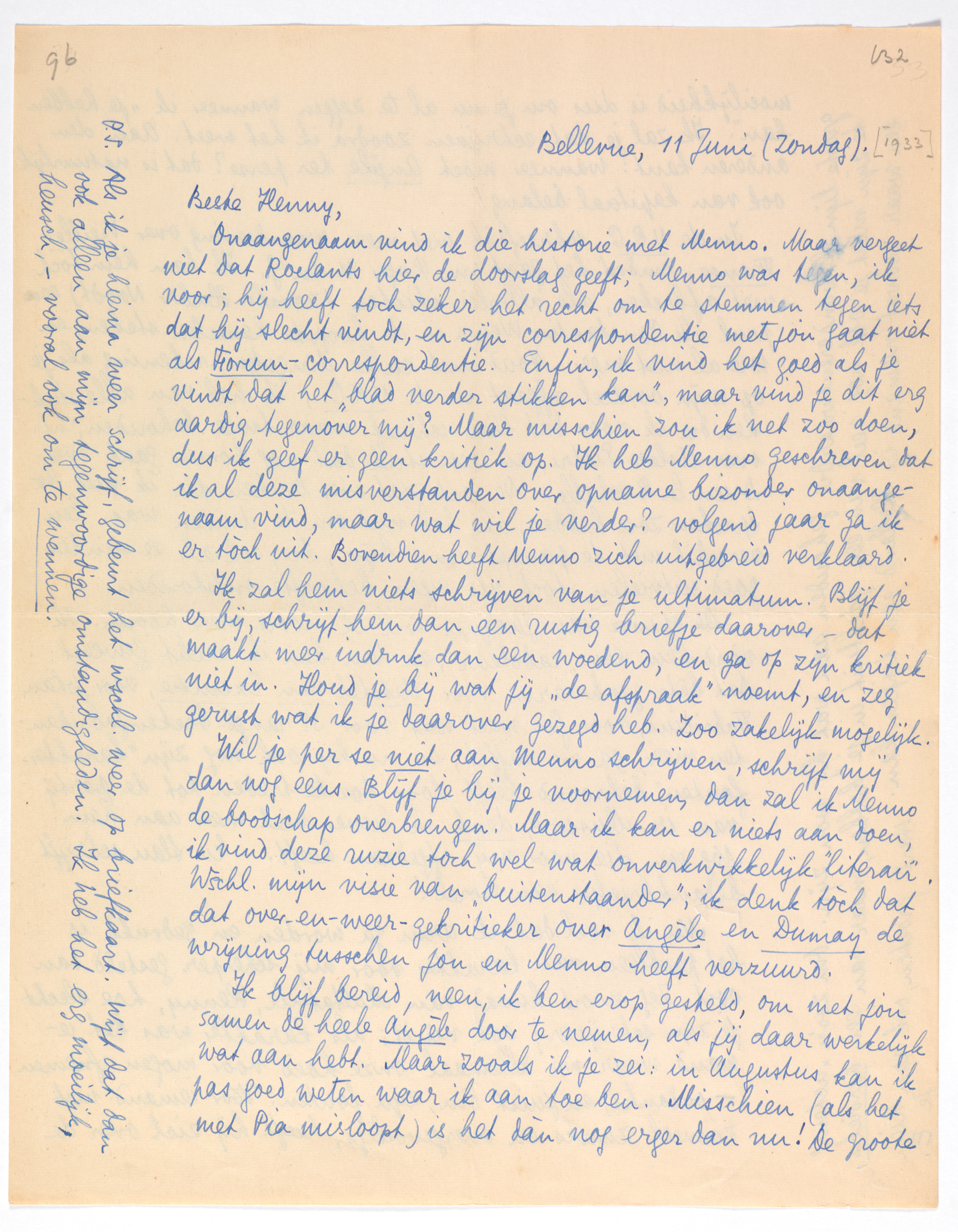 Onaangenaam vind ik die historie met Menno. Maar vergeet niet dat Roelants hier de doorslag geeft; Menno was tegen, ik voor; hij heeft toch zeker het recht om te stemmen tegen iets dat hij slecht vindt, en zijn correspondentie met jou gaat niet als Forum-correspondentie. Enfin, ik vind het goed als je vindt dat het ‘blad verder stikken kan’, maar vind je dit erg aardig tegenover mij? Maar misschien zou ik net zoo doen, dus ik geef er geen kritiek op. Ik heb Menno geschreven dat ik al deze misverstanden over opname bizonder onaangenaam vind, maar wat wil je verder? volgend jaar ga ik er tòch uit. Bovendien heeft Menno zich uitgebreid verklaard.