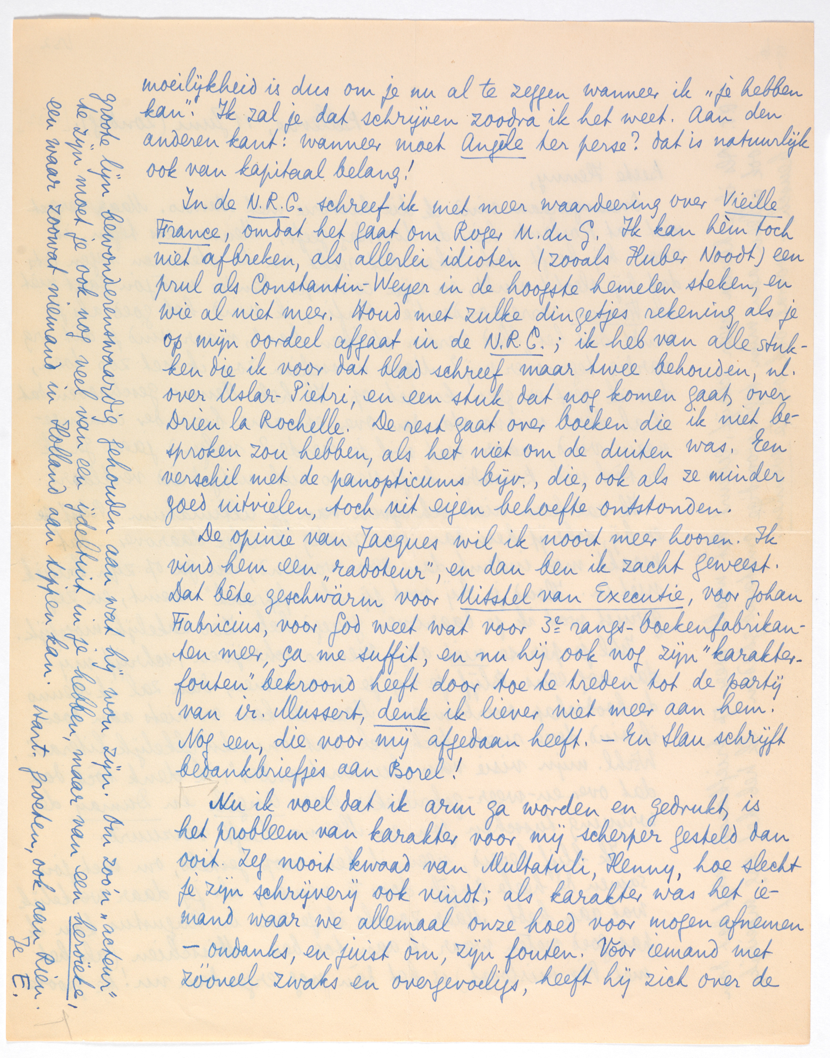 Nu ik voel dat ik arm ga worden en gedrukt, is het probleem van karakter voor mij scherper gesteld dan ooit. Zeg nooit kwaad van Multatuli, Henny, hoe slecht je zijn schrijverij ook vindt; als karakter was het iemand waar we allemaal onze hoed voor mogen afnemen - ondanks, en juist òm, zijn fouten. Voor iemand met zóóveel zwaks en overgevoeligs, heeft hij zich over de groote lijn bewonderenswaardig gehouden aan wat hij wou zijn. Om zoo'n ‘acteur’ te zijn moet je ook nog veel van een ijdeltuit in je hebben, maar van een heroïeke, een waar zoowat niemand in Holland aan tippen kan.