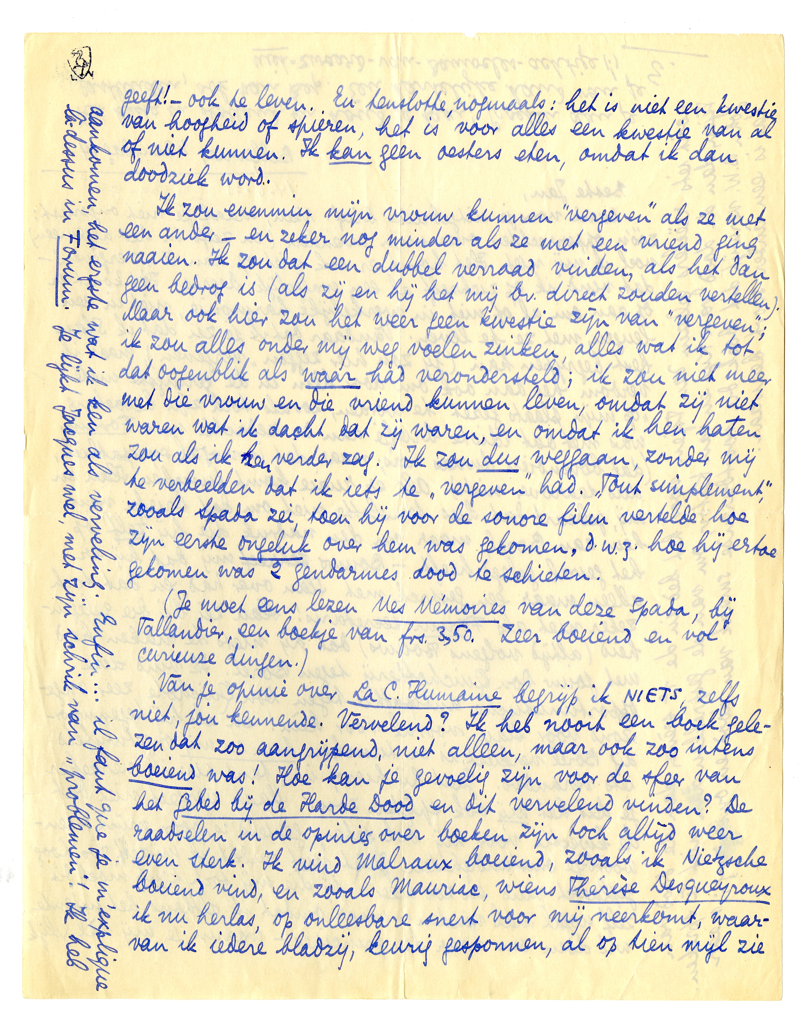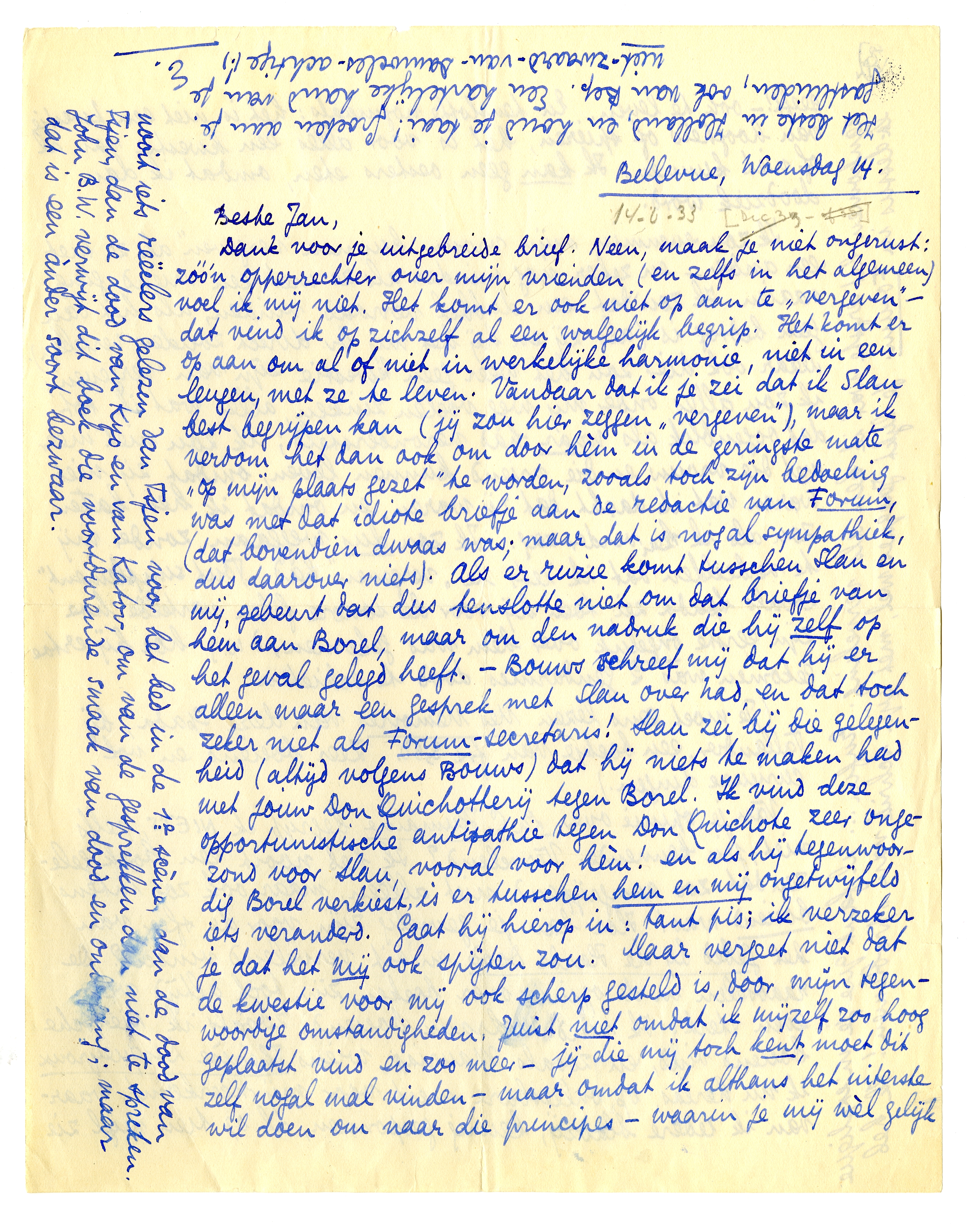 Dank voor je uitgebreide brief. Neen, maak je niet ongerust: zóó'n opperrechter over mijn vrienden (en zelfs in het algemeen) voel ik mij niet. Het komt er ook niet op aan te ‘vergeven’ - dat vind ik op zichzelf al een walgelijk begrip. Het komt er op aan om al of niet in werkelijke harmonie, niet in een leugen, met ze te leven. Vandaar dat ik je zei dat ik Slau best begrijpen kan (jij zou hier zeggen ‘vergeven’), maar ik verdom het dan ook om door hèm in de geringste mate ‘op mijn plaats gezet’ te worden, zooals toch zijn bedoeling was met dat idiote briefje aan de redactie van Forum, (dat bovendien dwaas was; maar dat is nogal sympathiek, dus daarover niets). Als er ruzie komt tusschen Slau en mij, gebeurt dat dus tenslotte niet om dat briefje van hem aan Borel, maar om den nadruk die hij zelf op het geval gelegd heeft. - Bouws schreef mij dat hij er alleen maar een gesprek met Slau over had, en dat toch zeker niet als Forum-secretaris! Slau zei bij die gelegenheid (altijd volgens Bouws) dat hij niets te maken had met jouw Don Quichotterij tegen Borel. Ik vind deze opportunistische antipathie tegen Don Quichote zeer ongezond voor Slau, vooral voor hèm! en als hij tegenwoordig Borel verkiest, is er tusschen hem en mij ongetwijfeld iets veranderd. Gaat hij hierop in: tant pis; ik verzeker je dat het mij ook spijten zou. Maar vergeet niet dat de kwestie voor mij ook scherp gesteld is, door mijn tegenwoordige omstandigheden. Juist niet omdat ik mijzelf zoo hoog geplaatst vind en zoo meer - jij die mij toch kent, moet dit zelf nogal mal vinden - maar omdat ik althans het uiterste wil doen om naar die principes - waarin je mij wèl gelijk geeft! - ook te leven. En tenslotte, nogmaals: het is niet een kwestie van hoogheid of spieren, het is voor alles een kwestie van al of niet kunnen. Ik kan geen oesters eten, omdat ik dan doodziek word.