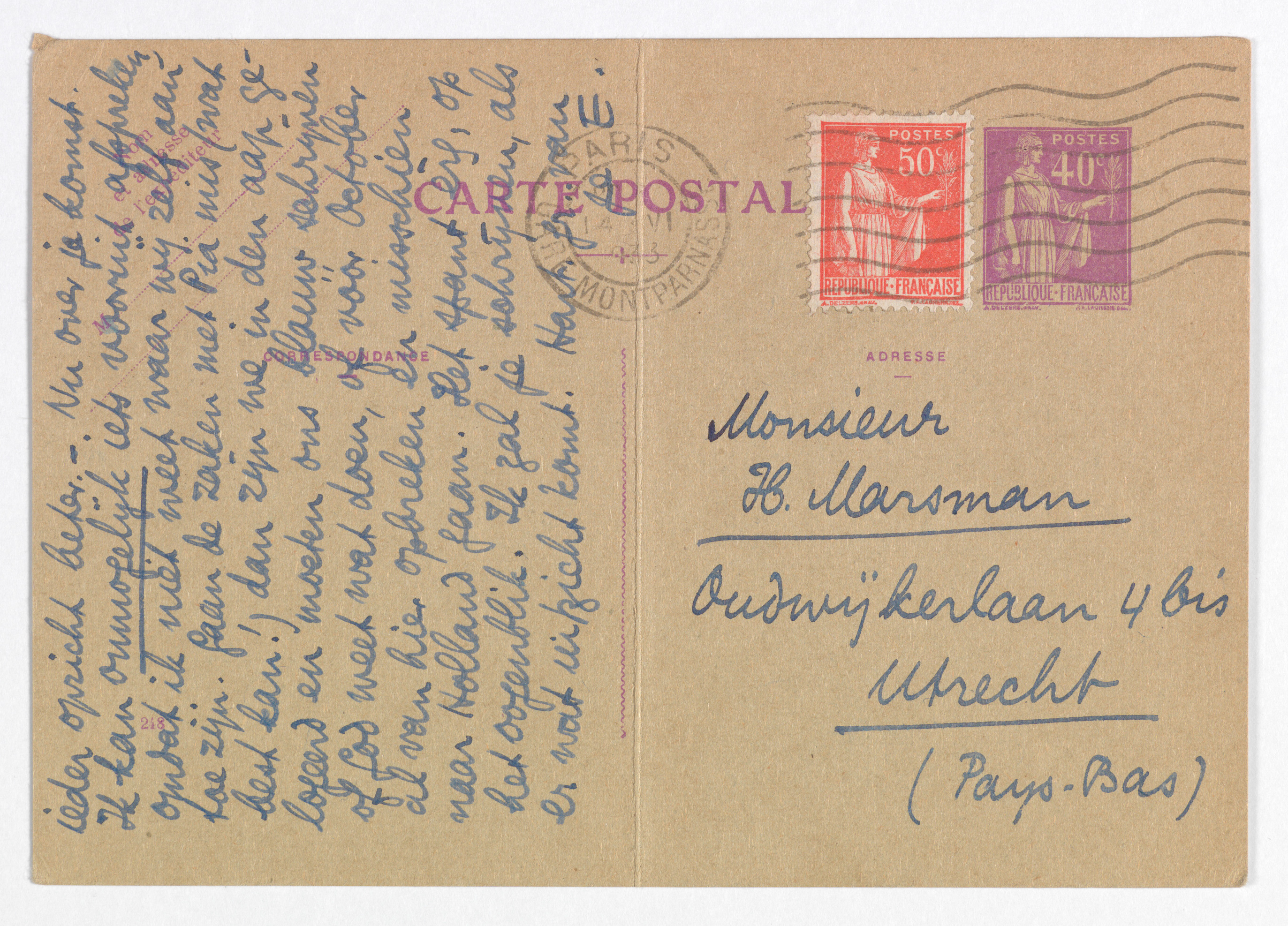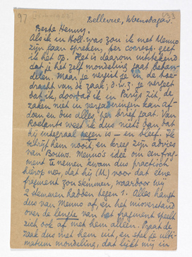 Als ik in Holl. was zou ik met Menno zijn gaan spreken, per corresp. geef ik het op. Het is daarom uitstekend dat je het zelf mondeling gaat behandelen. Maar je vergist je in de toedracht van de zaak; d.w.z. je vergeet dat ik, doordat ik in Parijs zit, de zaken niet in vergaderingen kan afdoen en dus alles per brief gaat. Van Roelants weet ik dus niets dan dat hij integraal tegen is - en bleef. Ik schrijf hem nooit, en kreeg zijn advies van Bouws. Menno's idee om een fragment te nemen kwam dus practisch hierop neer, dat hij (M.) voor dat ééne fragment zou stemmen, waardoor wij 2 stemmen hadden tegen 1. Alles hangt dus van Menno af, en het misverstand over de lengte van het fragment speelt zich ook af met hem alleen. Praat de zaak dus met hem uit, en stel je ultimatum mondeling, dat lijkt mij in ieder opzicht beter. - Nu over je komst. Ik kan onmogelijk iets vooruit afspreken, omdat ik niet weet waar wij zelf aan toe zijn. Gaan de zaken met Pia mis (wat best kan!) dan zijn we in den aap gelogeerd en moeten ons blauw schrijven of God weet wat doen, of vóór October al van hier opbreken en misschien naar Holland gaan. Het spant èrg, op het oogenblik. Ik zal je schrijven, als er wat uitzicht komt. Hart. gr. van
