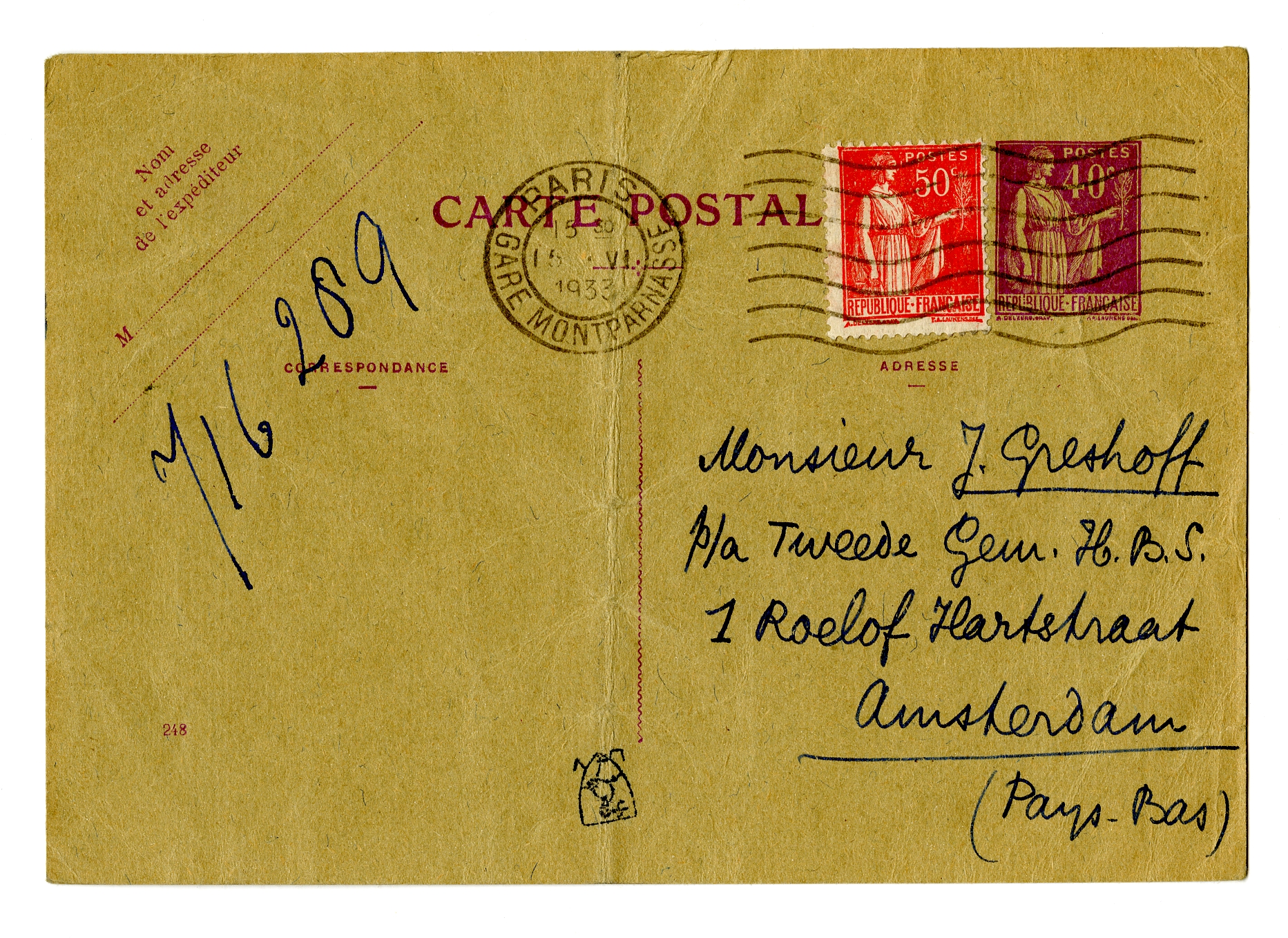 B.J. Dank voor de photo's, die vanmorgen aankwamen. Maar je hebt 3 vergrootingen laten maken van het verkeerde portret; dit is nl. afschuwelijk en ik heb het inderhaast verscheurd. Wat ik bedoelde was het andere, met het cijfer 28 precies naast mijn oor. Enfin, het is nu te laat om de fout goed te maken, dus Sander moet het dan maar zonder photo stellen. Vervelend is het anders wèl; ook al omdat je er drie afdrukken van liet maken. Zend je me je stuk over La Cond. Hum.,2773 als het geplaatst is? Het beste met je Amsterdamsche bezigheden en nogmaals ‘merci tout de même’. Een hand
