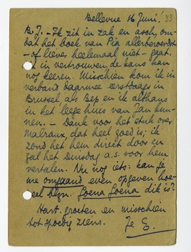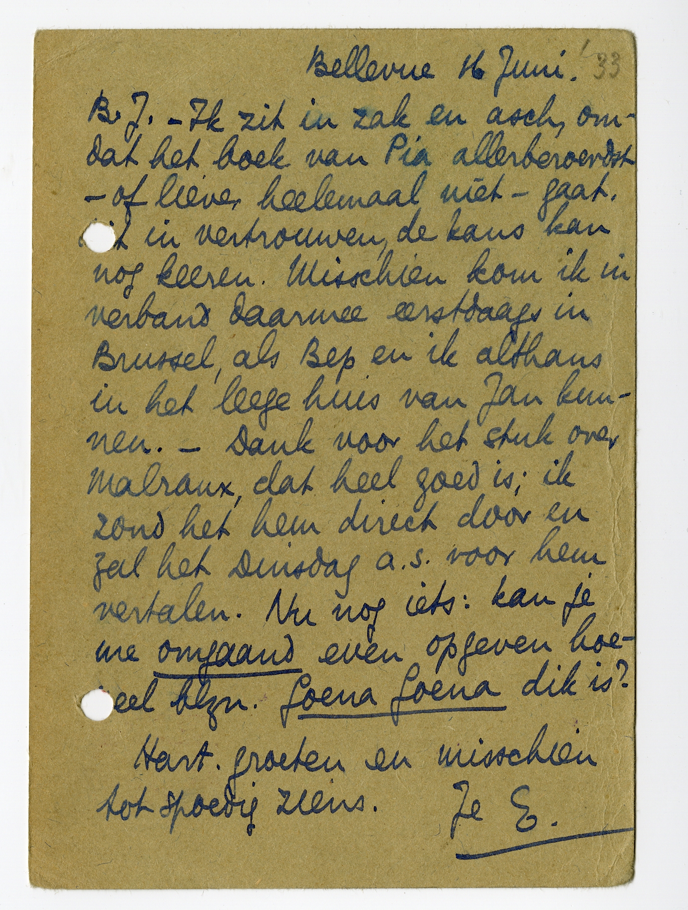 B.J. - Ik zit in zak en asch, omdat het boek van Pia allerberoerdst - of liever heelemaal niet - gaat. Dit in vertrouwen, de kans kan nog keeren. Misschien kom ik in verband daarmee eerstdaags in Brussel, als Bep en ik althans in het leege huis van Jan kun-nen. - Dank voor het stuk over Malraux, dat heel goed is; ik zond het hem direct door en zal het Dinsdag a.s. voor hem vertalen. Nu nog iets: kan je me omgaand even opgeven hoeveel blzn. Goena Goena dik is?