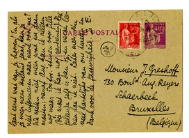 Ik hoop dat je mijn briefk. nog kreeg. Het speet mij erg dat ik al dien tijd totaal zonder bericht van je bleef. Alles gaat heel, heel slecht. Vraag maar aan J.v.N. Wij hebben twee ex. verkocht, nog niet eens genoeg om de reiskosten goed te maken. Bij jou thuis was het heerlijk - niet alleen om de goedkoopte, maar om de sfeer. Ik stal Royaume Farfelu terug, en zette Werther in je kast. Bep stal haar dissertatie,2784 ondanks mijn hevig protest; zij wil niet dat je dit onwaardige boek bezit. Het is ongehoord ijdel van haar, en ik ben bereid 1 ex. voor je te bestellen bij Paris, als je erop gesteld bent, en om haar ijdelheid op de meest gevoelige manier te straffen. Maar laat eerst wat van je hooren! En als je weer naar Holland gaat, kan je niet informeeren naar werk voor me? We weten niet meer wat we doen moeten; vanaf Aug. kan ik alleen nog maar 500 frs. sturen voor Gille (die moet ik dan nog verdienen). Het geleende geld is dan op, en verder leenen doe ik niet. Later meer. Nu veel hartelijks van ons tweeën en dank voor de gastvrijheid. Je