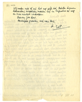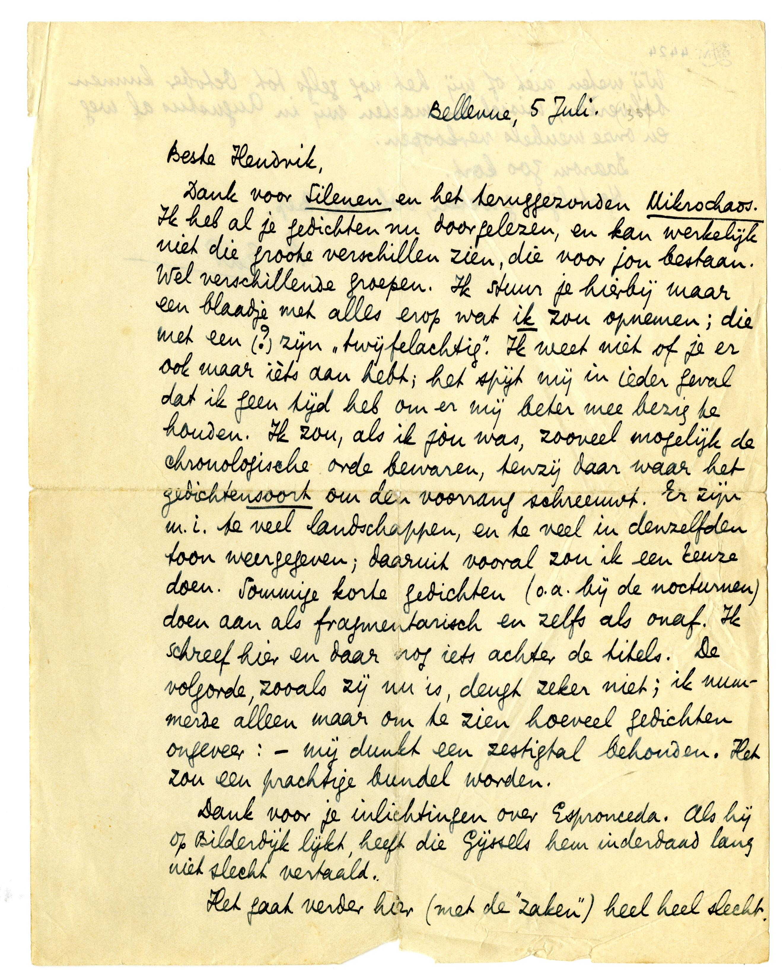 Dank voor Silenen en het teruggezonden Mikrochaos. Ik heb al je gedichten nu doorgelezen, en kan werkelijk niet die groote verschillen zien, die voor jou bestaan. Wel verschillende groepen. Ik stuur je hierbij maar een blaadje met alles erop wat ik zou opnemen; die met een (?) zijn ‘twijfelachtig’. Ik weet niet of je er ook maar ièts aan hebt; het spijt mij in ieder geval dat ik geen tijd heb om er mij beter mee bezig te houden. Ik zou, als ik jou was, zooveel mogelijk de chronologische orde bewaren, tenzij daar waar het gedichtensoort om den voorrang schreeuwt. Er zijn m.i. te veel landschappen, en te veel in denzelfden toon weergegeven; daaruit vooral zou ik een keuze doen. Sommige korte gedichten (oa. bij de nocturnen) doen aan als fragmentarisch en zelfs als onaf. Ik schreef hier en daar nog iets achter de titels. De volgorde, zooals zij nu is, deugt zeker niet; ik nummerde alleen maar om te zien hoeveel gedichten ongeveer: - mij dunkt een zestigtal behouden. Het zou een prachtige bundel worden.