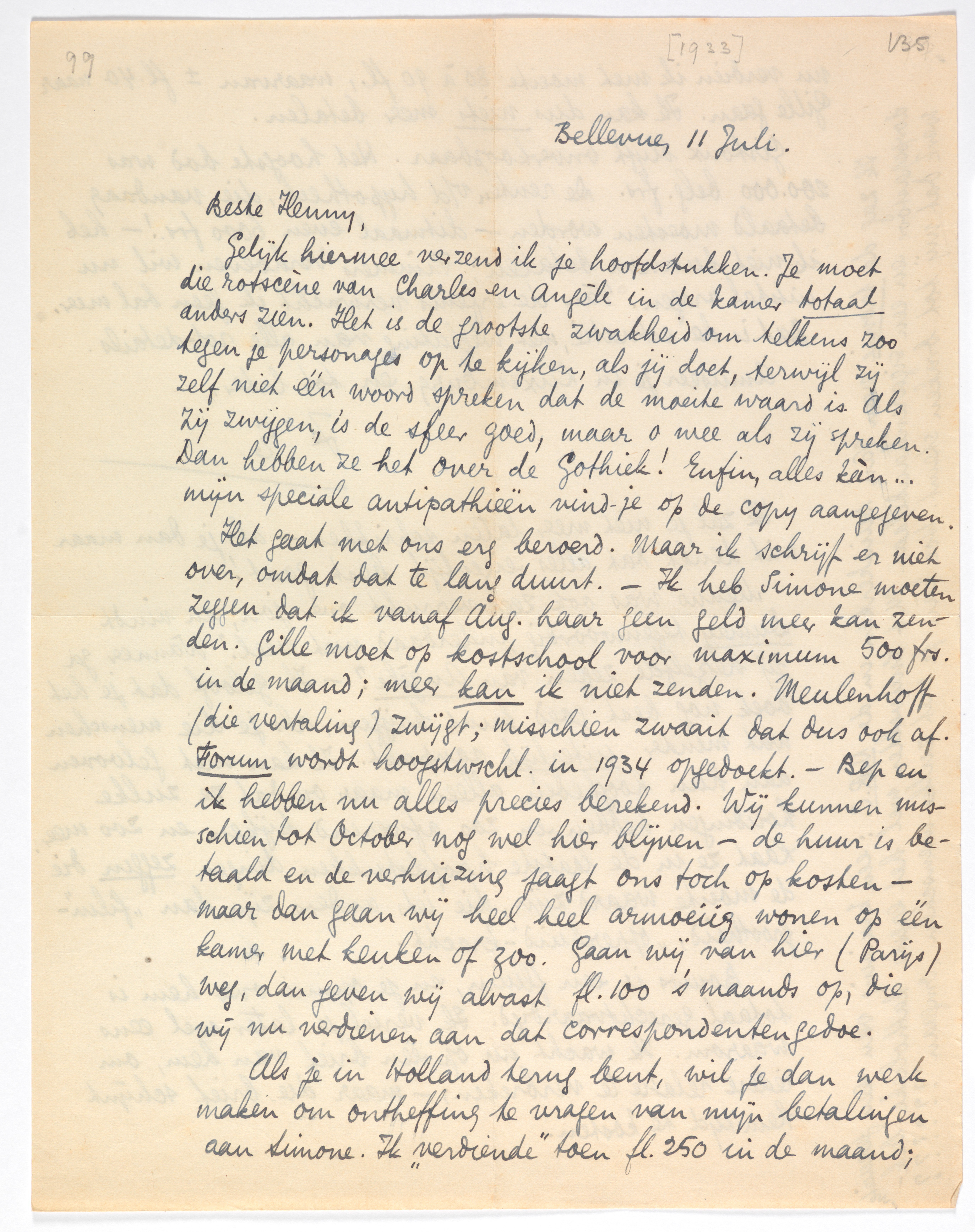 Het gaat met ons erg beroerd. Maar ik schrijf er niet over, omdat dat te lang duurt. - Ik heb Simone moeten zeggen dat ik vanaf Aug. haar geen geld meer kan zenden. Gille moet op kostschool voor maximum 500 frs. in de maand; meer kan ik niet zenden. Meulenhoff (die vertaling) zwijgt; misschien zwaait dat dus ook af. Forum wordt hoogstwschl. in 1934 opgedoekt. - Bep en ik hebben nu alles precies berekend. Wij kunnen misschien tot October nog wel hier blijven - de huur is betaald en de verhuizing jaagt ons toch op kosten - maar dan gaan wij heel heel armoeiig wonen op één kamer met keuken of zoo. Gaan wij van hier (Parijs) weg, dan geven wij alvast fl. 100 's maands op, die wij nu verdienen aan dat correspondenten-gedoe.