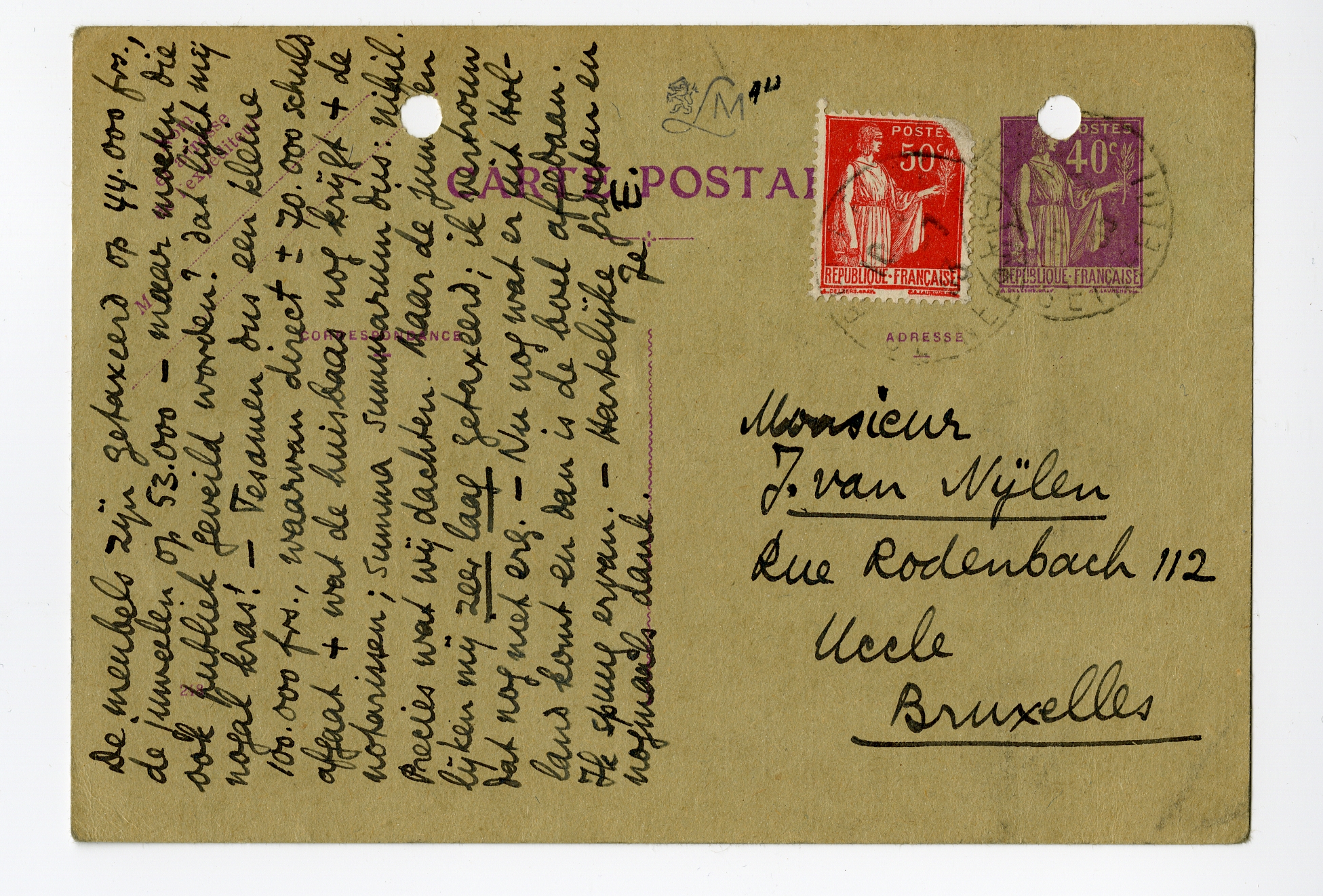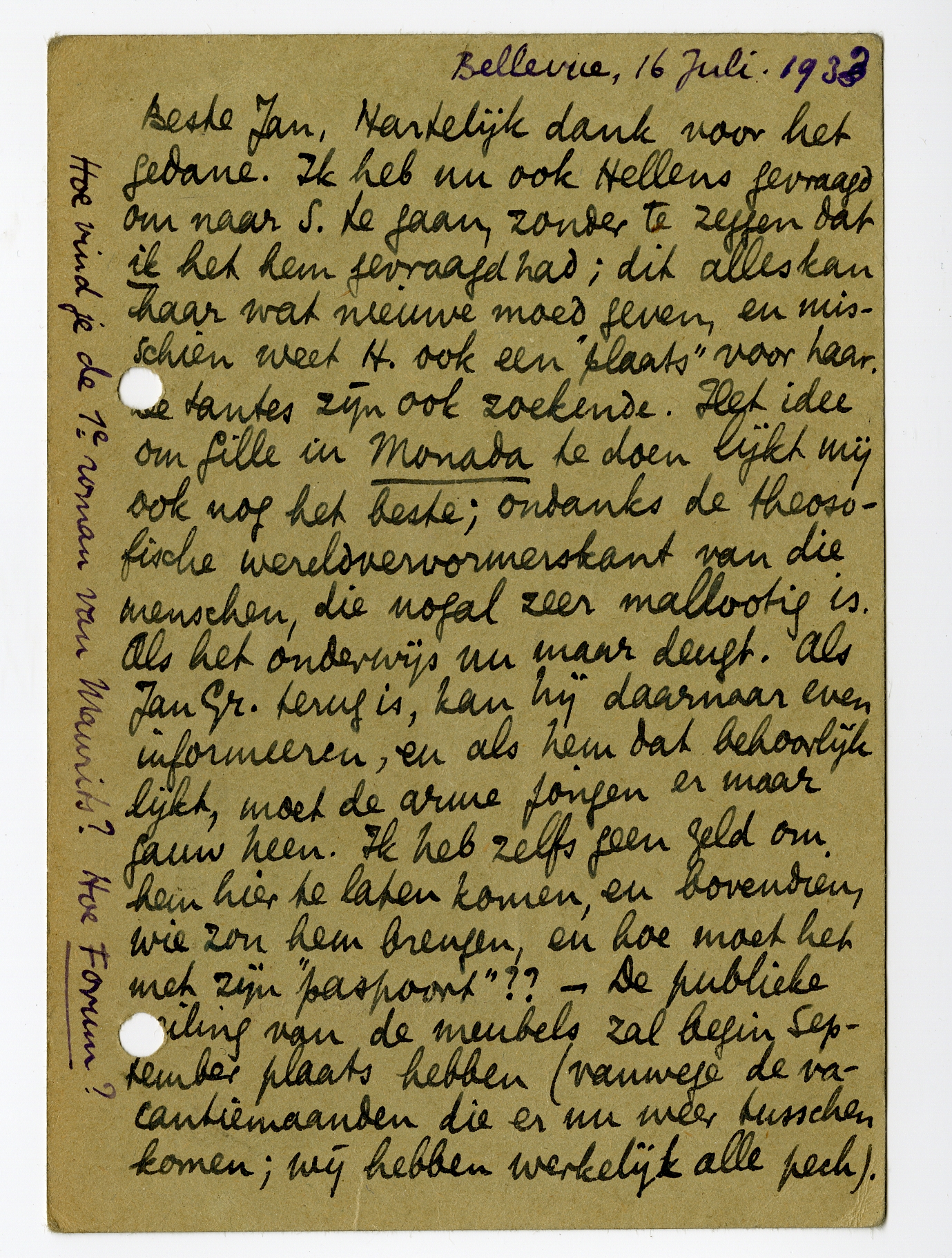 Beste Jan, Hartelijk dank voor het gedane. Ik heb nu ook Hellens gevraagd om naar S. te gaan, zonder te zeggen dat ik het hem gevraagd had; dit alles kan haar wat nieuwe moed geven, en misschien weet H. ook een ‘plaats’ voor haar. De tantes zijn ook zoekende. Het idee om Gille in Monada te doen lijkt mij ook nog het beste; ondanks de theosofische wereldvervormerskant van die menschen, die nogal zeer mallootig is. Als het onderwijs nu maar deugt. Als Jan Gr. terug is, kan hij daarnaar even informeeren, en als hem dat behoorlijk lijkt, moet de arme jongen er maar gauw heen. Ik heb zelfs geen geld om hem hier te laten komen, en bovendien, wie zou hem brengen, en hoe moet het met zijn ‘paspoort’?? - De publieke veiling van de meubels zal begin September plaats hebben (vanwege de vacantiemaanden die er nu weer tusschen komen; wij hebben werkelijk alle pech). De meubels zijn getaxeerd op 44.000 frs., de juweelen op 53.000 - maar moeten die ook publiek geveild worden? dat lijkt mij nogal kras! - Tesamen dus een kleine 100.000 frs., waarvan direct ± 70.000 schuld afgaat + wat de huisbaas nog krijgt + de notarissen; summa summarum dus: nihil. Precies wat wij dachten. Maar de juweelen lijken mij zeer laag getaxeerd; ik vertrouw dat nog niet erg. - Nu nog wat er uit Holland komt en dan is de boel afgedaan. Ik spuug ervan. - Hartelijke groeten en nogmaals dank.