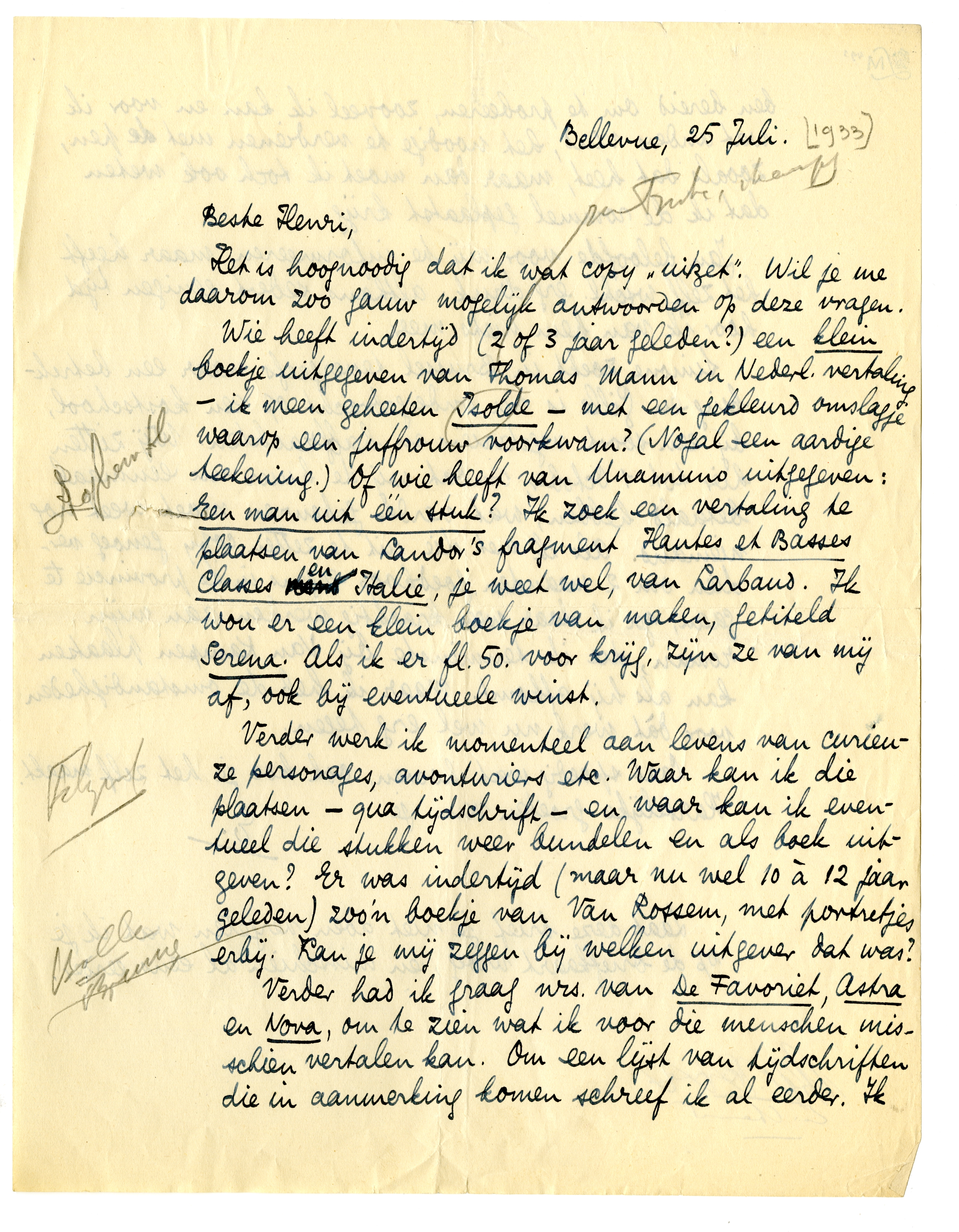 Wie heeft indertijd (2 of 3 jaar geleden?) een klein boekje uitgegeven van Thomas Mann in Nederl. vertaling - ik meen geheeten Isolde - met een gekleurd omslagje waarop een juffrouw voorkwam?2814 (Nogal een aardige teekening.) Of wie heeft van Unamuno uitgegeven: Een man uit één stuk?2815 Ik zoek een vertaling te plaatsen van Landor's fragment Hautes et Basses Classes en Italie, je weet wel, van Larbaud. Ik wou er een klein boekje van maken, getiteld Serena. Als ik er fl. 50. voor krijg, zijn ze van mij af, ook bij eventueele winst.