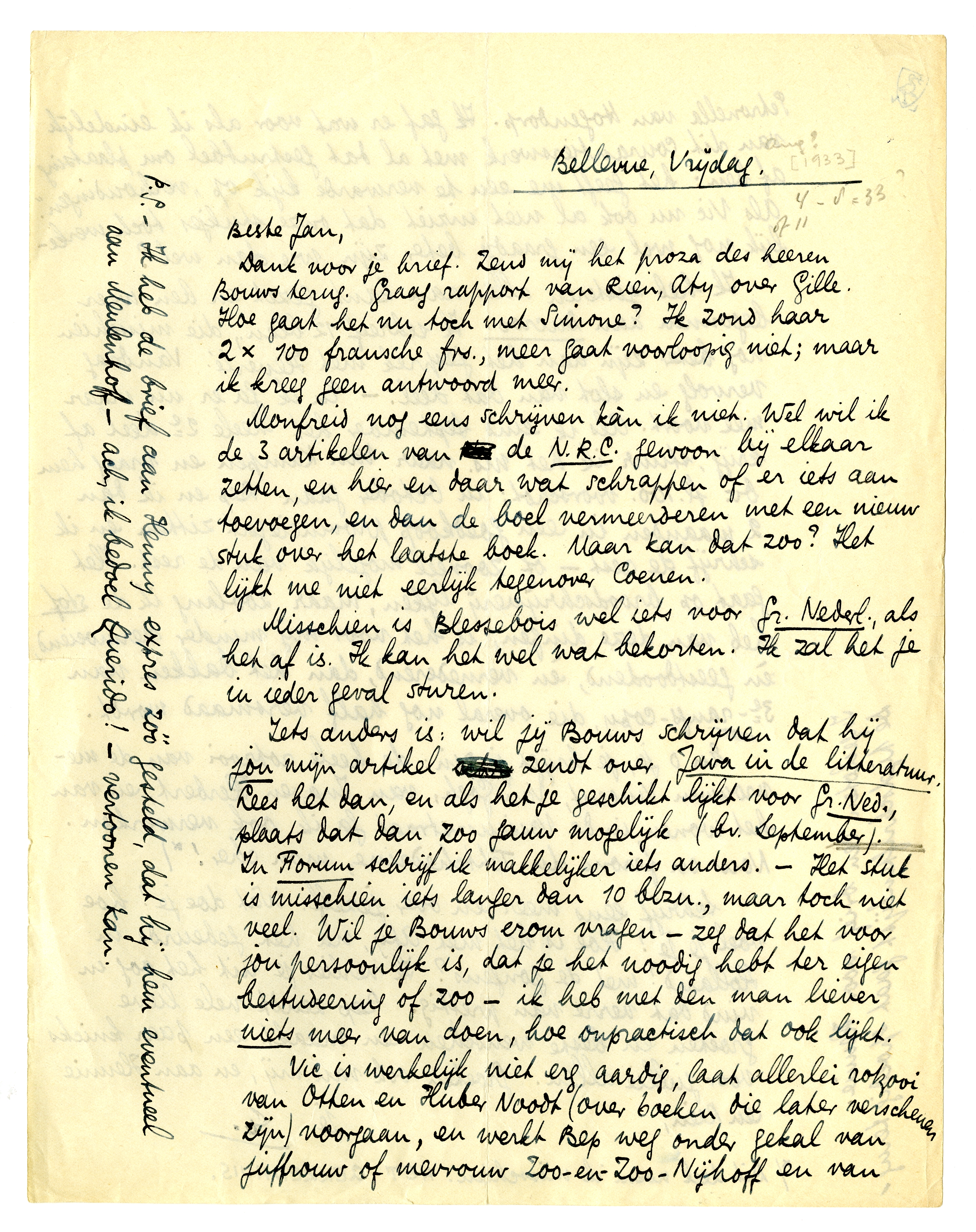 Iets anders is: wil jij Bouws schrijven dat hij jou mijn artikel zendt over Java in de litteratuur.2824 Lees het dan, en als het je geschikt lijkt voor Gr.Ned., plaats dat dan zoo gauw mogelijk (bv. September). In Forum schrijf ik makkelijker iets anders. - Het stuk is misschien iets langer dan 10 blzn., maar toch niet veel. Wil je Bouws erom vragen - zeg dat het voor jou persoonlijk is, dat je het noodig hebt ter eigen bestudeering of zoo - ik heb met den man liever niets meer van doen, hoe onpractisch dat ook lijkt.