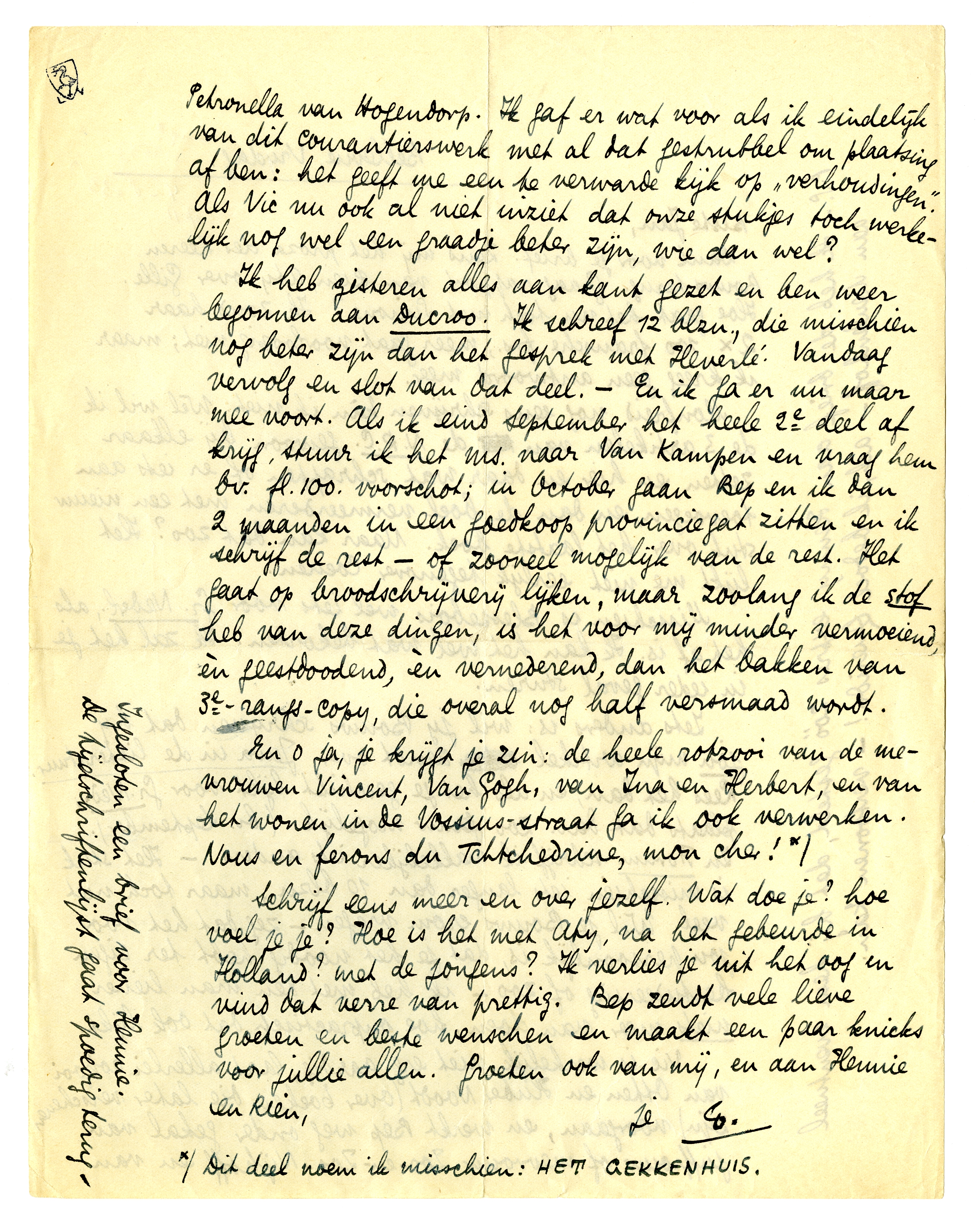 Ik heb gisteren alles aan kant gezet en ben weer begonnen aan Ducroo. Ik schreef 12 blzn., die misschien nog beter zijn dan het gesprek met Heverlé. Vandaag vervolg en slot van dat deel. - En ik ga er nu maar mee voort. Als ik eind September het heele 2e deel af krijg, stuur ik het ms. naar Van Kampen en vraag hem bv. fl. 100. voorschot; in October gaan Bep en ik dan 2 maanden in een goedkoop provinciegat zitten en ik schrijf de rest - of zooveel mogelijk van de rest. Het gaat op broodschrijverij lijken, maar zoolang ik de stof heb van deze dingen, is het voor mij minder vermoeiend, èn geestdoodend, èn vernederend, dan het bakken van 3e-rangs-copy, die overal nog half versmaad wordt.