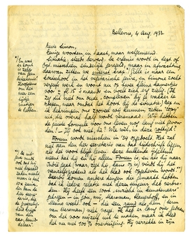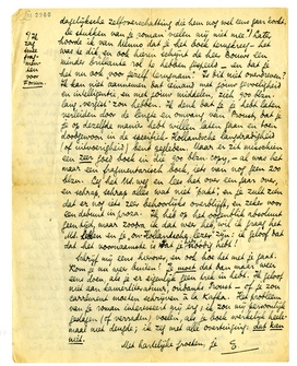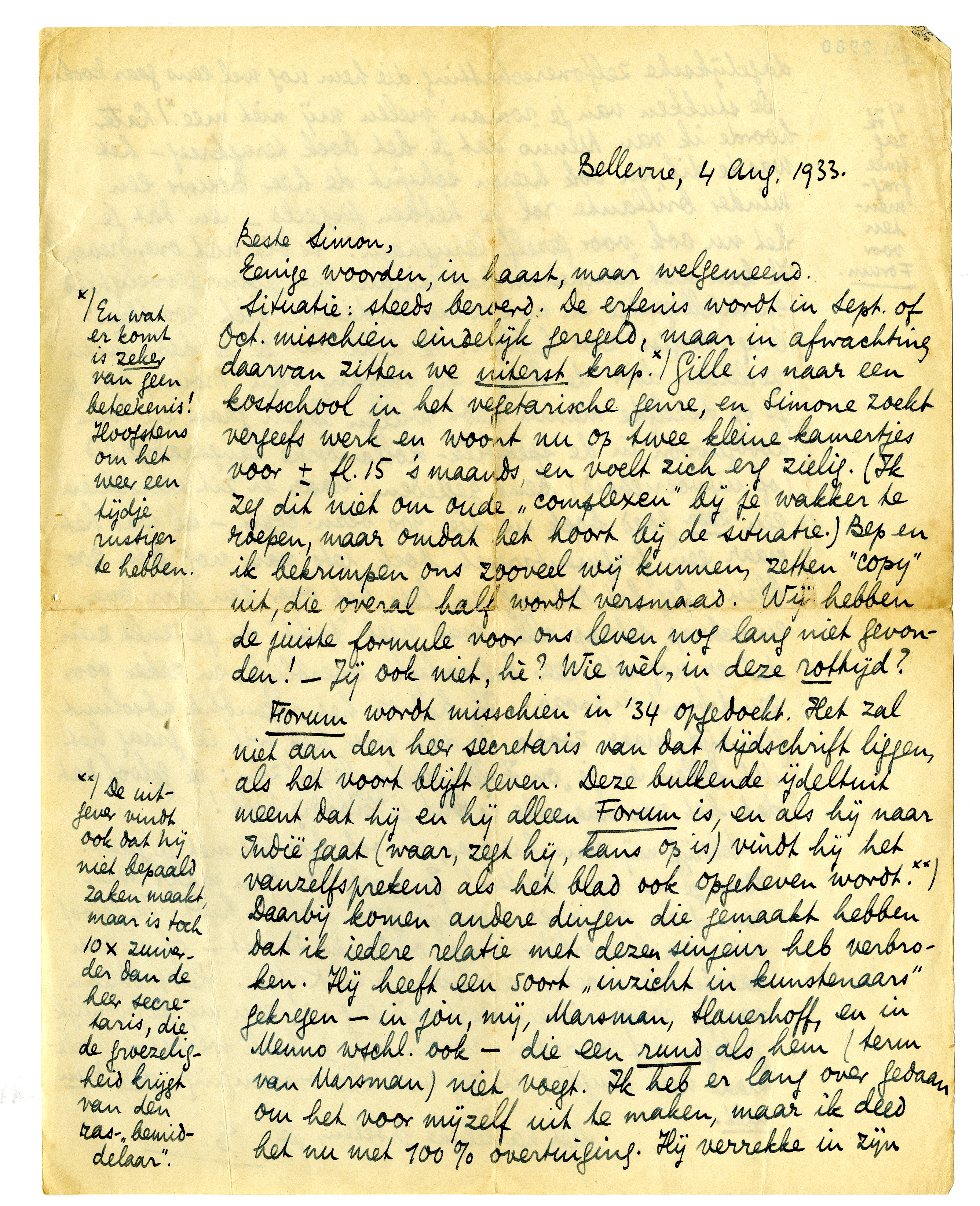 Situatie: steeds beroerd. De erfenis wordt in Sept. of Oct. mis-schien eindelijk geregeld, maar in afwachting daarvan zitten we uiterst krap.* Gille is naar een kostschool in het vegetarische genre, en Simone zoekt vergeefs werk en woont nu op twee kleine kamertjes voor ± fl. 15 's maands, en voelt zich erg zielig. (Ik zeg dit niet om oude ‘complexen’ bij je wakker te roepen, maar omdat het hoort bij de situatie.) Bep en ik bekrimpen ons zooveel wij kunnen, zetten ‘copy’ uit, die overal half wordt versmaad. Wij hebben de juiste formule voor ons leven nog lang niet gevonden! - Jij ook niet, hè? Wie wèl, in deze rottijd?