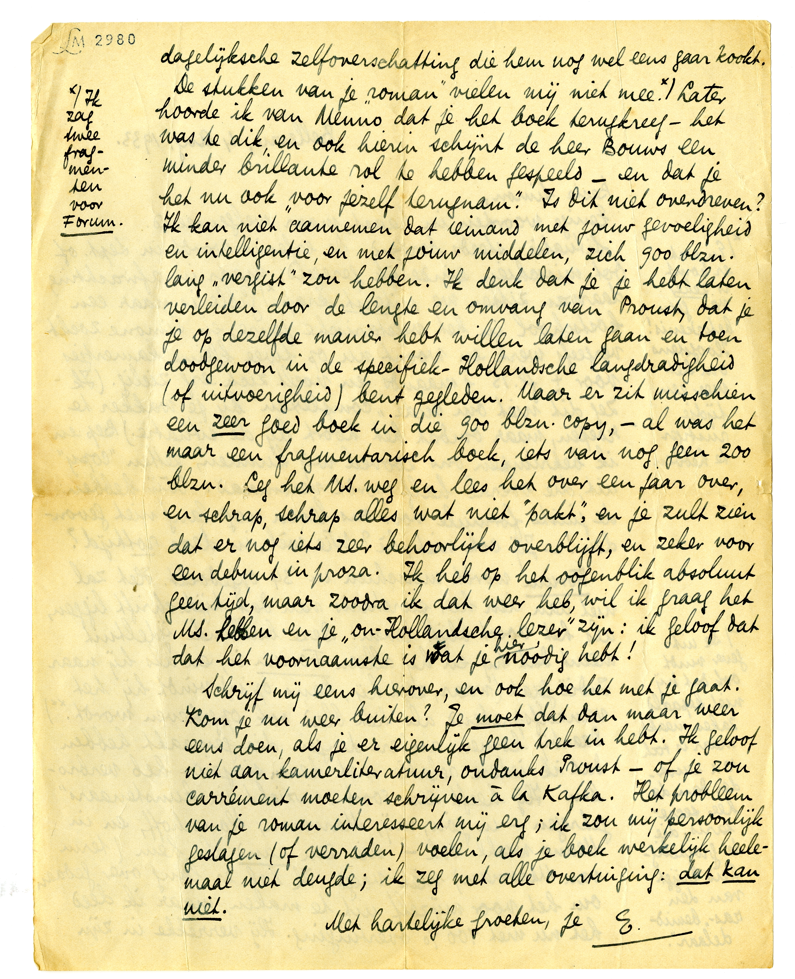 De stukken van je ‘roman’2827 vielen mij niet mee.2828 Later hoorde ik van Menno dat je het boek terugkreeg - het was te dik, en ook hierin schijnt de heer Bouws een minder brillante rol te hebben gespeeld - en dat je het nu ook ‘voor jezelf terugnam’. Is dit niet overdreven? Ik kan niet aannemen dat iemand met jouw gevoeligheid en intelligentie, en met jouw middelen, zich 900 blzn. lang ‘vergist’ zou hebben. Ik denk dat je je hebt laten verleiden door de lengte en omvang van Proust, dat je je op dezelfde manier hebt willen laten gaan en toen doodgewoon in de specifiek-Hollandsche langdradigheid (of uitvoerigheid) bent gegleden. Maar er zit misschien een zeer goed boek in die 900 blzn. copy, - al was het maar een fragmenta-risch boek, iets van nog geen 200 blzn. Leg het MS. weg en lees het over een jaar over, en schrap, schrap alles wat niet ‘pakt’, en je zult zien dat er nog iets zeer behoorlijks overblijft, en zeker voor een debuut in proza. Ik heb op het oogenblik absoluut geen tijd, maar zoodra ik dat weer heb, wil ik graag het MS. hebben en je ‘on-Hollandsche lezer’ zijn: ik geloof dat dat het voornaamste is wat je hier noodig hebt!