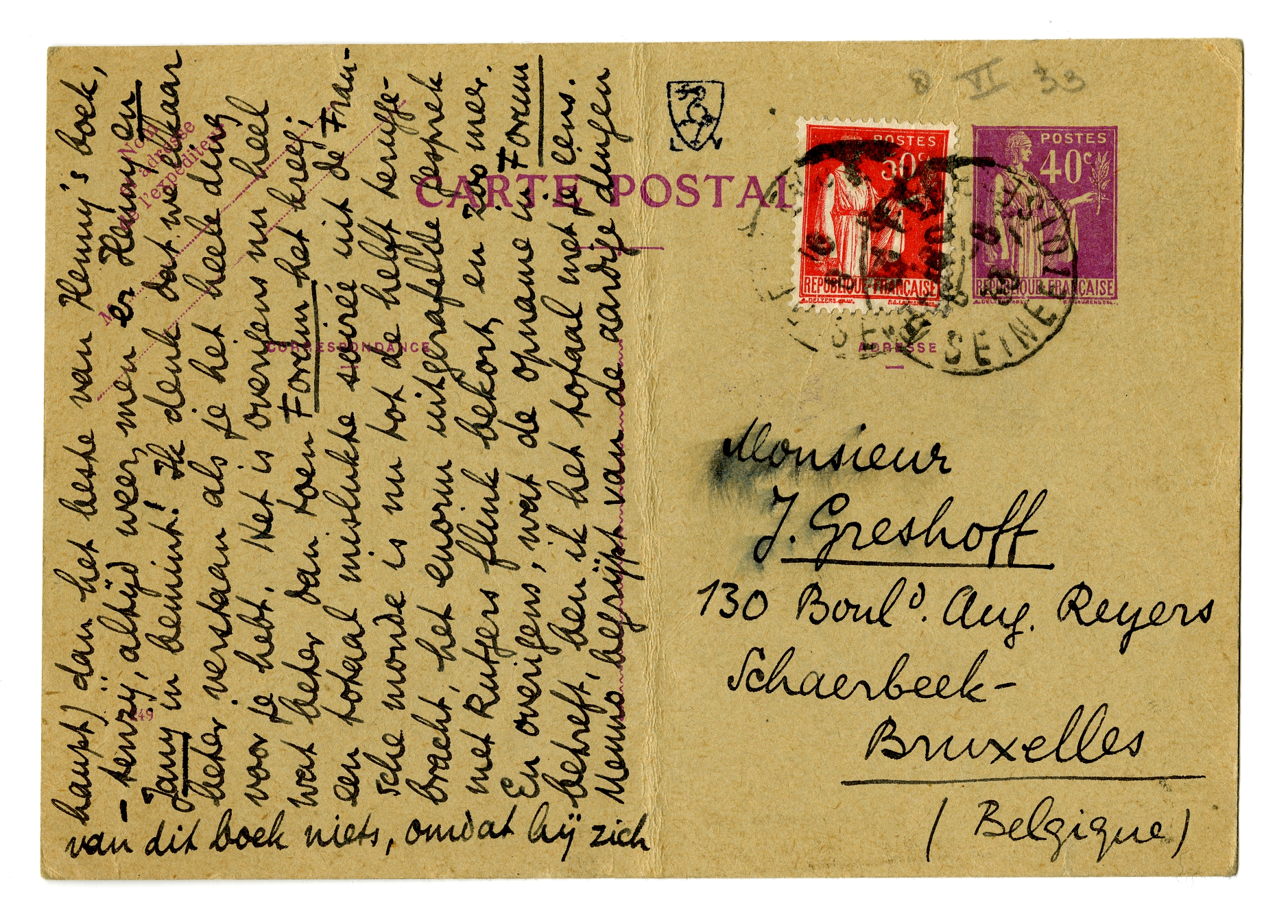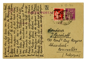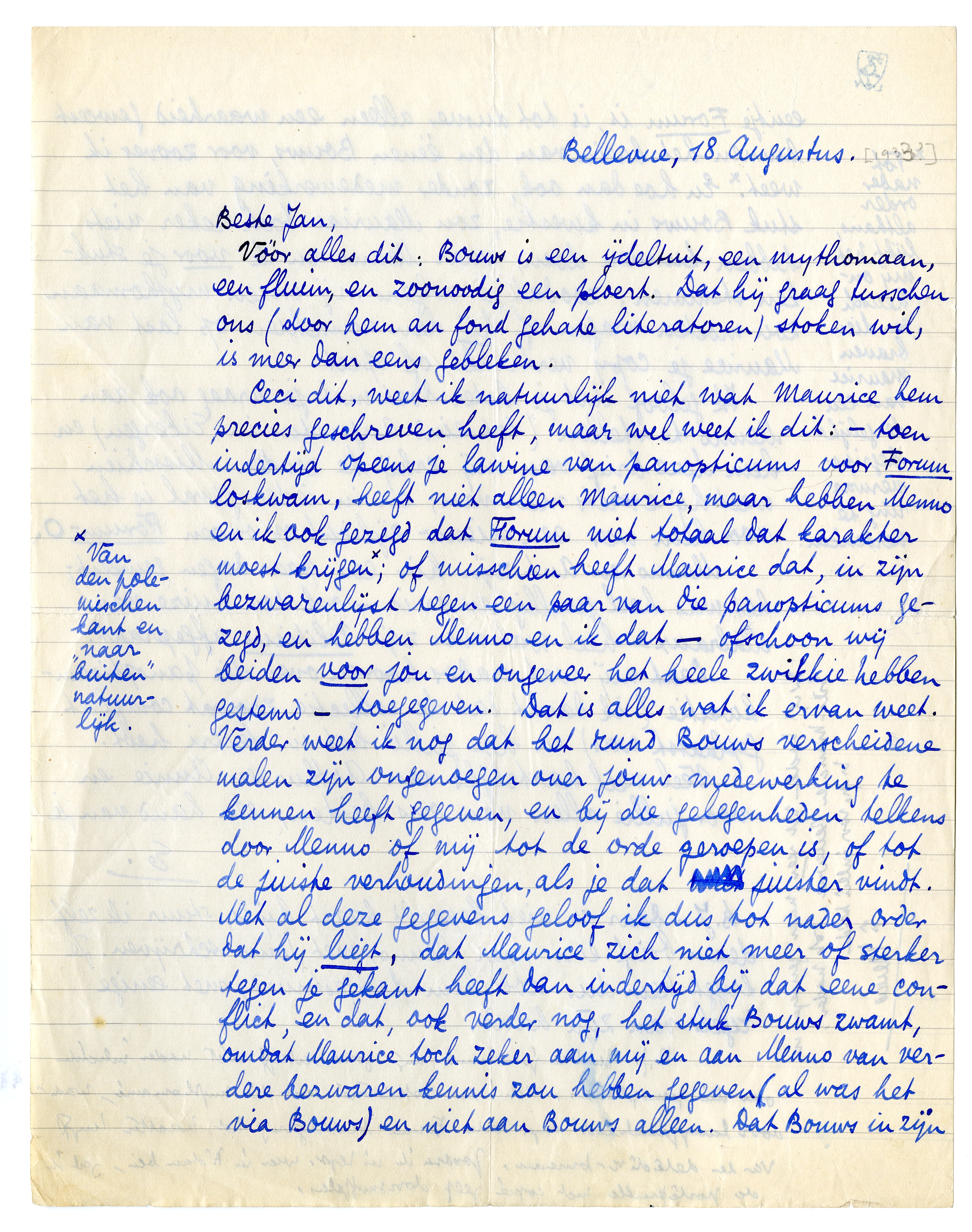 B.J. - Een wonderlijk lyrisch iemand ben je! Waar haal je 't nu in Godsnaam vandaan dat Maurice ‘niet tippen’ kan aan den roman van Henny en dat Dumay weer slechter is dan Maurice? Bep en ik hebben elkaar bij deze berichten verwezen aangestaard... De roman van Henny is 1o. ± traditioneele snert qua roman (bovendien zwak, klein, ik bedoel: mager - een gegeven voor een novelle) 2o veel te literair, Janiaansch geschreven, met termen die den inhoud verre te boven gaan (hiervan is nu wel iets opgeruimd). Maar... als men Henny kent is het heel sympathiek, en als men Jany ook nog kent, wordt het bepaald boeiend. Dàt is het aardige ervan. Ik voel 10 × meer voor den roman van Henny dan voor Het Leven dat wij droomden, maar qua roman, qua werk, qua vlotheid, is Dumay onvergelijkelijk beter. Menno kon zijn onderwerp absoluut aan: bovendien is het laatste hfdst. van Dumay, en Max Donner in de mist, stukken beter (überhaupt) dan het beste van Henny's boek, - tenzij, altijd weer, men er Henny en Jany in bemint! Ik denk dat we elkaar beter verstaan als je het heele ding voor je hebt. Het is overigens nu heel wat beter dan toen Forum het kreeg; een totaal mislukte soirée uit de Parijsche monde is nu tot de helft teruggebracht, het enorm uitgerafelde gesprek met Rutgers flink bekort, en zoo meer. En overigens, wat de opname in Forum betreft, ben ik het totaal met je eens. Menno begrijpt van de aardige dingen van dit boek niets, omdat hij zich blind gekeken heeft op de ‘realiteit’ van2833 Kaas. Maar overdrijf jij nu niet naar den anderen kant! - Tot Vrijdag.