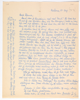 Je stukken zond ik terug. Stuur mij van alles nog een schoone proef. Ik schrijf daar dan met potlood mijn opmerkingen nog bij. Het laatste hoofdstuk is goed, ofschoon, vergeleken met de rest, ‘droog’, d.w.z. op een drogere manier voorgesteld. Maar als je de laatste zinnen iets ‘voller’ maakt, kan het toch best zoo, lijkt mij. Wat denkt Charles van Angèle, als zij dood is (hij weet dat dit gebeuren zal) en van Van der Mark? - Het gesprek tusschen Charles en V.d.M. is ook wat erg sec, alleen op wat zij in hoofdzaak denken ingesteld; je moest probeeren hier en daar nog een subtiel trekje te plaatsen over hun gevoelsverhouding tot elkaar (terwijl zij al pratend samenzijn). Dat is ook meer in jouw lijn - getuige de commentaren bij Charles-Rutgers. Niet dat je hetzelfde moet maken, maar je hebt nu zoo'n straffe overgang naar een geheel andere methode!