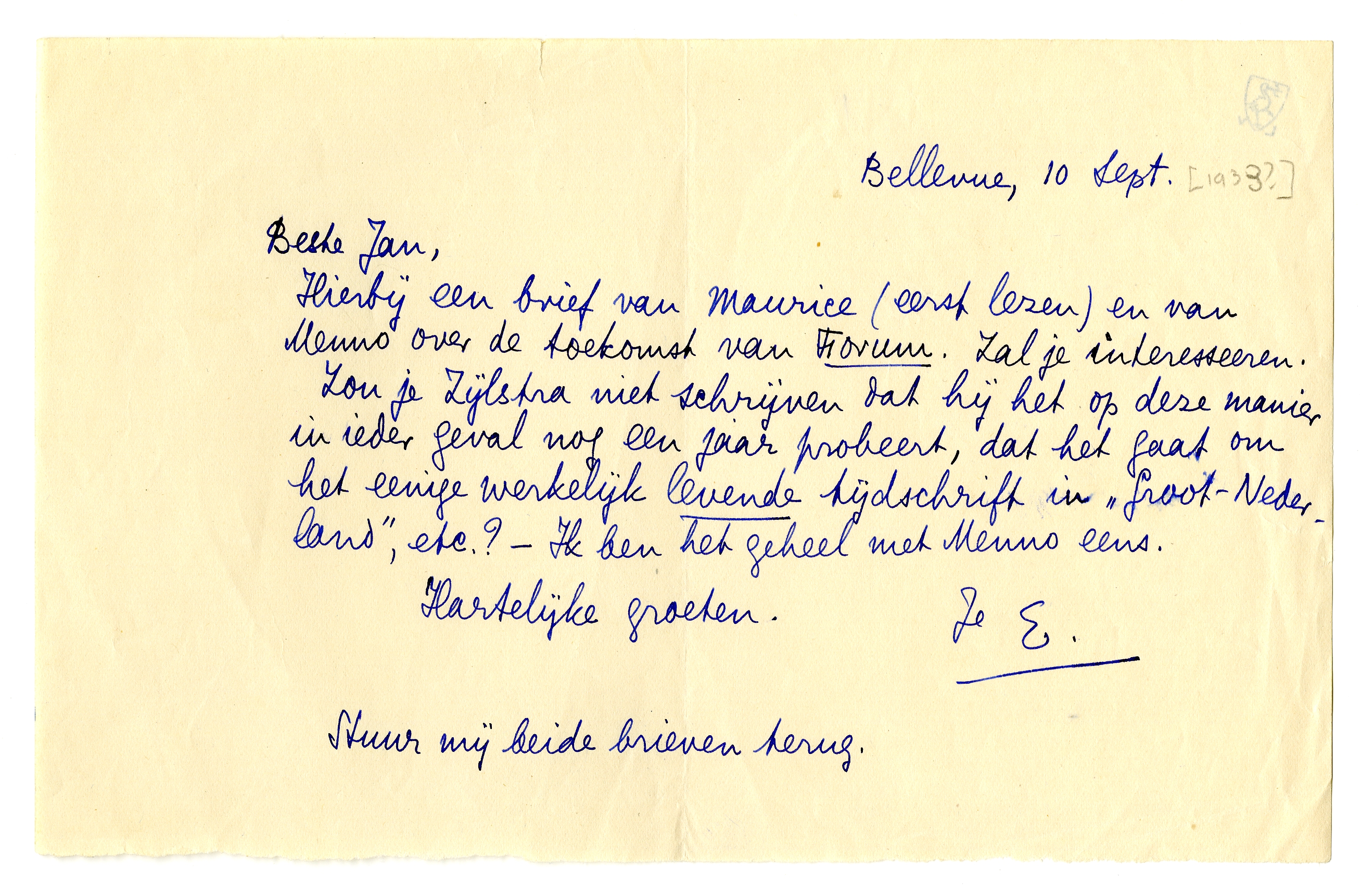 Zou je Zijlstra niet schrijven dat hij het op deze manier in ieder geval nog een jaar probeert, dat het gaat om het eenige werkelijk levende tijdschrift in ‘Groot-Nederland’, etc.? - Ik ben het geheel met Menno eens.