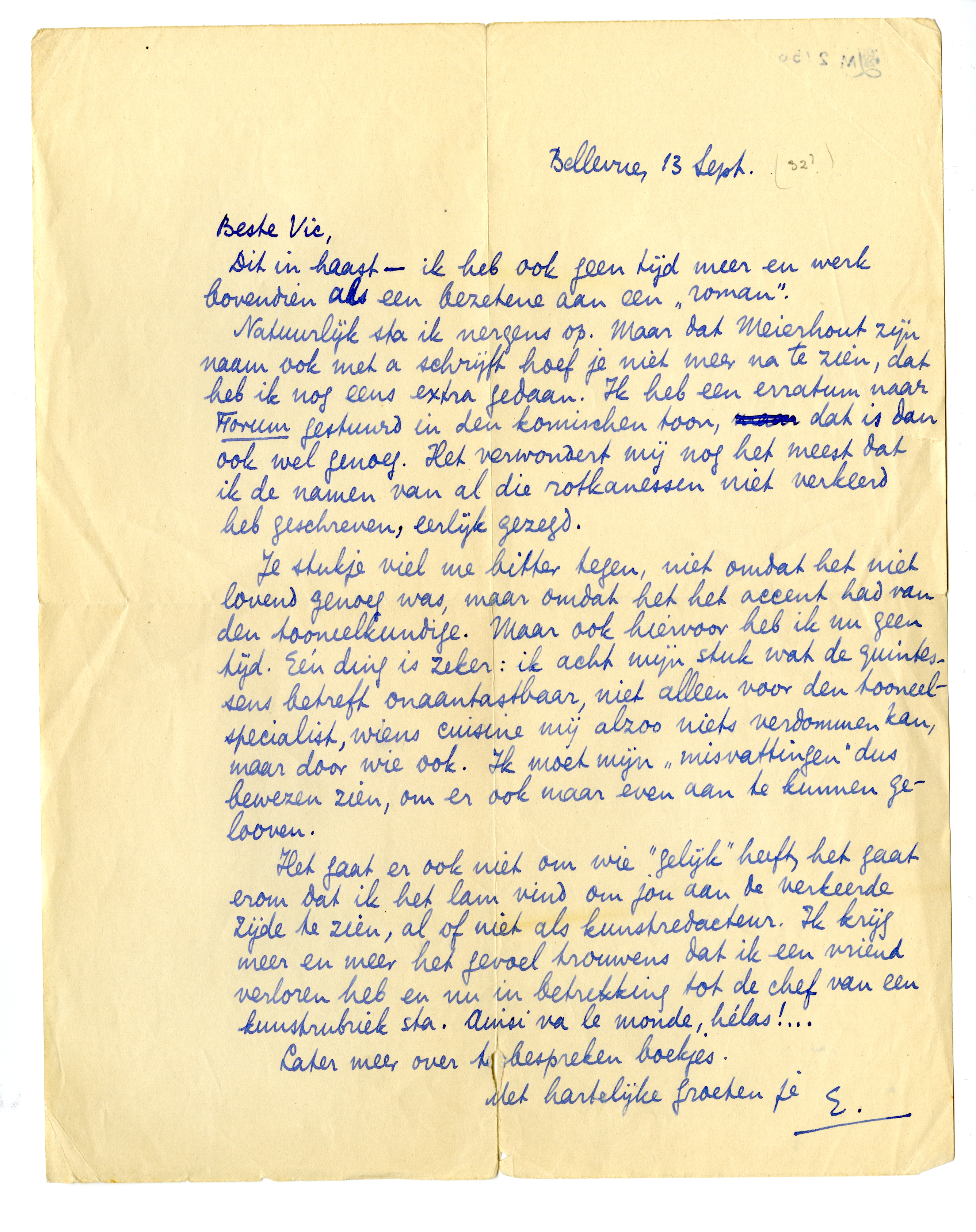 Het gaat er ook niet om wie ‘gelijk’ heeft, het gaat erom dat ik het lam vind om jou aan de verkeerde zijde te zien, al of niet als kunstredacteur. Ik krijg meer en meer het gevoel trouwens dat ik een vriend verloren heb en nu in betrekking tot de chef van een kunstfabriek sta. Ainsi va le monde, hélas!...