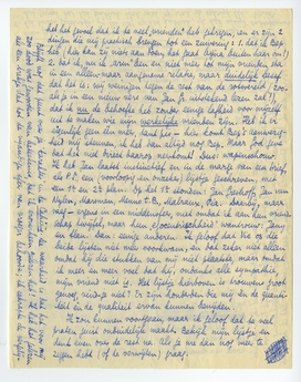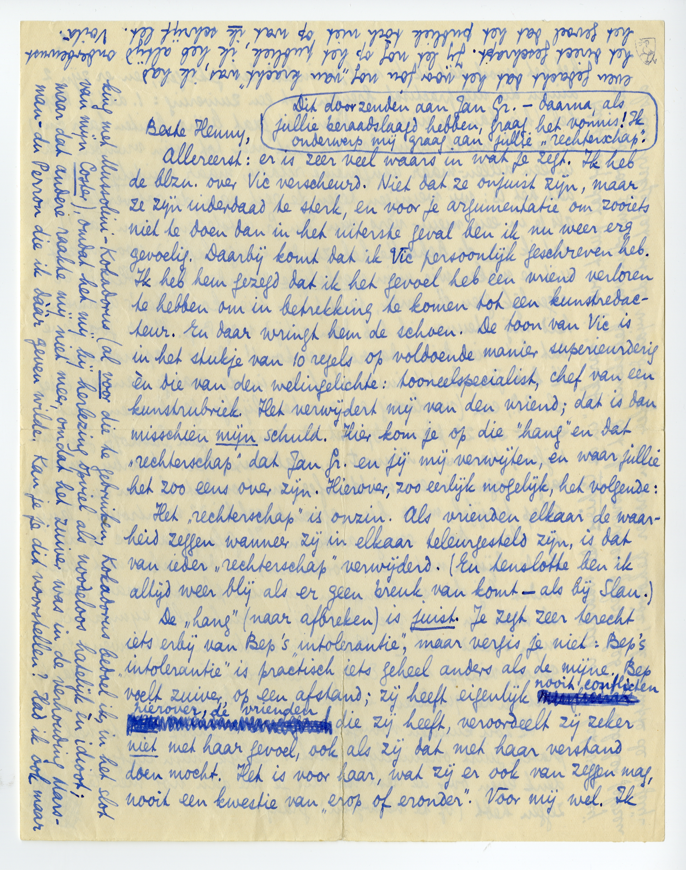 Allereerst: er is zeer veel waars in wat je zegt. Ik heb de blzn. over Vic verscheurd. Niet dat ze onjuist zijn, maar ze zijn inderdaad te sterk, en voor je argumentatie om zooiets niet te doen dan in het uiterste geval ben ik nu weer erg gevoelig. Daarbij komt dat ik Vic persoonlijk geschreven heb. Ik heb hem gezegd dat ik het gevoel heb een vriend verloren te hebben om in betrekking te komen tot een kunstredacteur. En daar wringt hem de schoen. De toon van Vic is in het stukje van 10 regels op voldoende manier superieur èn die van een welingelichte: tooneelspecialist, chef van de kunstrubriek. Het verwijdert mij van den vriend; dat is dan misschien mijn schuld. Hier kom je op die ‘hang’ en dat ‘rechterschap’ dat Jan Gr. en jij mij verwijten, en waar jullie het zoo eens over zijn. Hierover, zoo eerlijk mogelijk, het volgende.