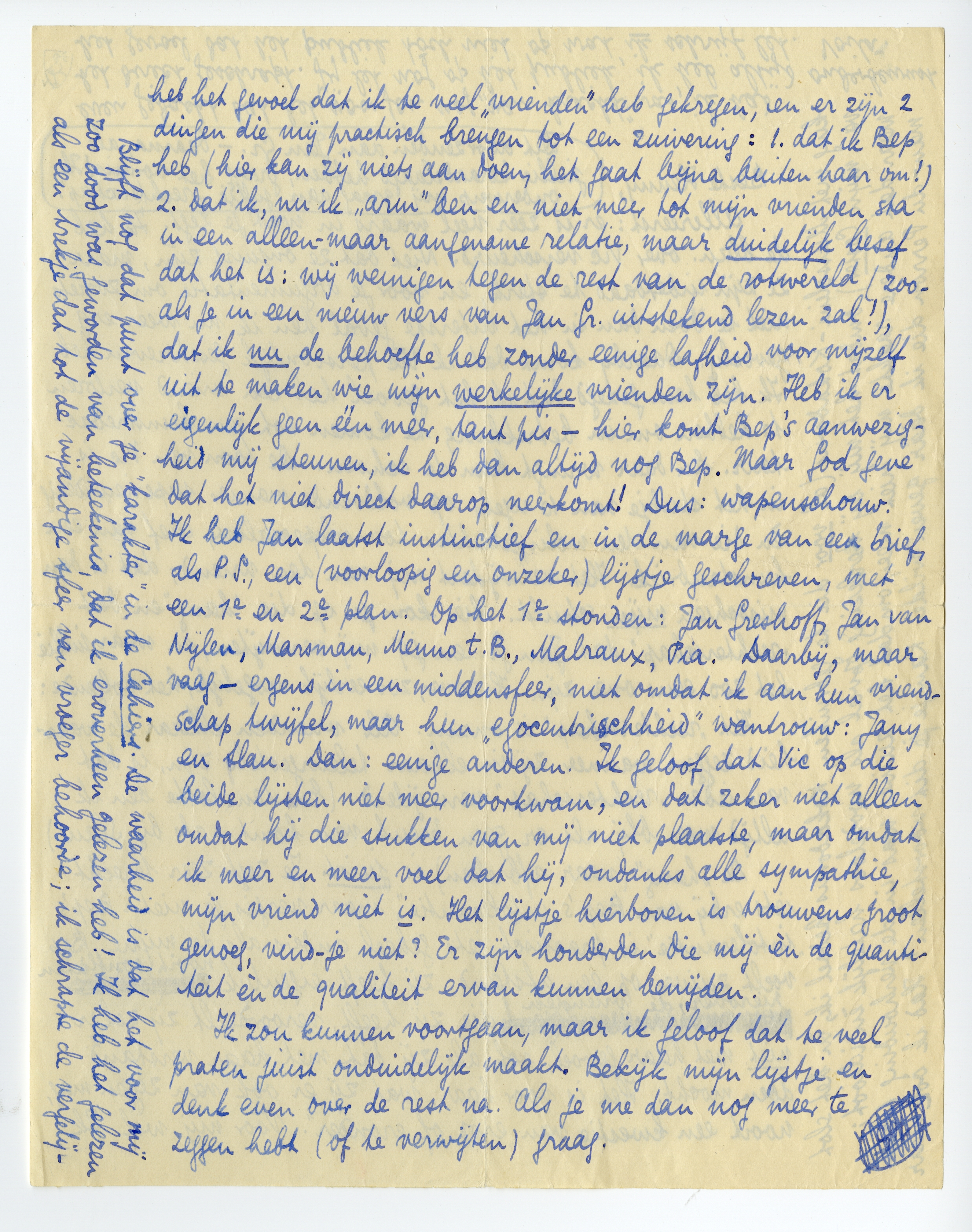 De ‘hang’ (naar afbreken) is juist. Je zegt zeer terecht iets erbij van Bep's ‘intolerantie’, maar vergis je niet: Bep's ‘intolerantie’ is practisch iets geheel anders als de mijne. Zij voelt zuiver, op een afstand; zij heeft eigenlijk nooit conflicten hierover, de vrienden die zij heeft, veroordeelt zij zeker niet met haar gevoel, ook als zij dat met haar verstand doen mocht. Het is voor haar, wat zij er ook van zeggen mag, nooit een kwestie van ‘erop of eronder’. Voor mij wel. Ik heb het gevoel dat ik te veel ‘vrienden’ heb gekregen, en er zijn 2 dingen die mij practisch brengen tot een zuivering: 1. dat ik Bep heb (hier kan zij niets aan doen, het gaat bijna buiten haar om!) 2. dat ik, nu ik ‘arm’ ben en niet meer tot mijn vrienden sta in een alleen-maar aangename relatie, maar duidelijk besef dat het is: wij weinigen tegen de rest van de rotwereld (zooals je in een nieuw vers van Jan Gr. uitstekend lezen zal!), dat ik nu de behoefte heb zonder eenige lafheid voor mijzelf uit te maken wie mijn werkelijke vrienden zijn. Heb ik er eigenlijk geen één meer, tant pis - hier komt Bep's aanwezigheid mij steunen, ik heb dan altijd nog Bep. Maar God geve dat het niet direct daarop neerkomt! Dus: wapenschouw. Ik heb Jan laatst instinctief en in de marge van een brief, als P.S., een (voorloopig en onzeker) lijstje geschreven, met een 1e en 2e plan. Op het 1e stonden: Jan Greshoff, Jan van Nijlen, Marsman, Menno t.B., Malraux, Pia. Daarbij, maar vaag - ergens in een middensfeer, niet omdat ik aan hun vriendschap twijfel, maar hun ‘egocentrischheid’ wantrouw: Jany en Slau. Dan: eenige anderen. Ik geloof dat Vic op die beide lijsten niet meer voorkwam, en dat zeker niet alleen omdat hij die stukken van mij niet plaatste, maar omdat ik meer en meer voel dat hij, ondanks alle sympathie, mijn vriend niet is. Het lijstje hierboven is trouwens groot genoeg, vind-je niet? Er zijn honderden die mij èn de quantiteit èn de qualiteit ervan kunnen benijden.