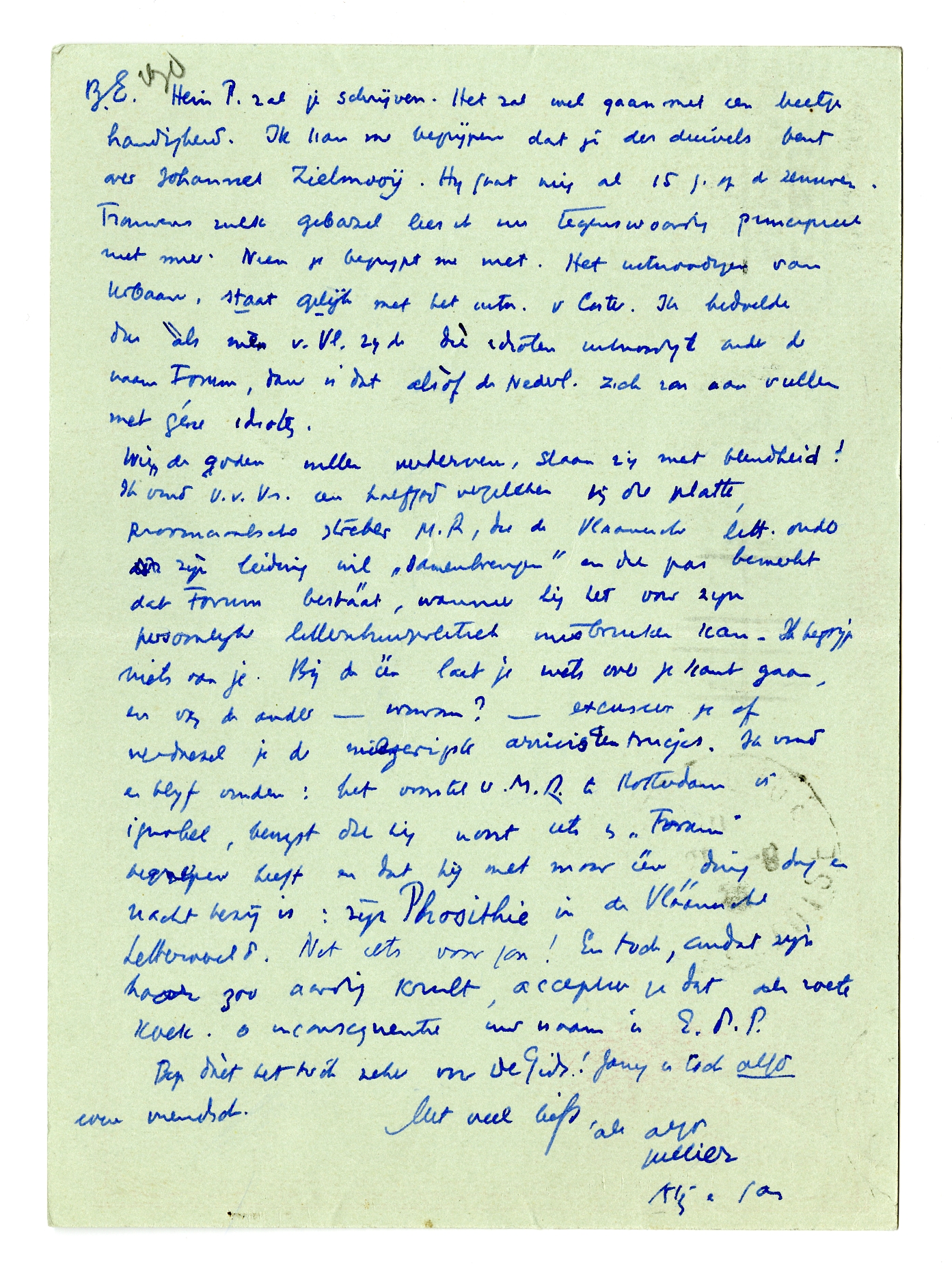 Wien de Goden willen verderven, slaan zij met blindheid! Ik vind V.v.Vr. een halfgod vergeleken bij de platte, provinciaalsche streber als M.R., die de Vlaamsche litt. onder zijn leiding wil ‘samenbrengen’ en die pas bemerkt dat Forum bestáát, wanneer hij het voor zijn persoonlijke litteratuurpolitiek misbruiken kan. Ik begrijp niets van je. Bij de één laat je niets over je kant gaan, en van de ander - waarom? - excuseer je of verdoezel je de miezerigste arrivisten trucjes. Ik vond en blijf vinden: het voorstel v. M.R. te Rotterdam is ignobel, bewijst dat hij nooit iets in ‘Forum’ begrepen heeft en dat hij met maar één ding dag en nacht bezig is: zijn Phosithie in de Vláámsche letterwereld. Net iets voor jou! En toch, omdat zijn haar zoo aardig krult, accepteer je dat als zoete koek. O inconsequentie uw naam is E.d.P.