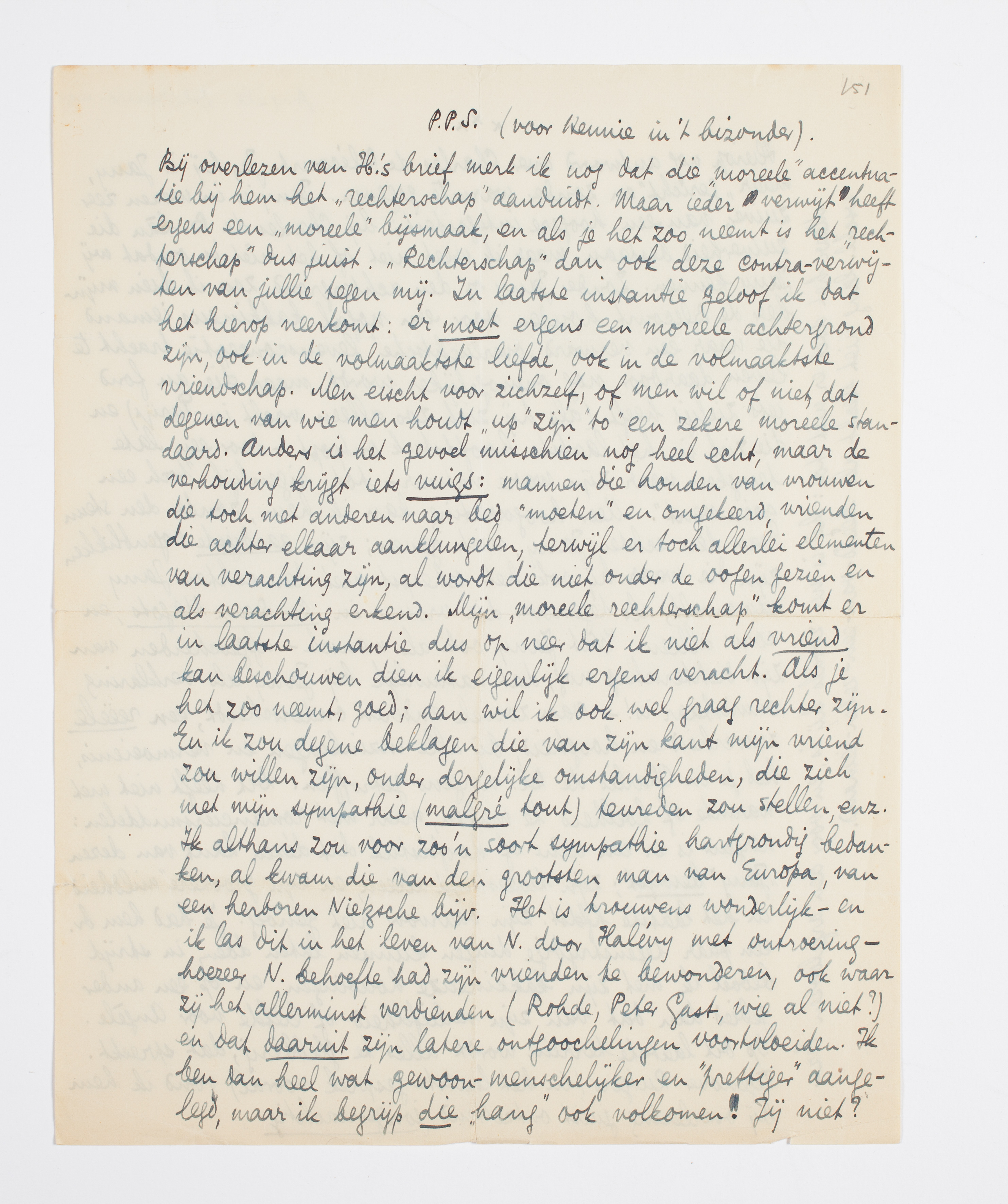 Bij overlezen van H.'s brief merk ik nog dat die ‘moreele’ accentuatie bij hem het ‘rechterschap’ aanduidt. Maar ieder verwijt heeft ergens een ‘moreele’ bijsmaak, en als je het zoo neemt is het ‘rechterschap’ dus juist. ‘Rechterschap’ dan ook deze contra-verwijten van jullie tegen mij. In laatste instantie geloof ik dat het hierop neerkomt: er moet ergens een moreele achtergrond zijn, ook in de volmaaktste liefde, ook in de volmaaktste vriendschap. Men eischt voor zichzelf, of men wil of niet, dat degenen van wie men houdt ‘up’ zijn ‘to’ een zekere moreele standaard. Anders is het gevoel misschien nog heel echt, maar de verhouding krijgt iets vuigs: mannen die houden van vrouwen die toch met anderen naar bed ‘moeten’ en omgekeerd, vrienden die achter elkaar aanklungelen, terwijl er toch allerlei elementen van verachting zijn, al wordt die niet onder de oogen gezien en als verachting erkend. Mijn ‘moreele rechterschap’ komt er in laatste instantie dus op neer dat ik niet als vriend kan beschouwen dien ik eigenlijk ergens veracht. Als je het zoo neemt, goed; dan wil ik ook wel graag rechter zijn. En ik zou degene beklagen die van zijn kant mijn vriend zou willen zijn, onder dergelijke omstandigheden, die zich met mijn sympathie (malgré tout) tevreden zou stellen, enz. Ik althans zou voor zoo'n soort sympathie hartgrondig bedanken, al kwam die van den grootsten man van Europa, van een herboren Nietzsche bijv. Het is trouwens wonderlijk - en ik las dit in het leven van N. door Halévy met ontroering - hoezeer N. behoefte had zijn vrienden te bewonderen, ook waar zij het allerminst verdienden (Rohde, Peter Gast, wie al niet?) en dat daaruit zijn latere ontgoochelingen voortvloeiden. Ik ben dan heel wat gewoon-menschelijker en ‘prettiger’ aangelegd, maar ik begrijp die ‘hang’ ook volkomen! Jij niet?