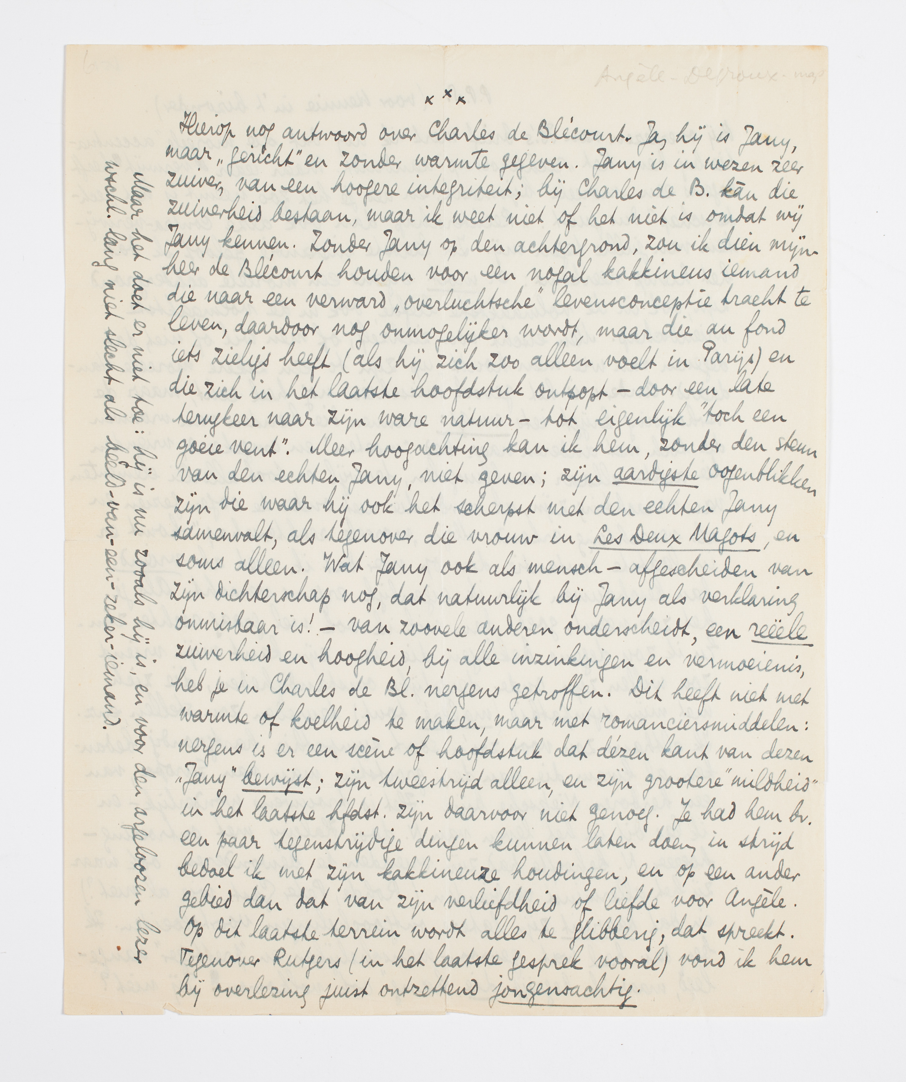Hierop nog antwoord over Charles de Blécourt. Ja, hij is Jany, maar ‘gericht’ en zonder warmte gegeven. Jany is in wezen zeer zuiver, van een hoogere integriteit; bij Charles de B. kàn die zuiverheid bestaan, maar ik weet niet of het niet is omdat wij Jany kennen. Zonder Jany op den achtergrond, zou ik dien mijnheer de Blécourt houden voor een nogal kakkineus iemand die naar een verward ‘overluchtsche’ levensconceptie tracht te leven, daardoor nog onmogelijker wordt, maar die au fond iets zieligs heeft (als hij zich zoo alleen voelt in Parijs) en die zich in het laatste hoofdstuk ontpopt - door een late terugkeer naar zijn ware natuur - tot eigenlijk ‘toch een goeie vent’. Meer hoogachting kan ik hem, zonder den steun van den echten Jany, niet geven; zijn aardigste oogenblikken zijn die waar hij ook het scherpst met den echten Jany samenvalt, als tegenover die vrouw in Les Deux Magots, en soms alleen. Wat Jany ook als mensch - afgescheiden van zijn dichterschap nog, dat natuurlijk bij Jany als verklaring onmisbaar is! - van zoovele anderen onderscheidt, een reëele zuiverheid en hoogheid, bij alle inzinkingen en vermoeienis, heb je in Charles de Bl. nergens getroffen. Dit heeft niet met warmte of koelheid te maken, maar met romanciersmiddelen: nergens is er een scène of hoofdstuk dat dézen kant van dezen ‘Jany’ bewijst; zijn tweestrijd alleen, en zijn grootere ‘mildheid’ in het laatste hfdst. zijn daarvoor niet genoeg. Je had hem bv. een paar tegenstrijdige dingen kunnen laten doen, in strijd bedoel ik met zijn kakkineuze houdingen, en op een ander gebied dan dat van zijn verliefdheid of liefde voor Angèle. Op dit laatste terrein wordt alles te glibberig, dat spreekt. Tegenover Rutgers (in het laatste gesprek vooral) vond ik hem bij overlezing juist ontzettend jongensachtig.
