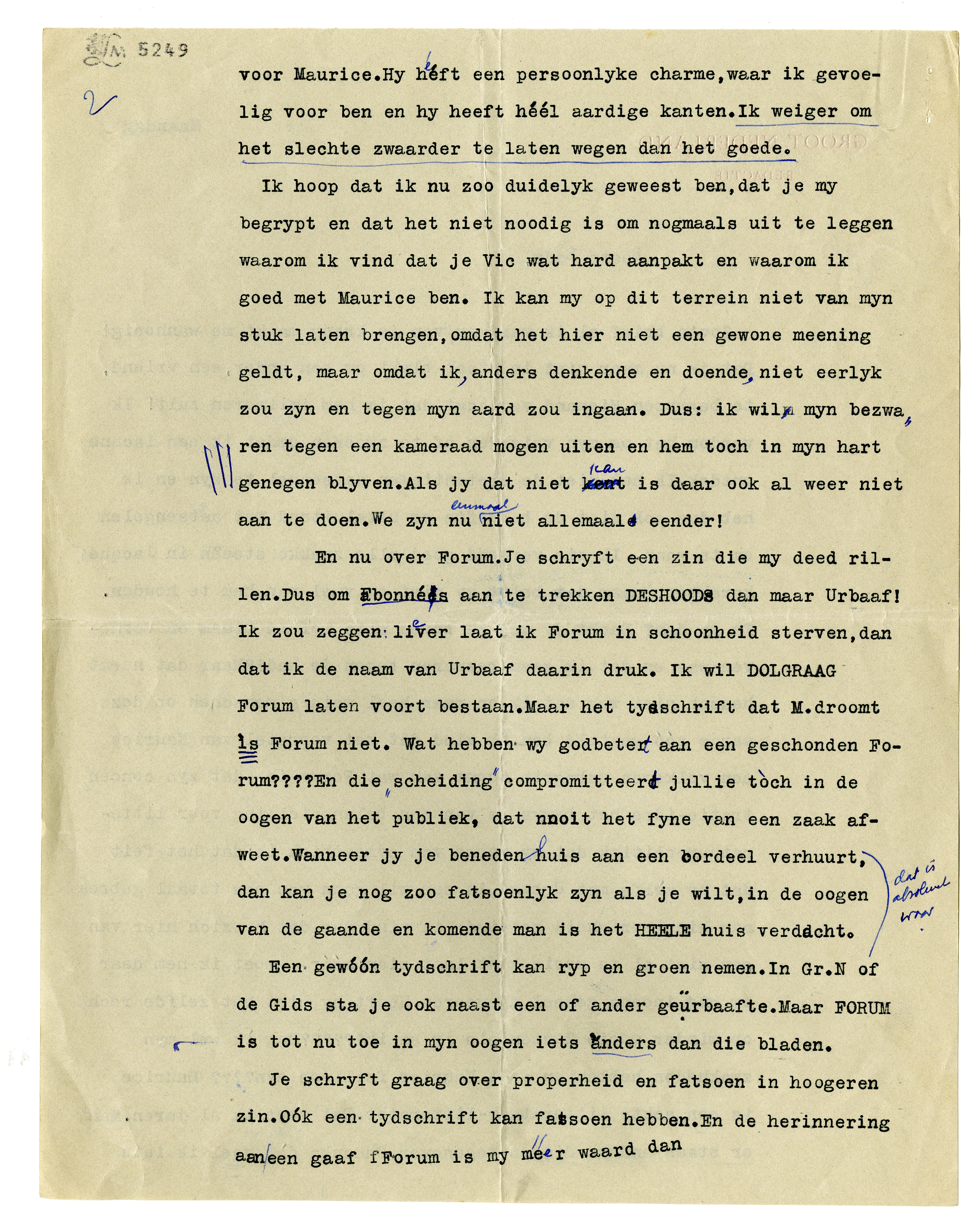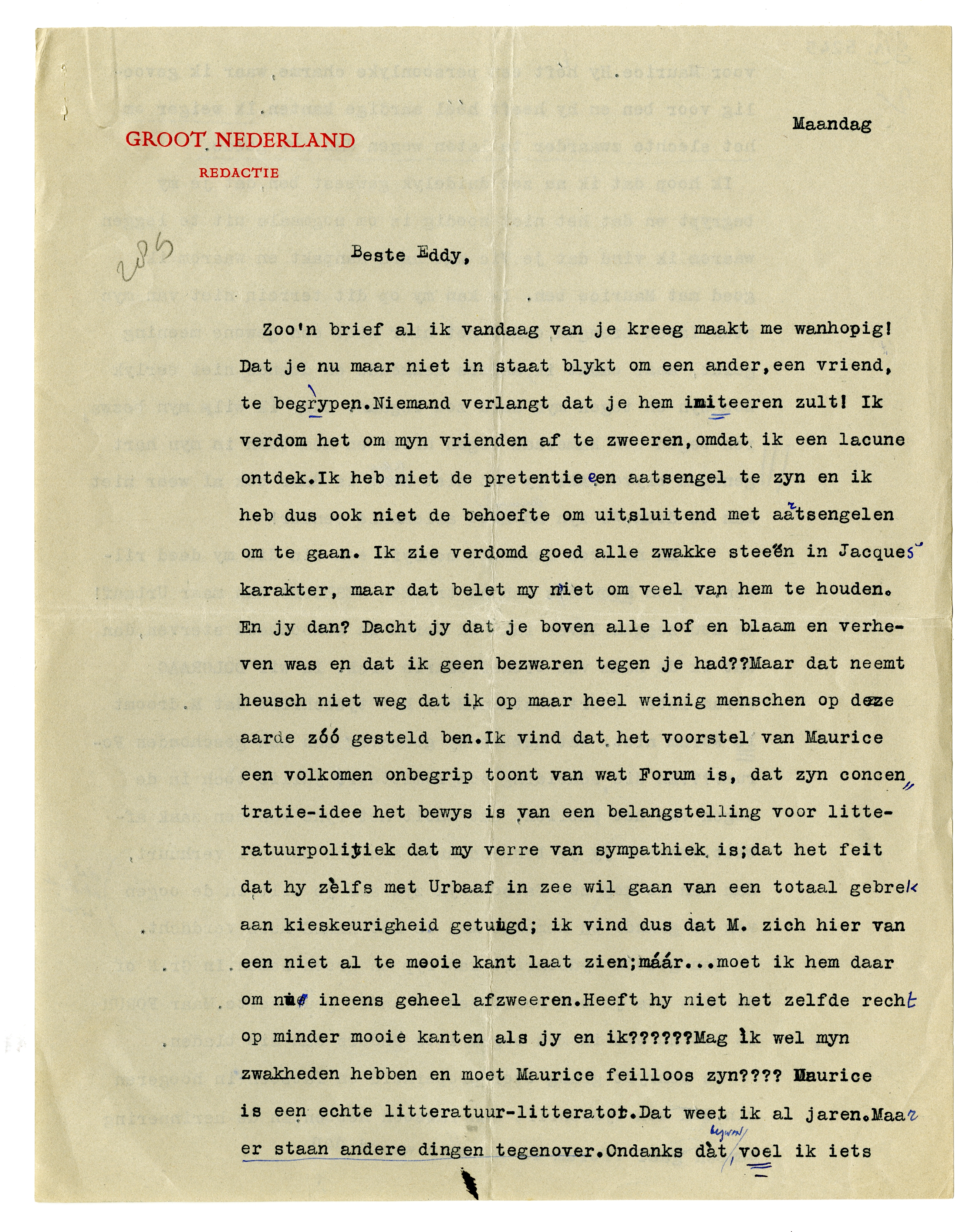 En jy dan? Dacht jy dat je boven alle lof en blaam en verheven was en dat ik geen bezwaren tegen je had?? Maar dat neemt heusch niet weg dat ik op maar heel weinig menschen op deze aarde zóó gesteld ben. Ik vind dat het voorstel van Maurice een volkomen onbegrip toont van wat Forum is, dat zyn concentratie-idee het bewys is van een belangstelling voor litteratuurpolitiek dat my verre van sympathiek is; dat het feit dat hij zèlfs met Urbaaf in zee wil gaan van een totaal gebrek aan kieskeurigheid getuigd; ik vind dus dat M. zich hier van een niet al te mooie kant laat zien; máár ...moet ik hem daar om nu ineens geheel afzweeren? Heeft hij niet hetzelfde recht op minder mooie kanten als jy en ik?????? Mag ik wel myn zwakheden hebben en moet Maurice feilloos zijn???? Maurice is een echte litteratuur-litterator. Dat weet ik al jaren. Maar er staan andere dingen tegenover. Ondanks dàt bezwaar, voel ik iets voor Maurice. Hy heeft een persoonlyke charme, waar ik gevoelig voor ben en hy heeft héél aardige kanten. Ik weiger om het slechte zwaarder te laten wegen dan het goede.