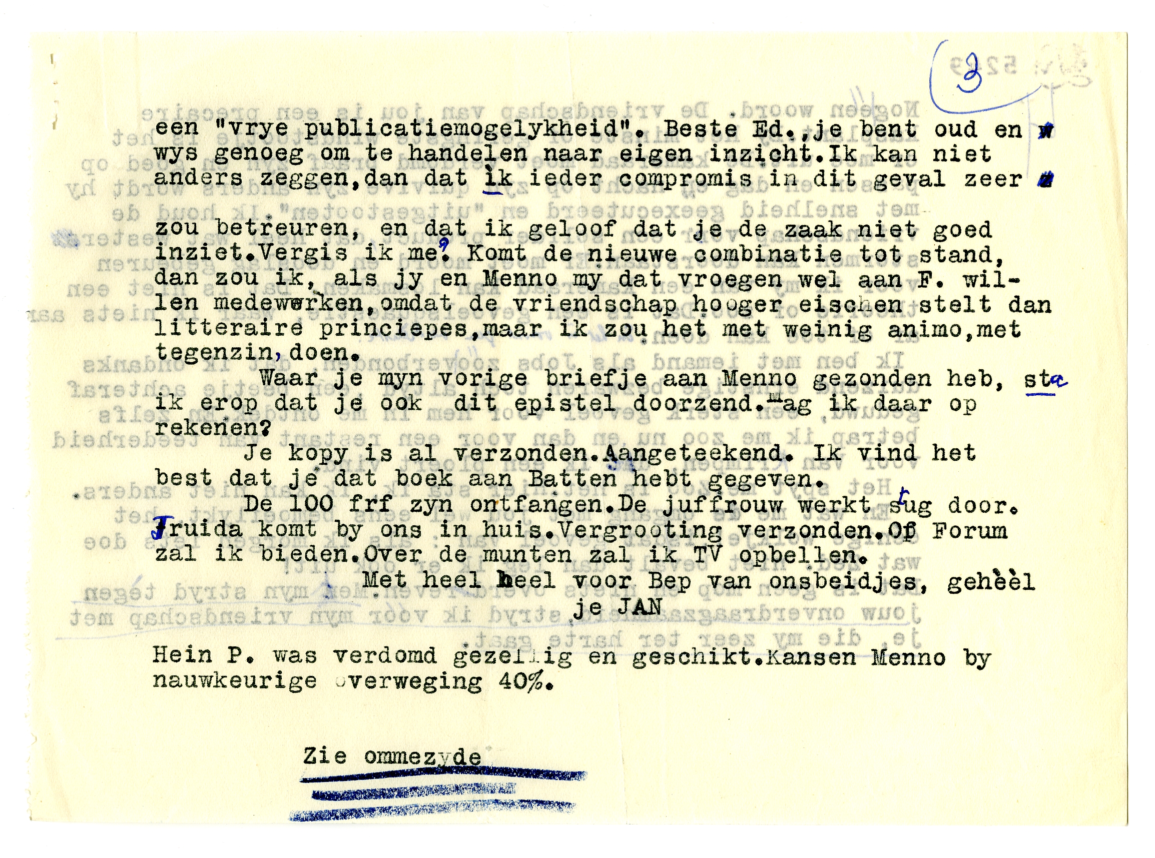 Je schryft graag over properheid en fatsoen in hoogeren zin. Oók een tydschrift kan fatsoen hebben. En de herinnering aan een gaaf Forum is my méér waard dan een ‘vrije publicatiemogelykheid’. Beste Ed. je bent oud en wys genoeg om te handelen naar eigen inzicht. Ik kan niet anders zeggen , dan dat ìk ieder compromis in dit geval zeer zou betreuren en dat ik geloof dat je de zaak niet goed inziet. Vergis ik me? Komt de nieuwe combinatie tot stand, dan zou ik, als jy en Menno my dat vroegen, wel aan F. willen medewerken, omdat de vriendschap hooger eischen stelt dan litteraire principes, maar ik zou het met weinig animo, met tegenzin, doen.