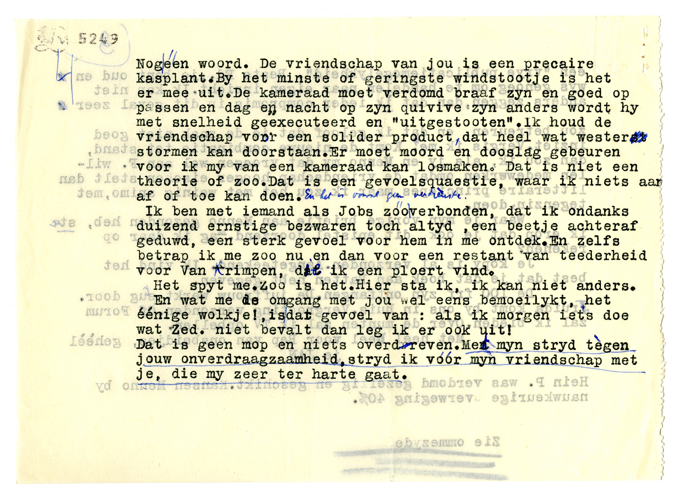 Nog één woord. De vriendschap van jou is een precaire kasplant. By het minste of geringste windstootje is het er mee uit. De kameraad moet verdomd braaf zyn en goed op passen en dag en nacht op zijn quivive zyn anders wordt hy met snelheid geëxecuteerd en ‘uitgestooten’. Ik houd de vriendschap voor een solider product, dat heel wat westerstormen kan doorstaan. Er moet moord en doodslag gebeuren voor ik my van een kameraad kan losmaken. Dat is niet een theorie of zoo. Dat is een gevoelsquaestie, waar ik niets af of toe kan doen. En het is vooral geen verdienste.
