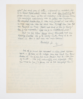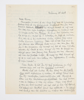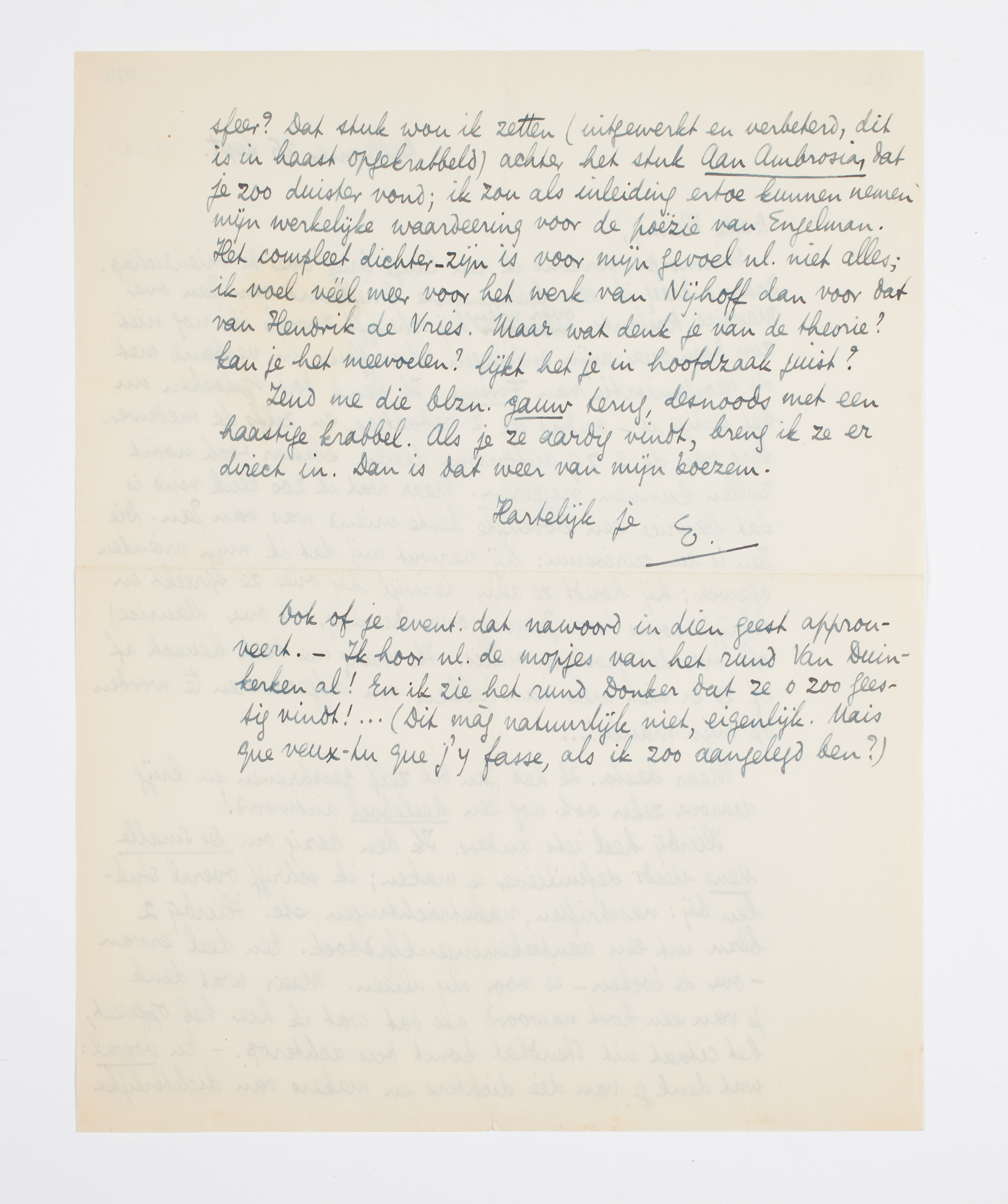 Hierbij heel iets anders. Ik ben bezig om De Smalle Mens steeds definitiever te maken; ik schrijf overal stukken bij: naschriften, nabetrachtingen, etc. Hierbij 2 blzn. uit een aanteekeningenkladboek. Een deel ervan - over de boeken - is voor mij alleen. Maar wat denk je van een kort nawoord2907 als dat wat ik hier heb opgezet, het citaat uit Stendhal komt dus achterop. - En vooral, wat denk je van die dichters en makers van dichterlijke sfeer? Dat stuk wou ik zetten (uitgewerkt en verbeterd, dit is in haast opgekrabbeld) achter het stuk Aan Ambrosia, dat je zoo duister vond; ik zou als inleiding ertoe kunnen nemen mijn werkelijke waardeering voor de poëzie van Engelman. Het compleet dichter-zijn is voor mijn gevoel nl. niet alles; ik voel véél meer voor het werk van Nijhoff dan voor dat van Hendrik de Vries. Maar wat denk je van de theorie? kan je het meevoelen? lijkt het je in hoofdzaak juist?