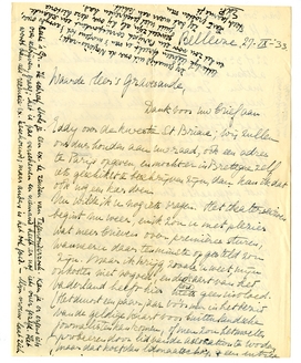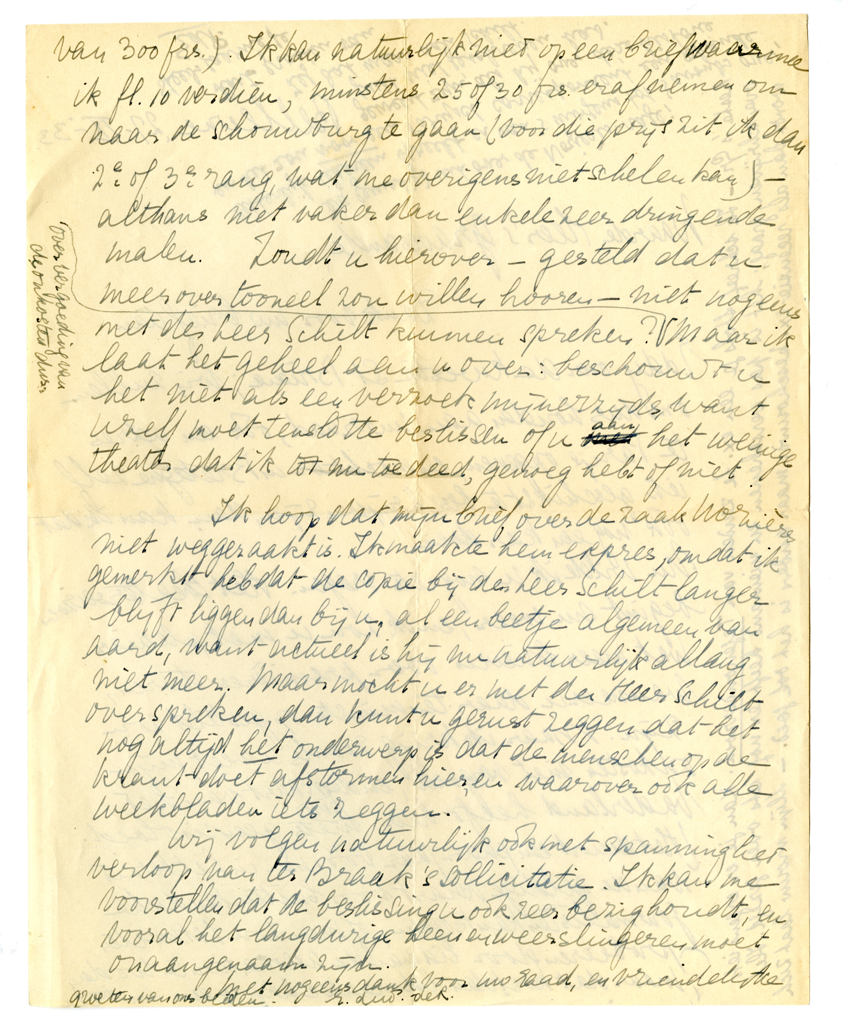 Nu wilde ik u nog iets vragen. Het theaterseizoen begint nu weer, en ik zou u met plezier wat meer brieven over premières sturen, wanneer u daar tenminste op gesteld zou zijn. Maar ik krijg, zooals u weet, mijn onkosten niet vergoed, en de perskaart van het Vaderland heeft hier niets geen invloed. (Het duurt een paar jaar vóór men in het bezit van de geldige kaart voor buitenlandsche journalisten kan komen, of men zou het moeten probeeren door lid van de Association te worden, maar dat kost dan lidmaatschap + een entrée van 300 frs.). Ik kan natuurlijk niet op een brief waarmee ik fl.10 verdien, minstens 25 of 30 frs. eraf nemen om naar de schouwburg te gaan (voor die prijs zit ik dan 2e of 3e rang, wat me overigens niet schelen kan) - althans niet vaker dan enkele zeer dringende malen. Zoudt u hierover - gesteld dat u meer over tooneel zou willen hooren - niet nog eens met den heer Schilt kunnen spreken? Over vergoeding van de onkosten dus. Maar ik laat het geheel aan u over: beschouwt u het niet als een verzoek mijnerzijds, want uzelf moet tenslotte beslissen of u aan het weinige theater dat ik tot nu toe deed, genoeg hebt of niet.